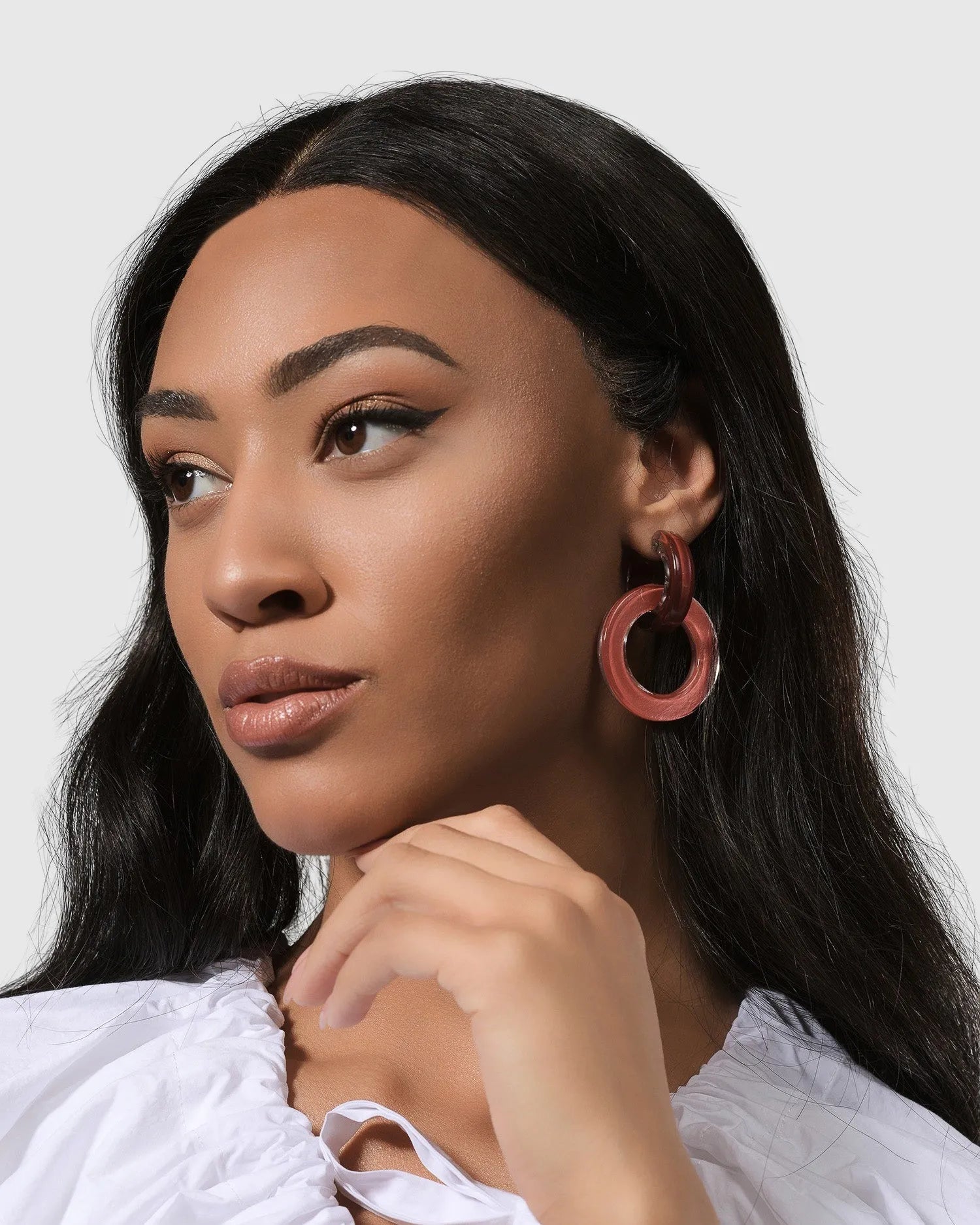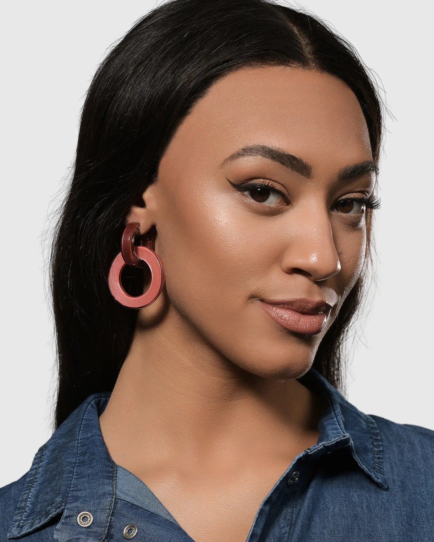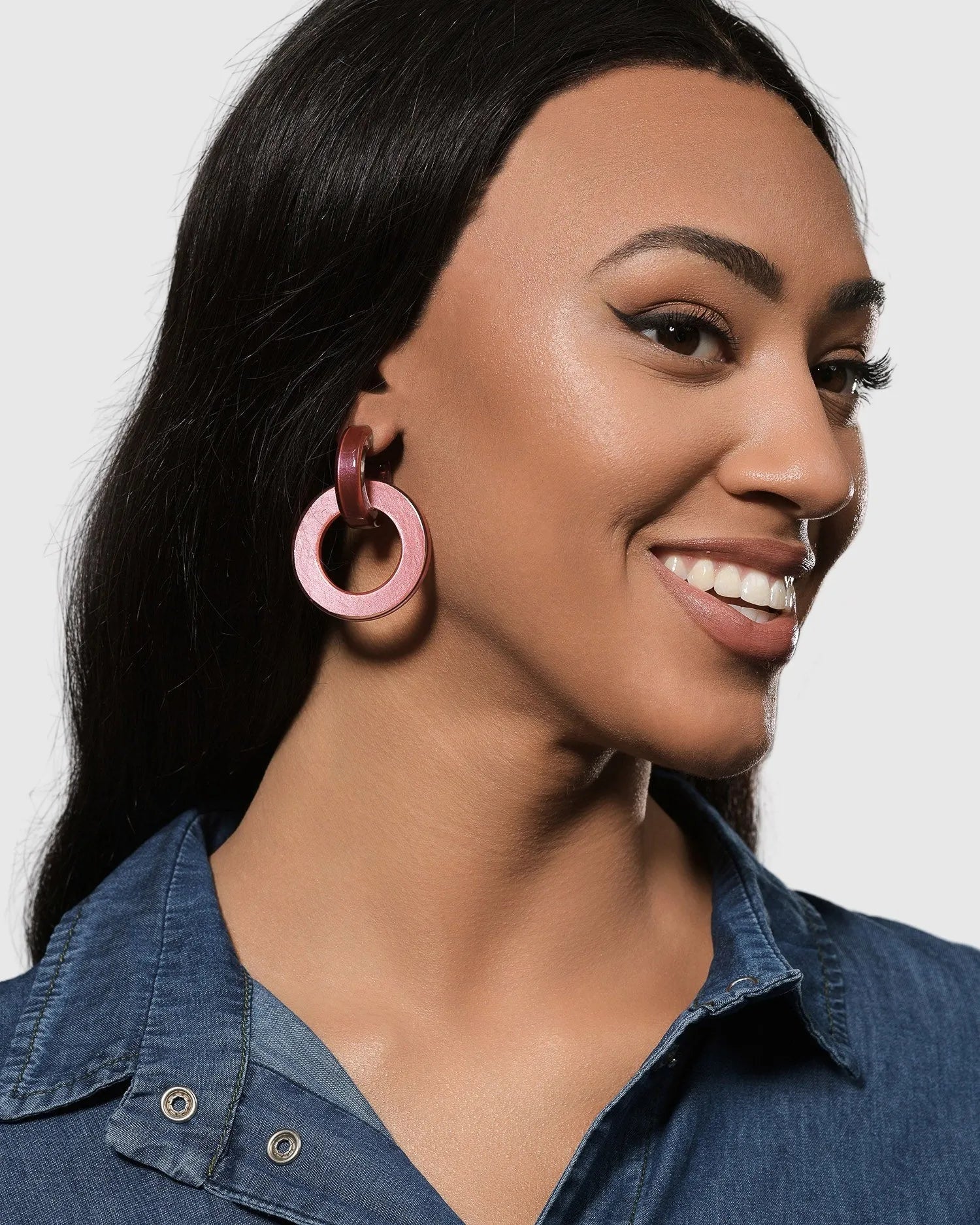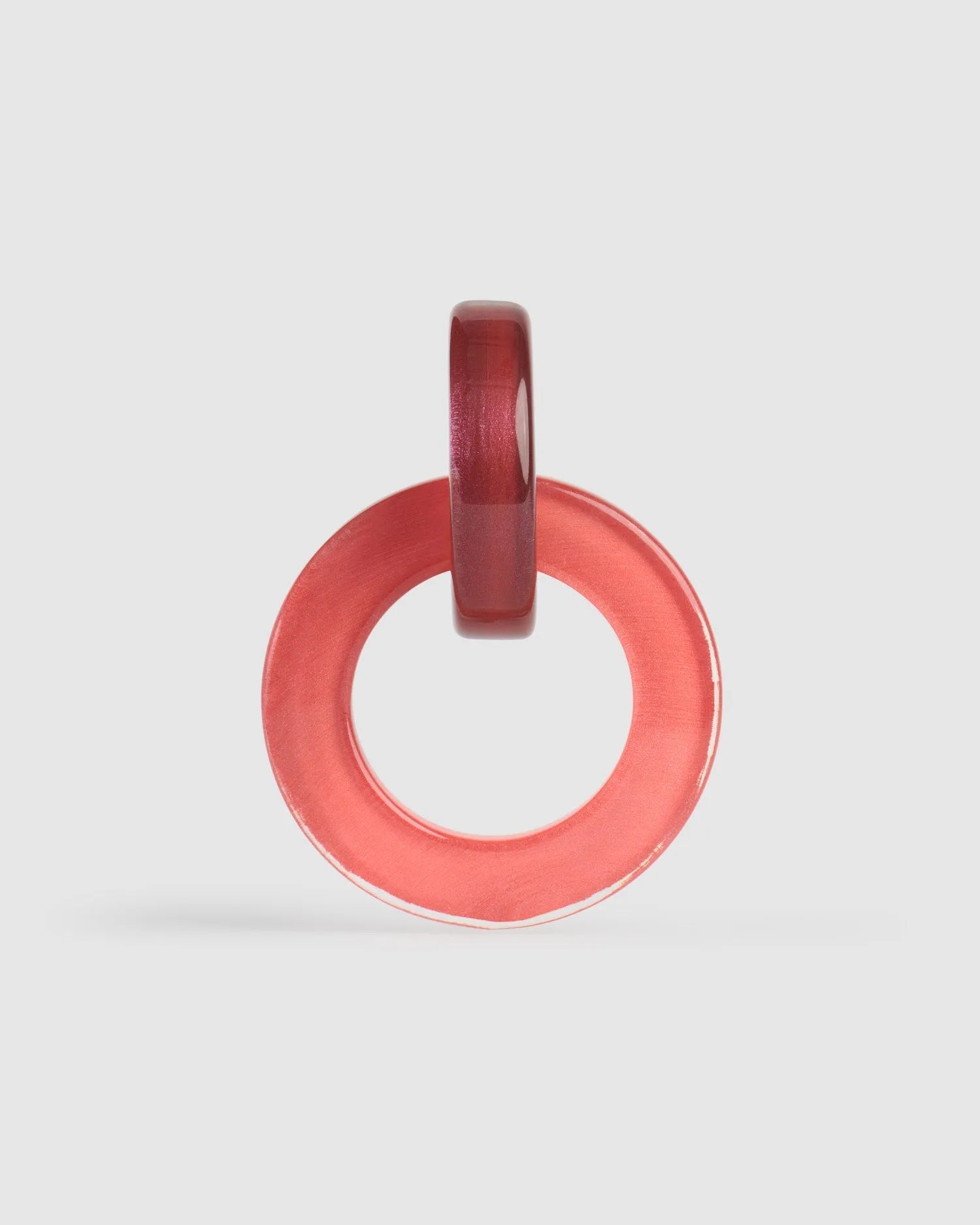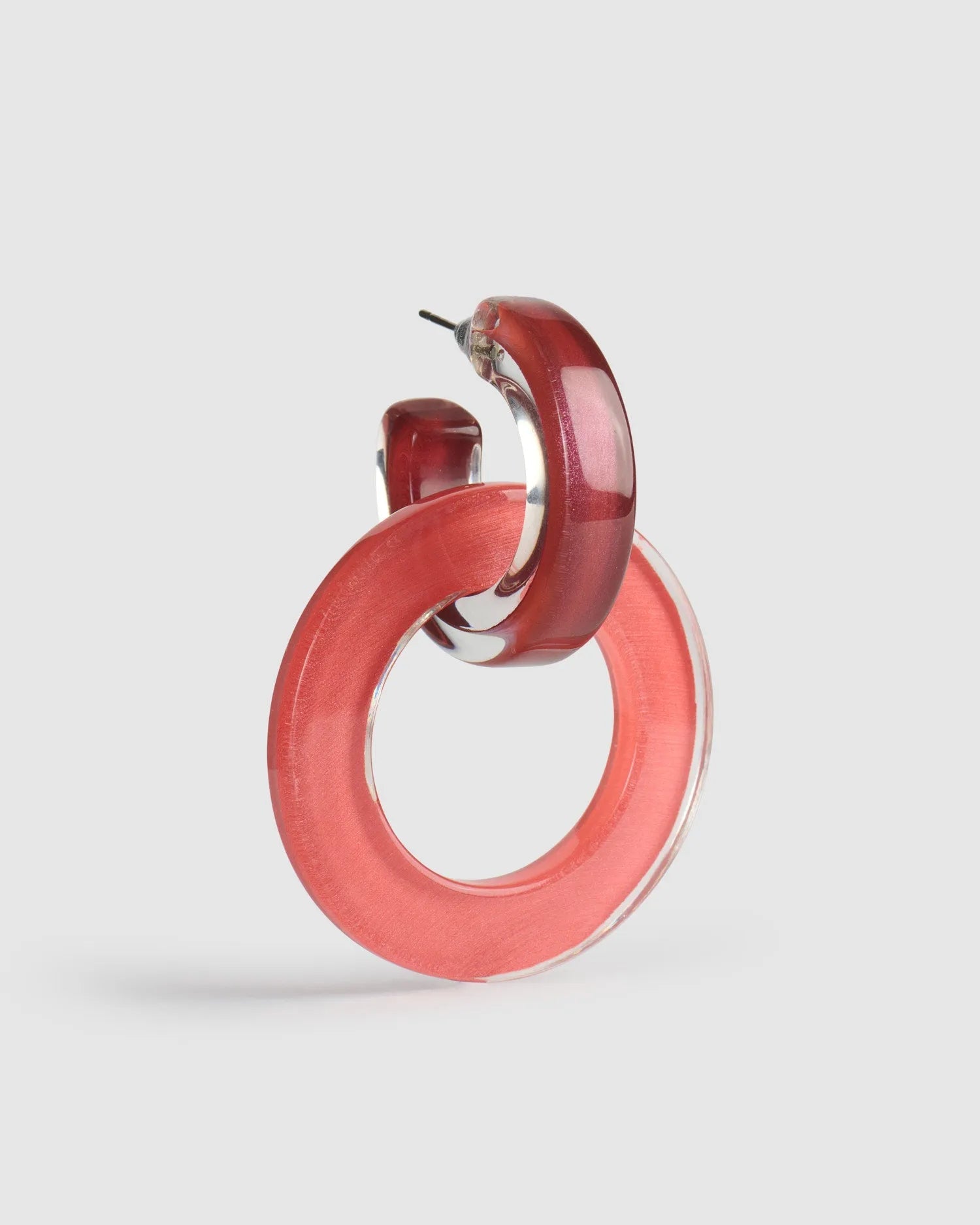 Add a pop of color with these double-circle dangle earrings in a glossy coral. They're sure to take any pair of regular hoops to another level. Our collection is meticulously hand-crafted in a special process with Resin, making each piece truly one-of-a-kind. Pair it with the Circle Bangle in Coral for a little extra wrist candy.
