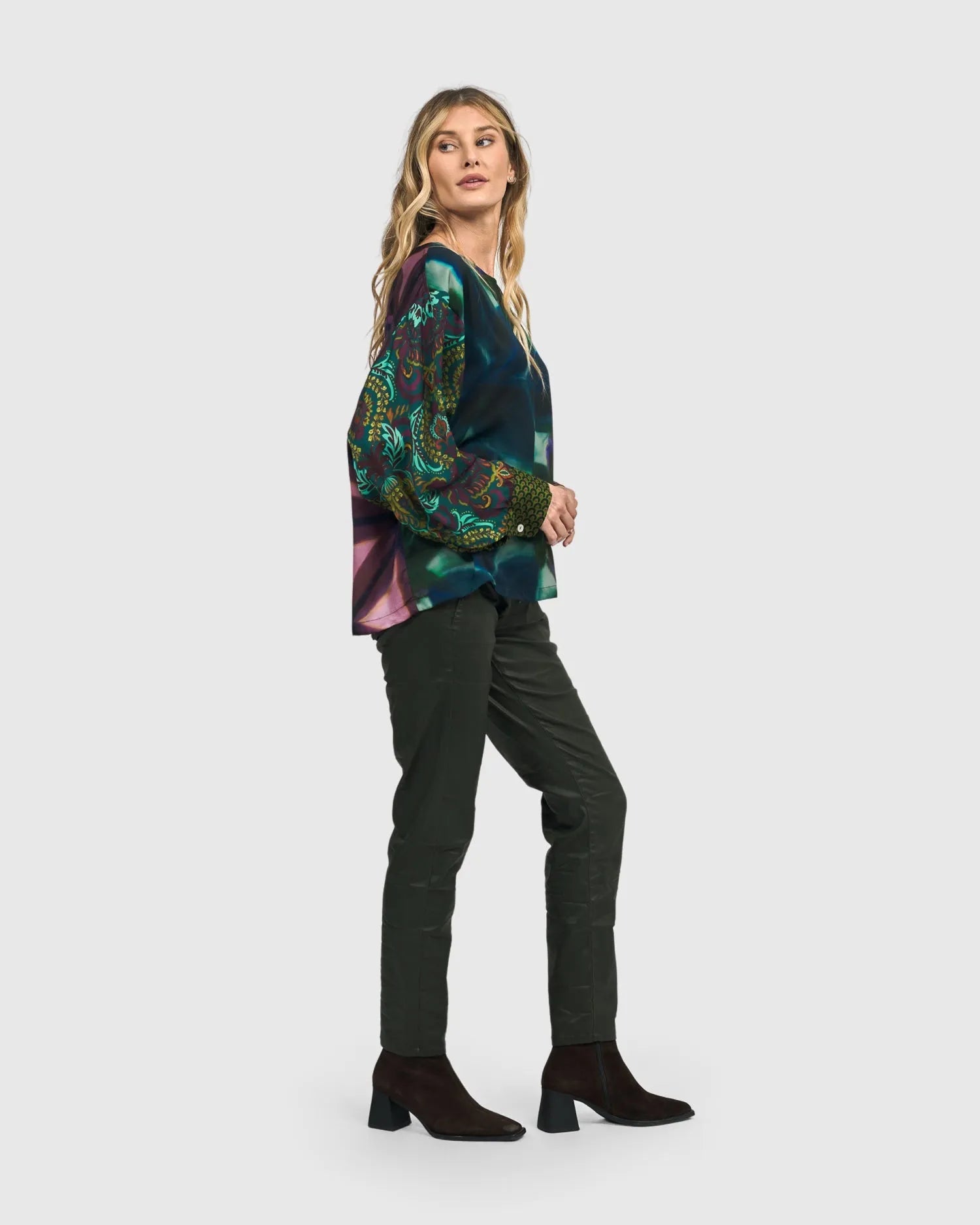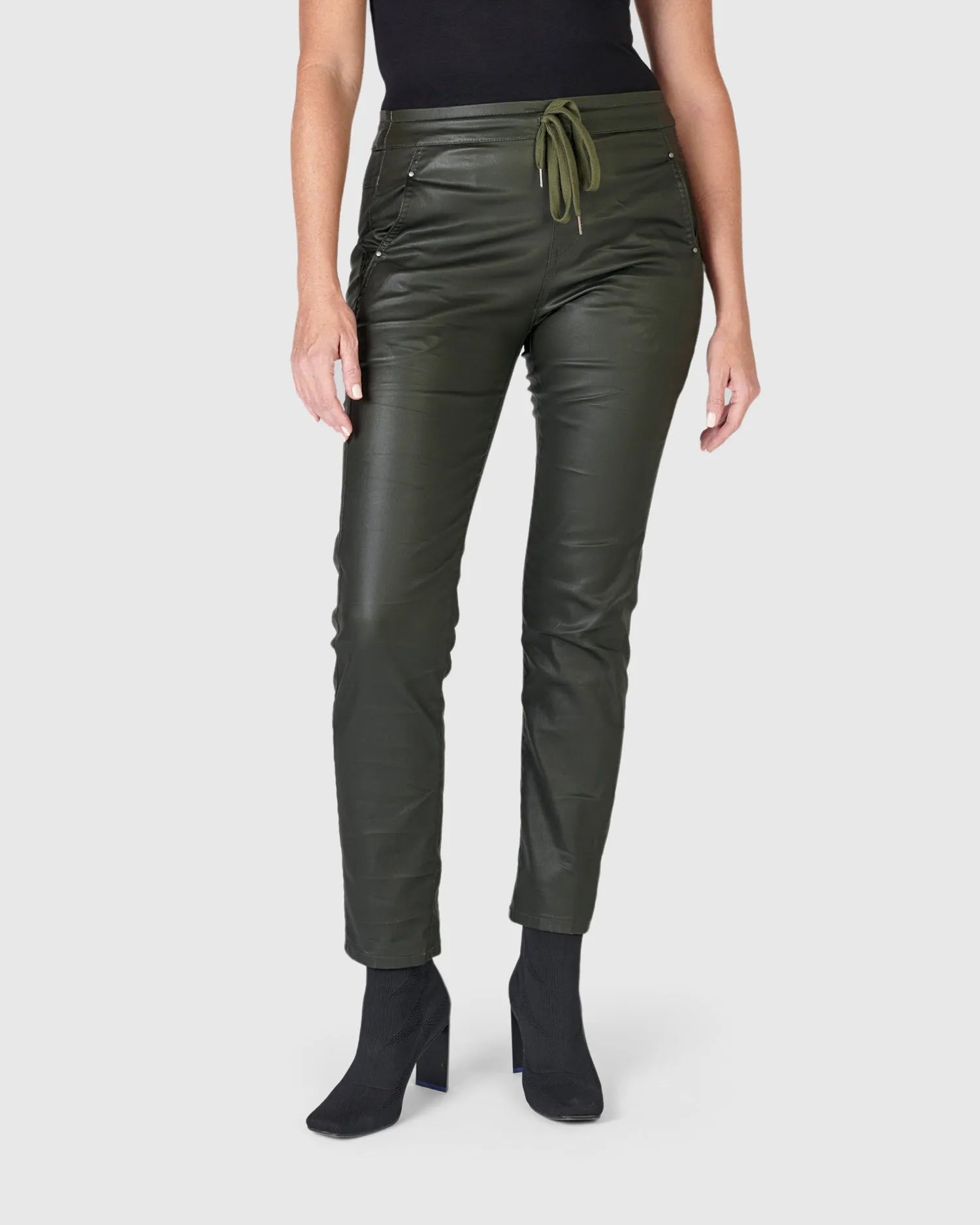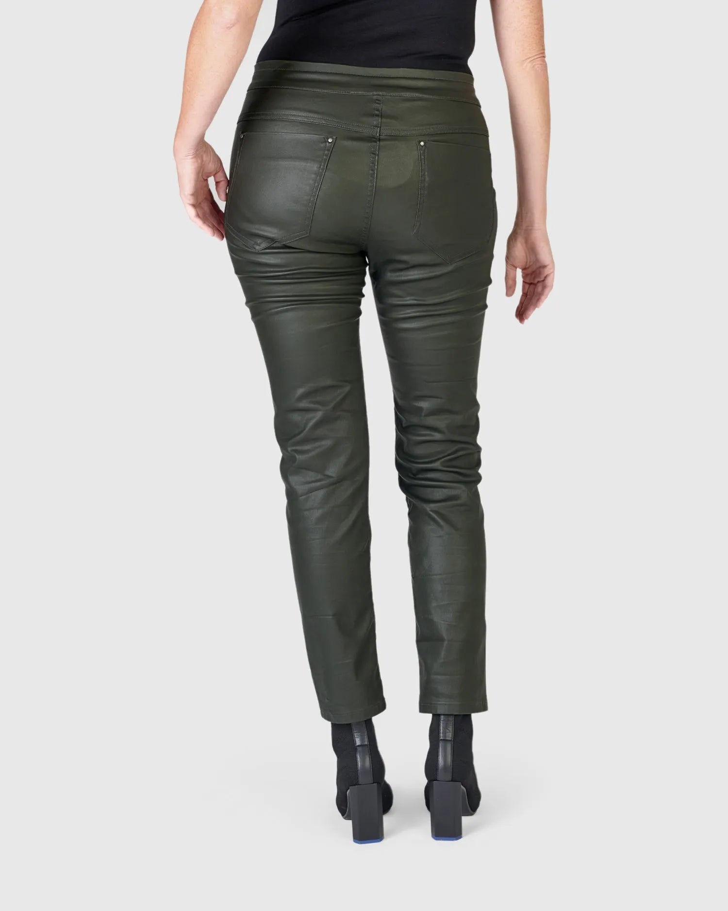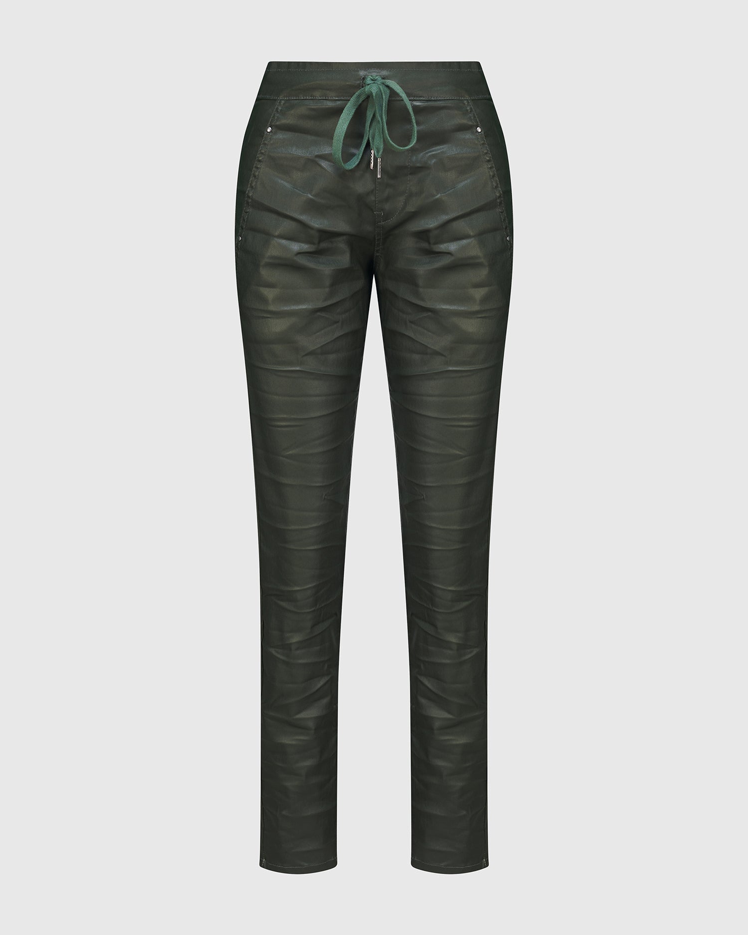 You'll rock these ultra-cool jeans day-after-day. Our favorite jeans in slick forest green are rendered in a coated stretchy cotton blend. Thanks to a flattering mid-rise waist and a more relaxed taper than skinny jeans, our beloved Iconics never feel skin-tight; just deliciously comfy. Drawstring stretch waist, mock fly, side pockets, yoked back with patch pockets, and rivet trim.
