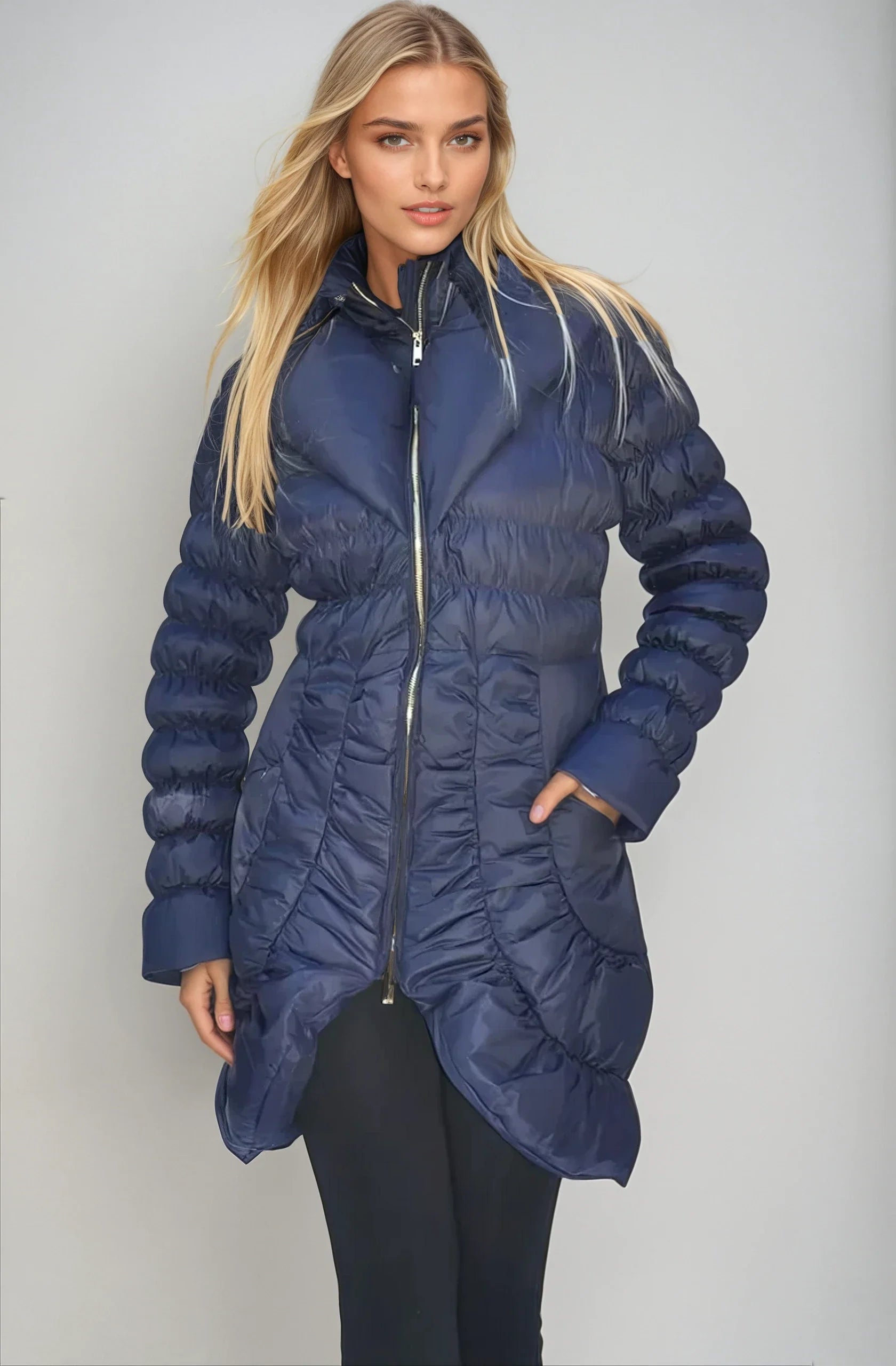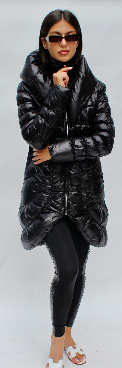 It would be hard - dare we say impossible to find a puffer coat as stylish and sophisticated as this. The dramatic shawl collar stands up close to the neck in lieu of a scarf. And its shape is enhanced by a curved front hem, streamlined ruffled back, Features front zip and Falls right by Knee.