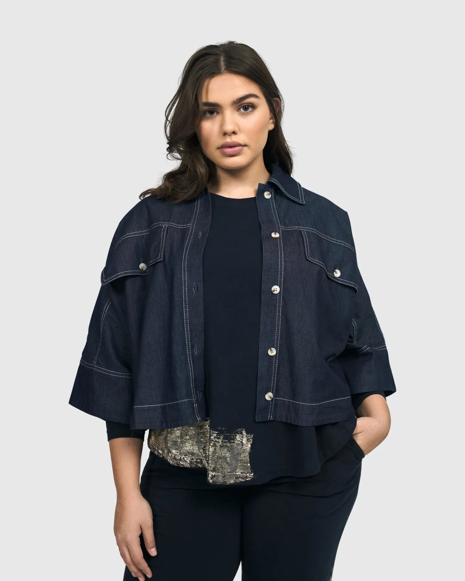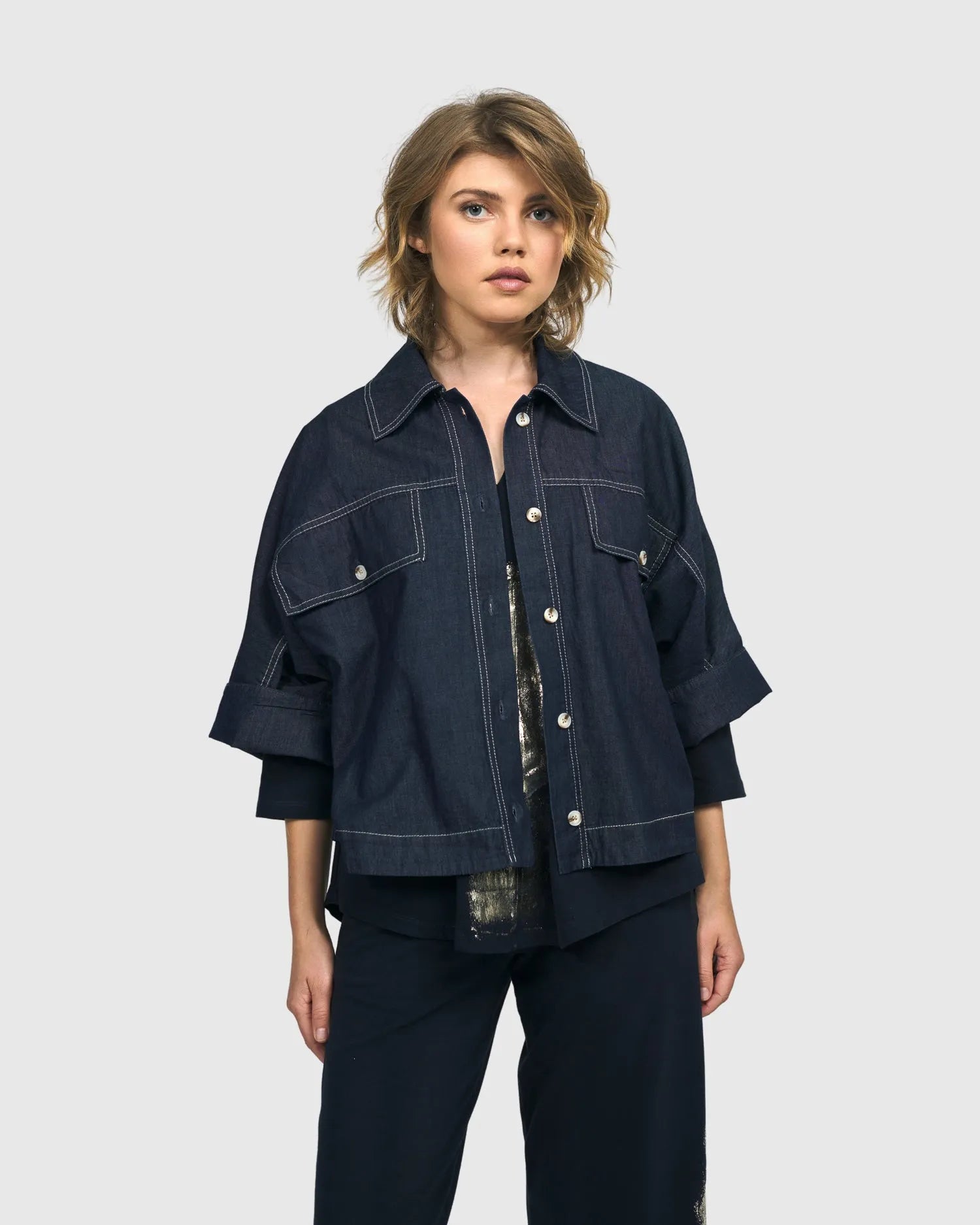 This boxy shirt jacket is a great option to wear as the main event or as a lightweight layer. Foldover collar, full button placket with shell buttons, faux front patch pockets and elbow-length dolman cuffed sleeves. Structured white seam detailing as an homage to a classic western look.
