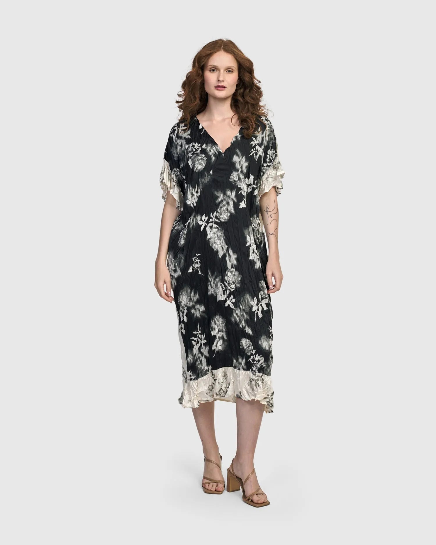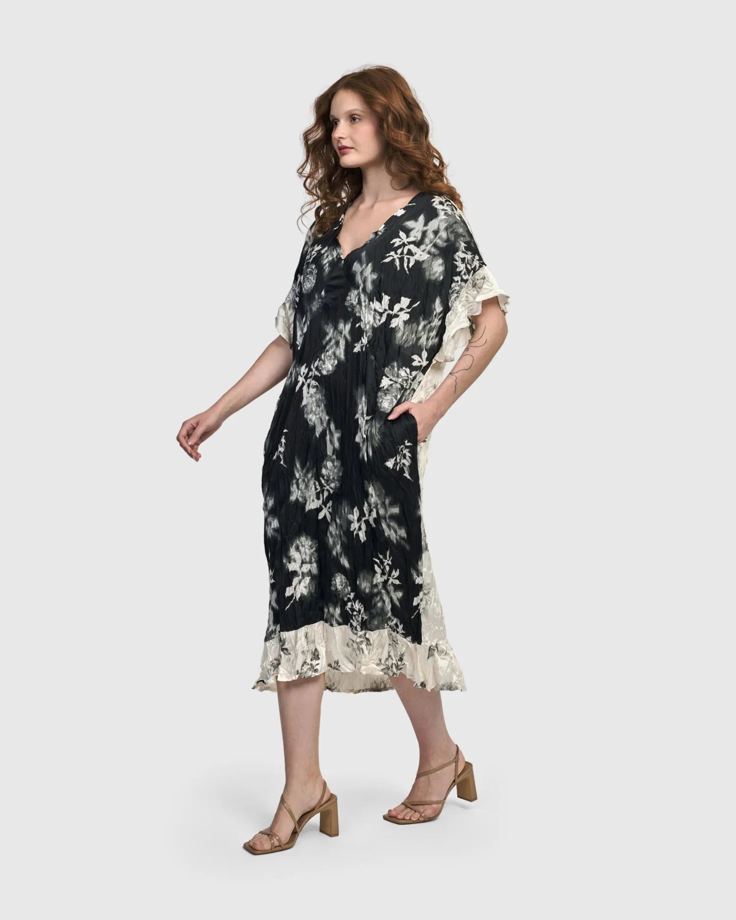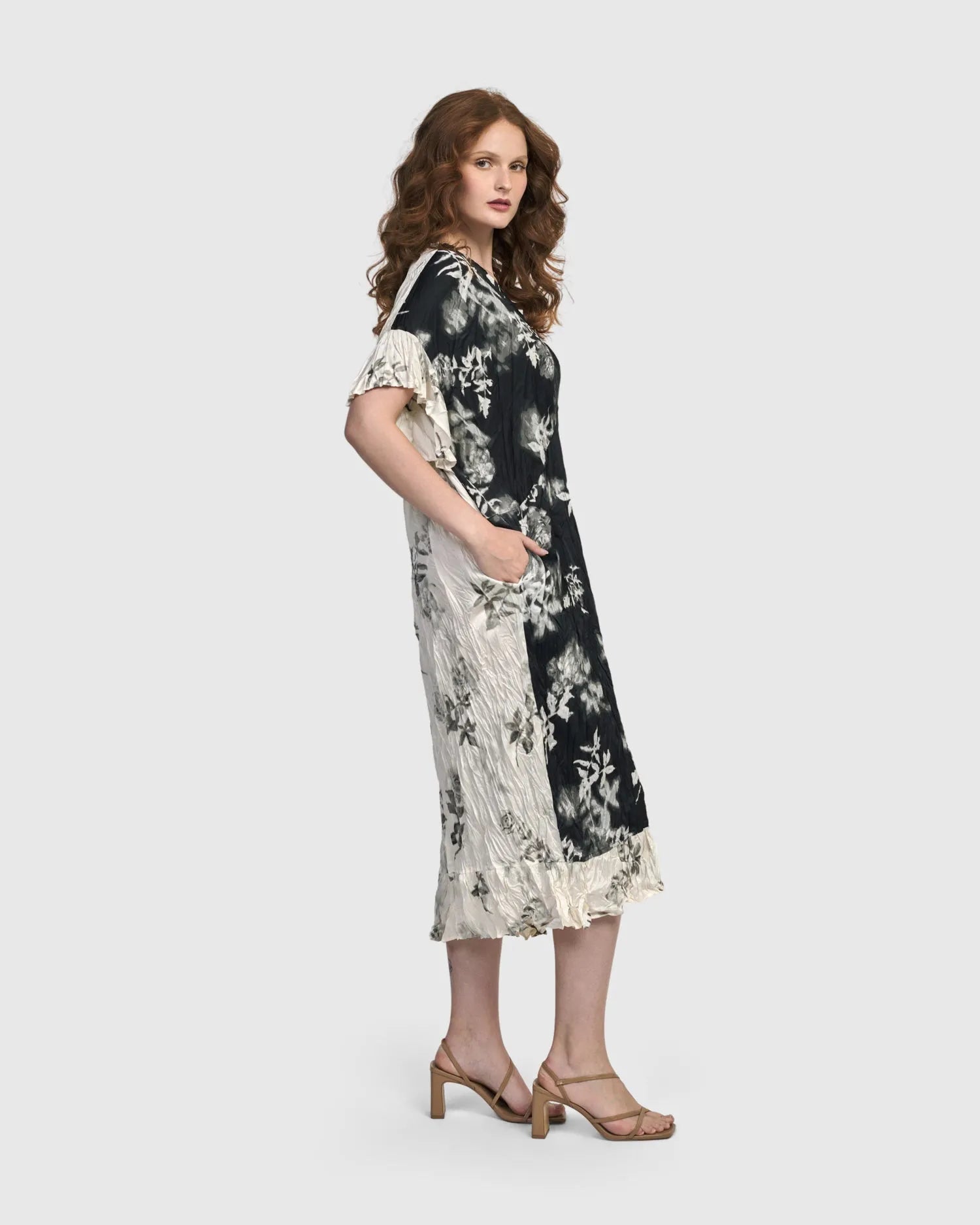 Whether you dress it up or down, this relaxed midi dress channels 1920s flapper energy: it has a wide V-neck, side pockets, elbow length ruffled sleeves and hem, and opposite front-to-back color pattern.