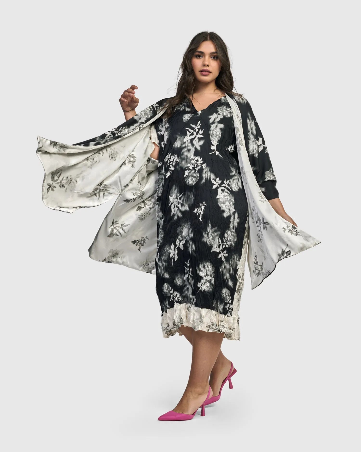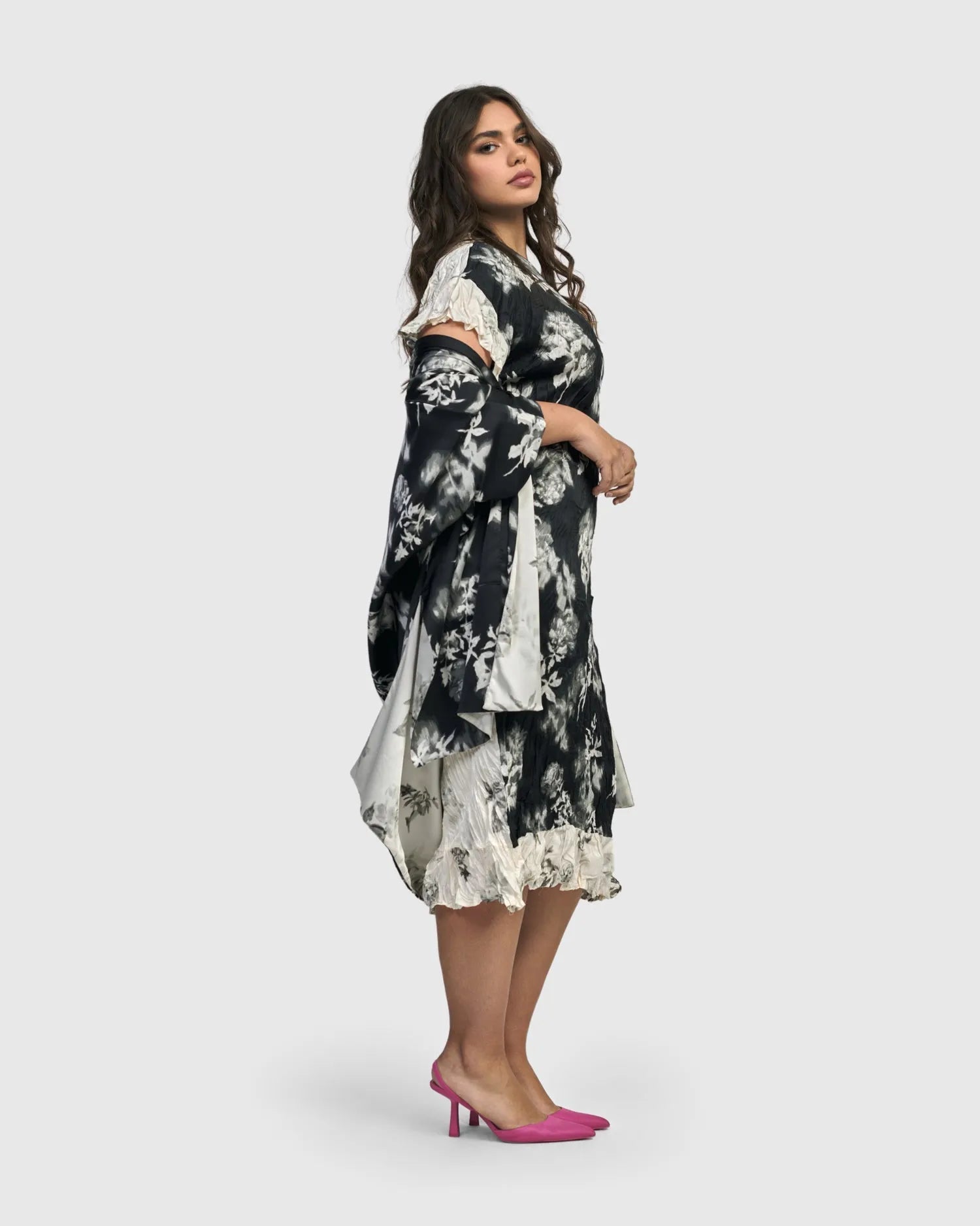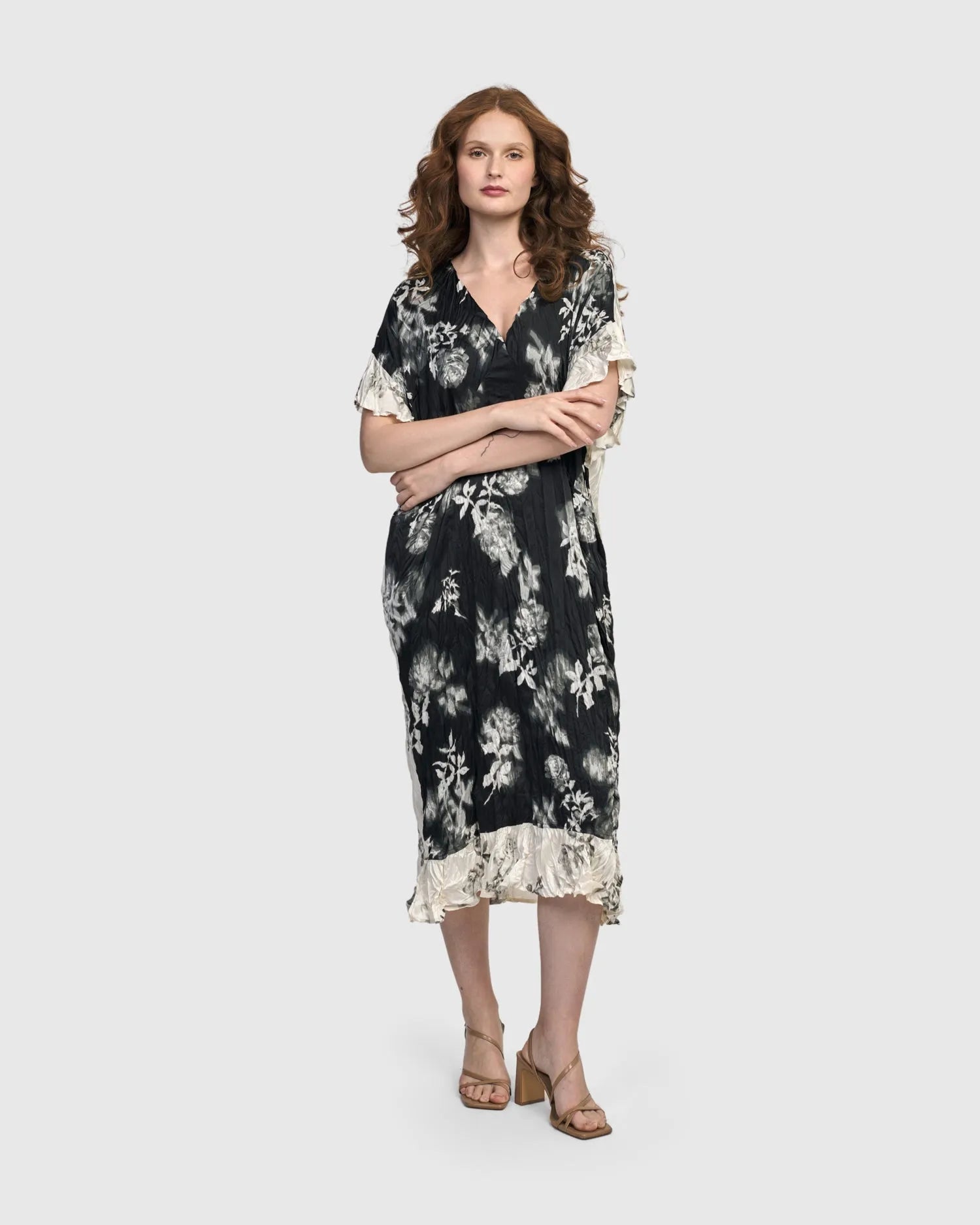 Whether you dress it up or down, this relaxed midi dress channels 1920s flapper energy: it has a wide V-neck, side pockets, elbow length ruffled sleeves and hem, and opposite front-to-back color pattern.