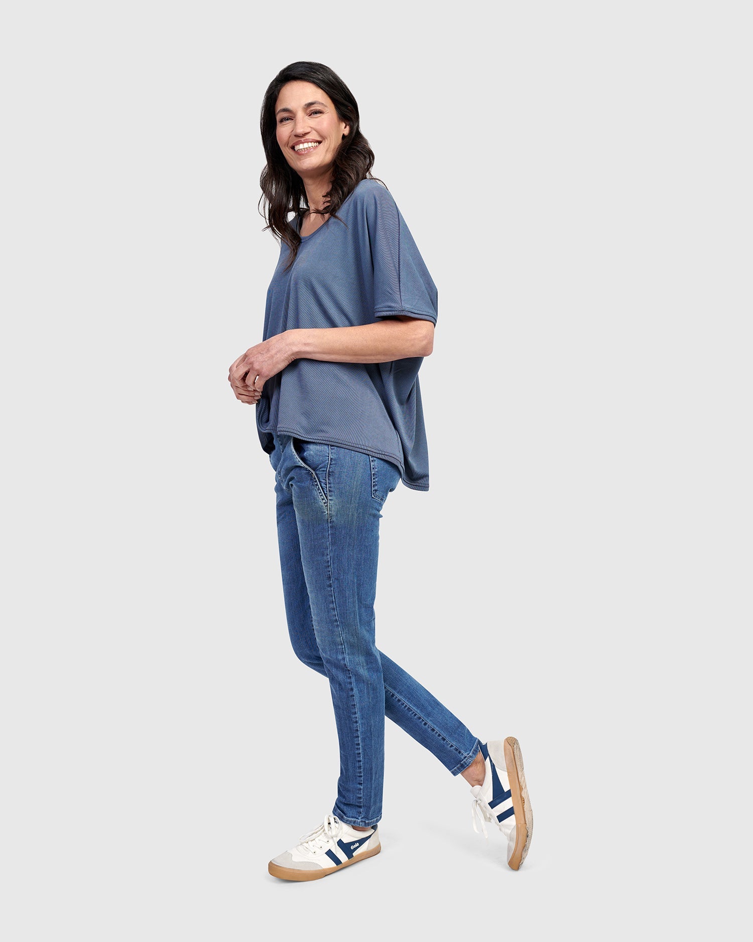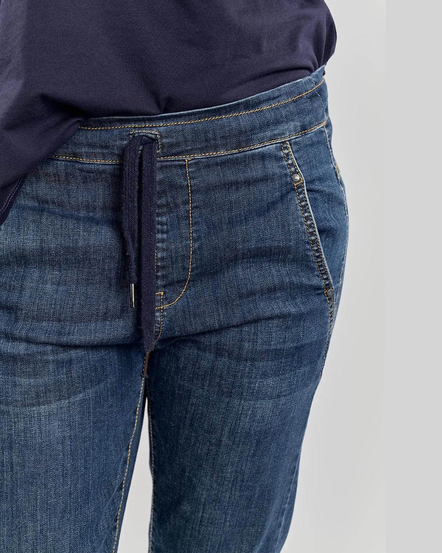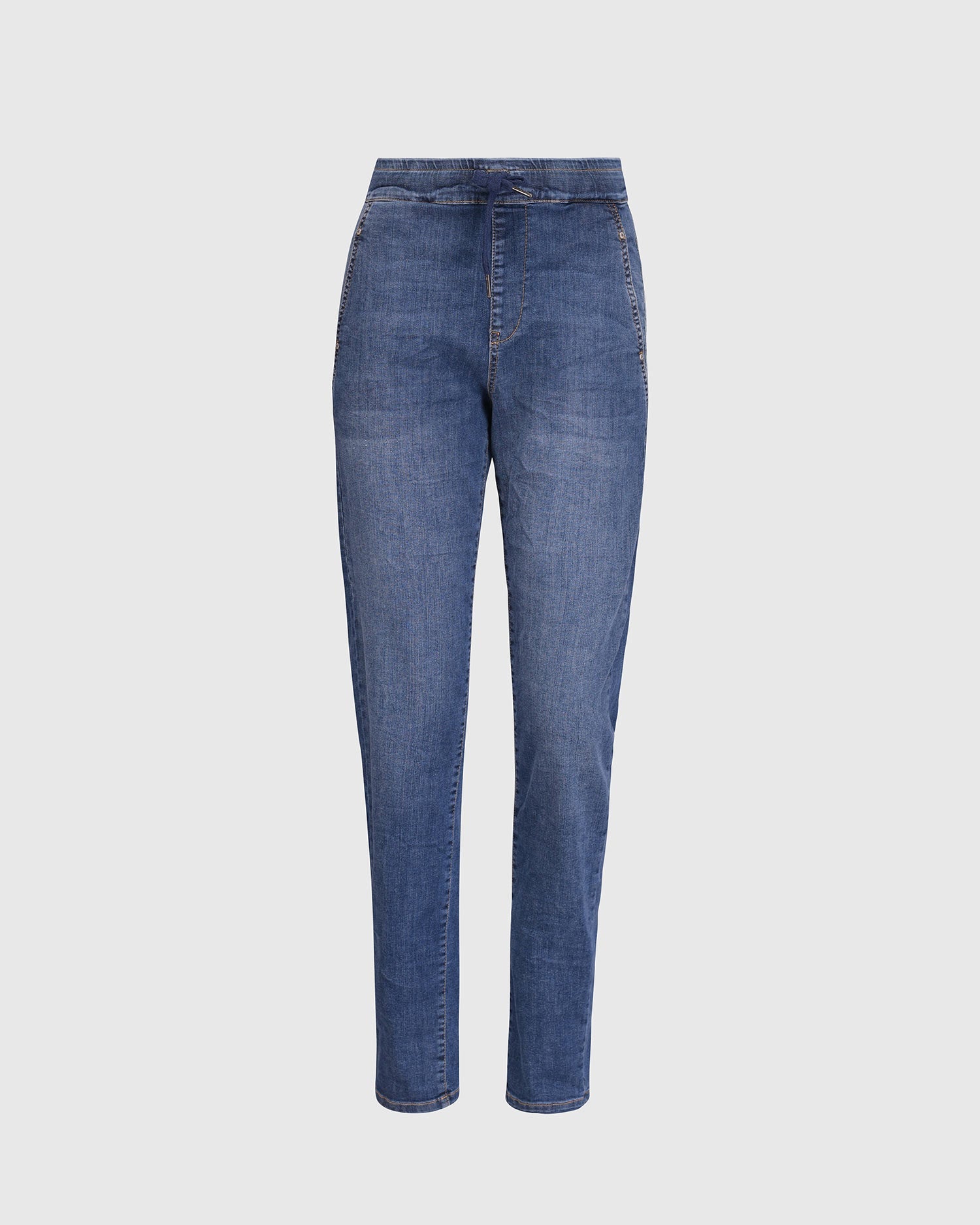 Our must-have cult favorite in medium wash, soft, stretch cotton denim for an amazing fit. Our Missy and Plus size jeans offer a universally flattering mid-rise waist and a more relaxed taper than skinny jeans. Adjustable drawstring stretch waist, mock fly, angled side pockets, yoked back with patch pockets, and rivet trim.