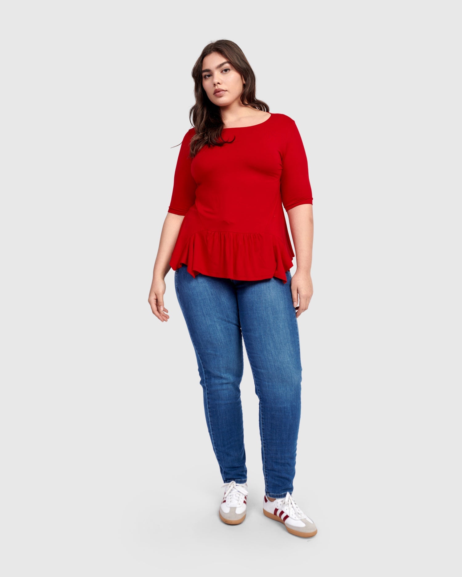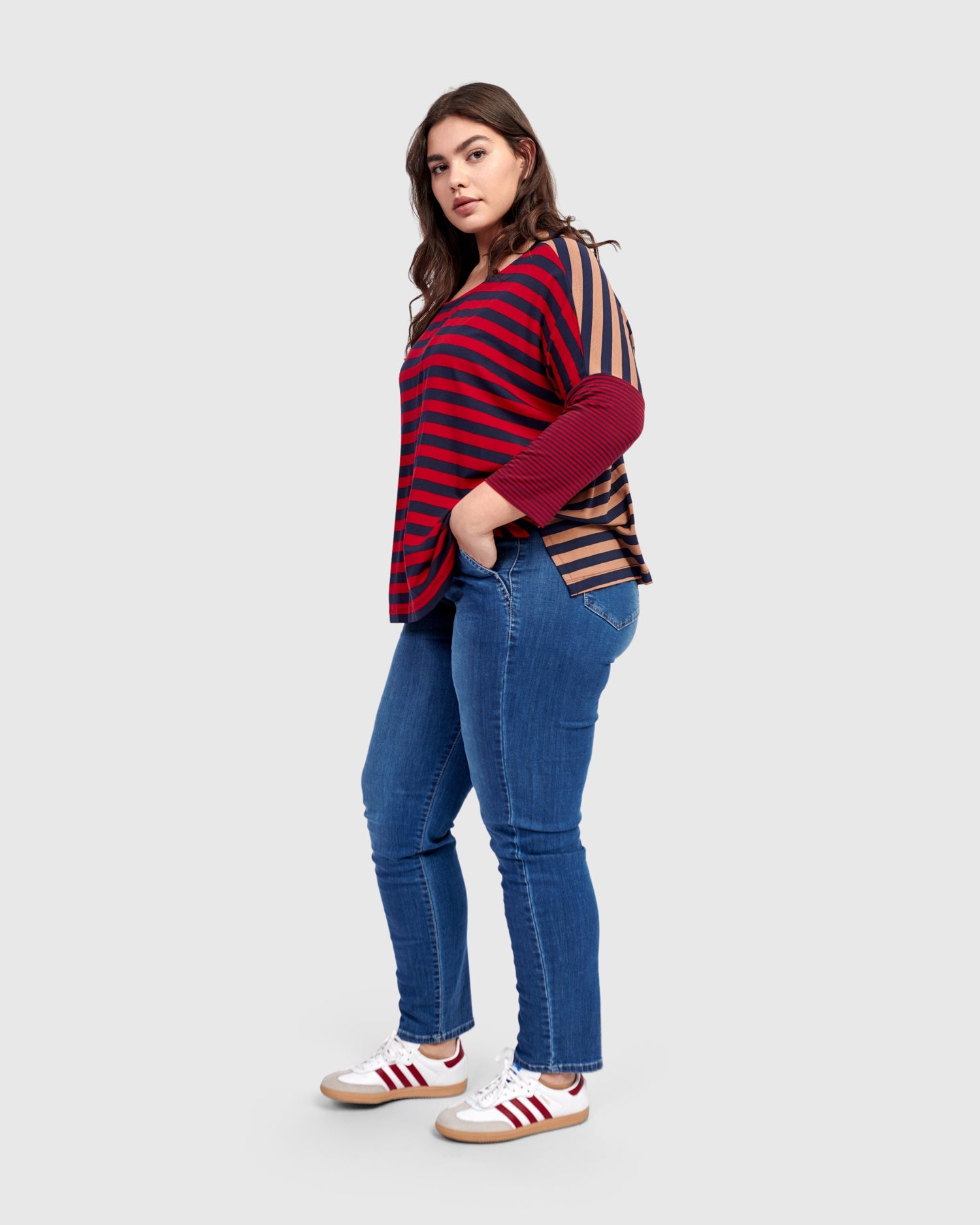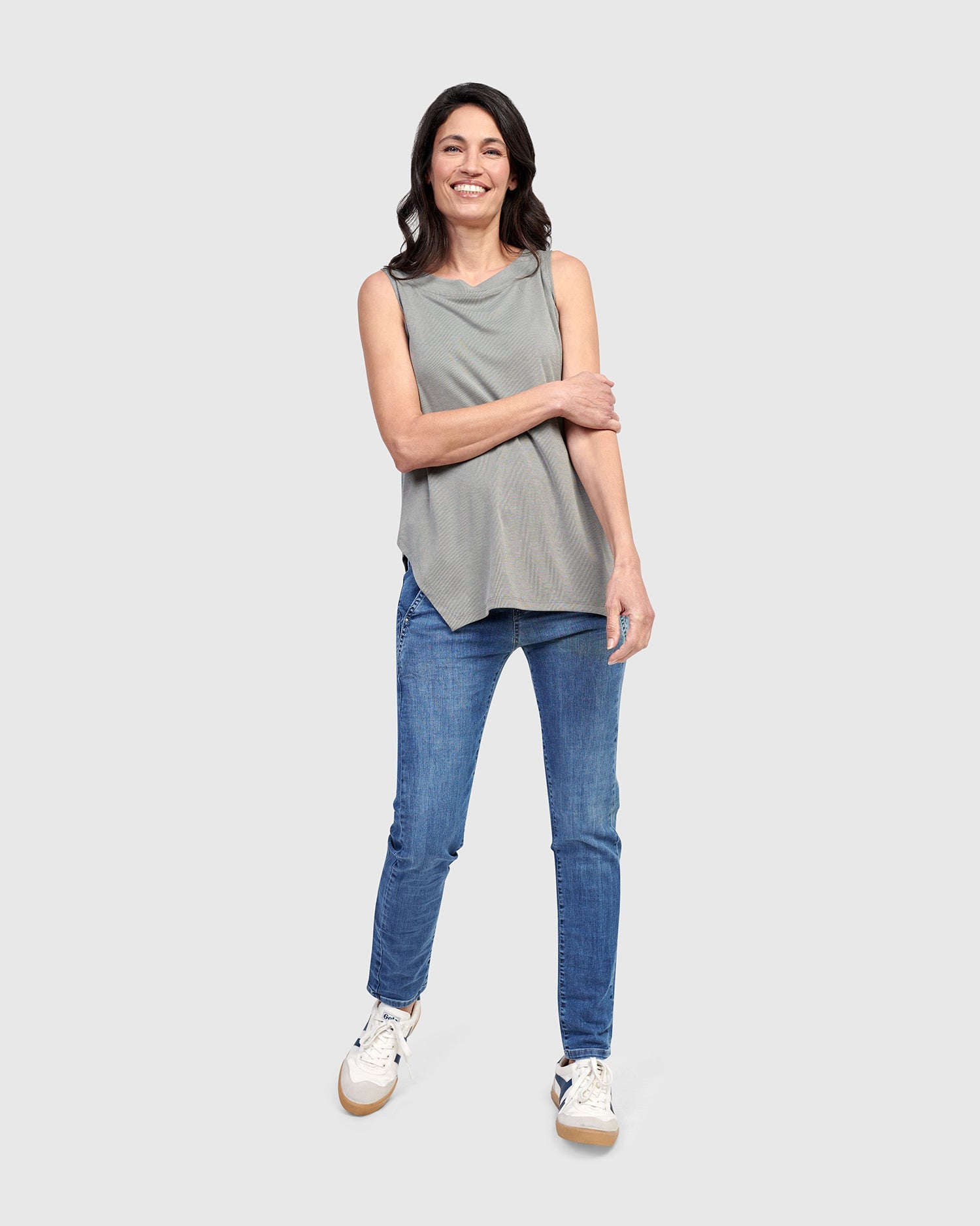 Our must-have cult favorite in medium wash, soft, stretch cotton denim for an amazing fit. Our Missy and Plus size jeans offer a universally flattering mid-rise waist and a more relaxed taper than skinny jeans. Adjustable drawstring stretch waist, mock fly, angled side pockets, yoked back with patch pockets, and rivet trim.