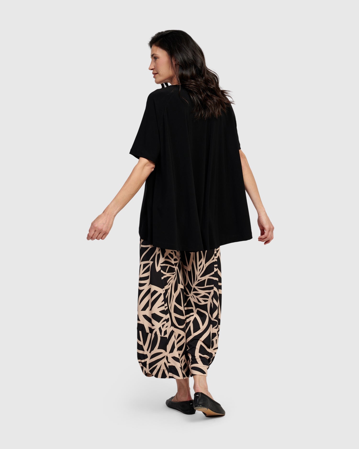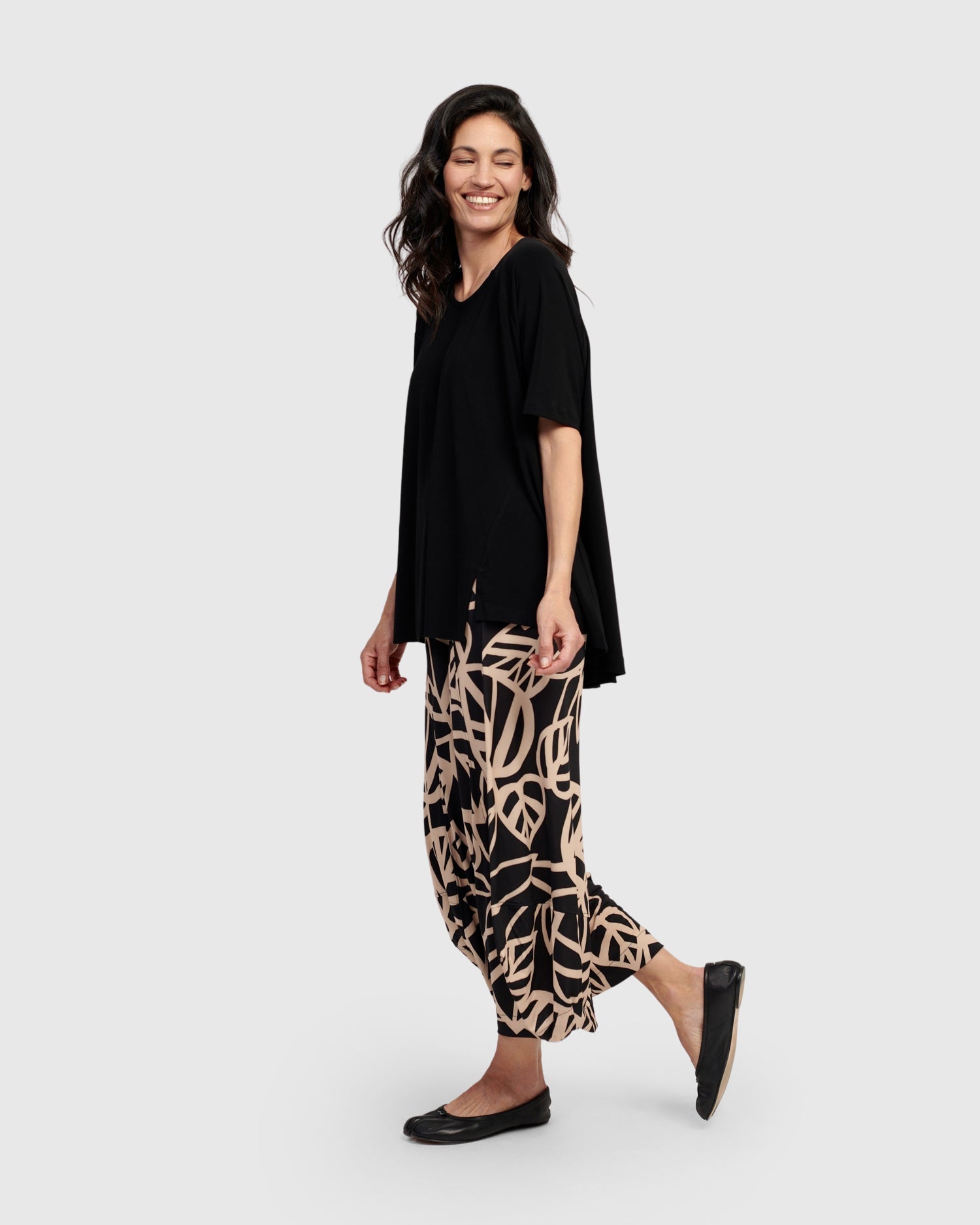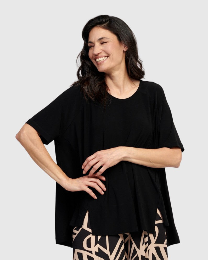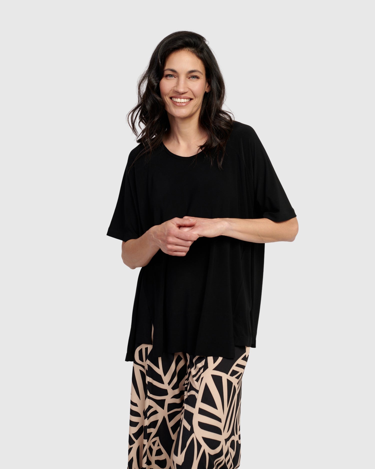 This elevated essential is made in a matte slinky jersey knit. A take on our classic Trapeze Top, it has a scoop neck, short sleeves, a round hem that falls longer in back, plus notched bias-cut sides in front. Oversized fit with an A-line silhouette