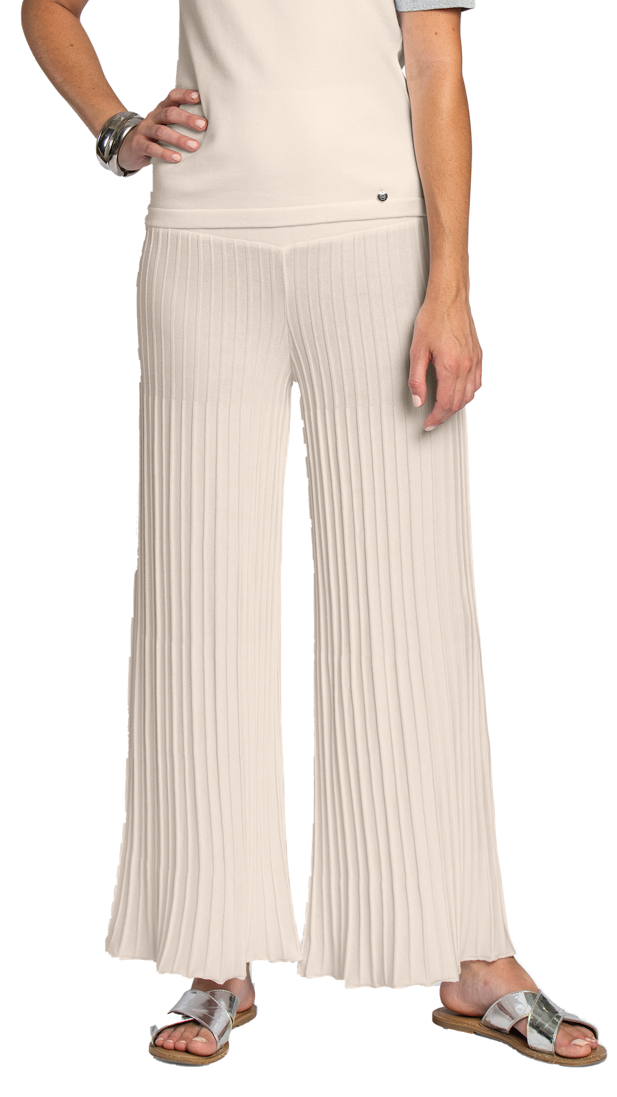 Best Seller: Wide leg wave-knit plisse-look pants with a wide flat-knit panel at waist and an elastic waist band; Full length; Viscose blend; Sustainable yarn