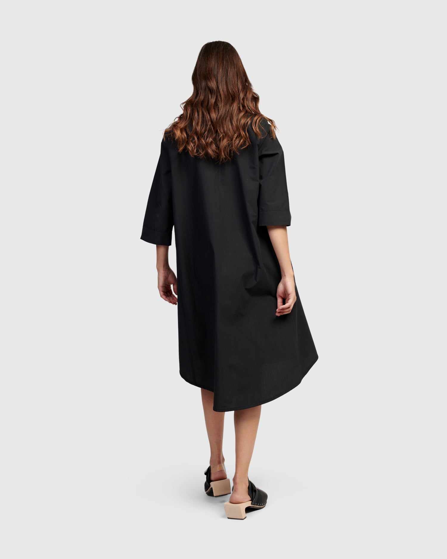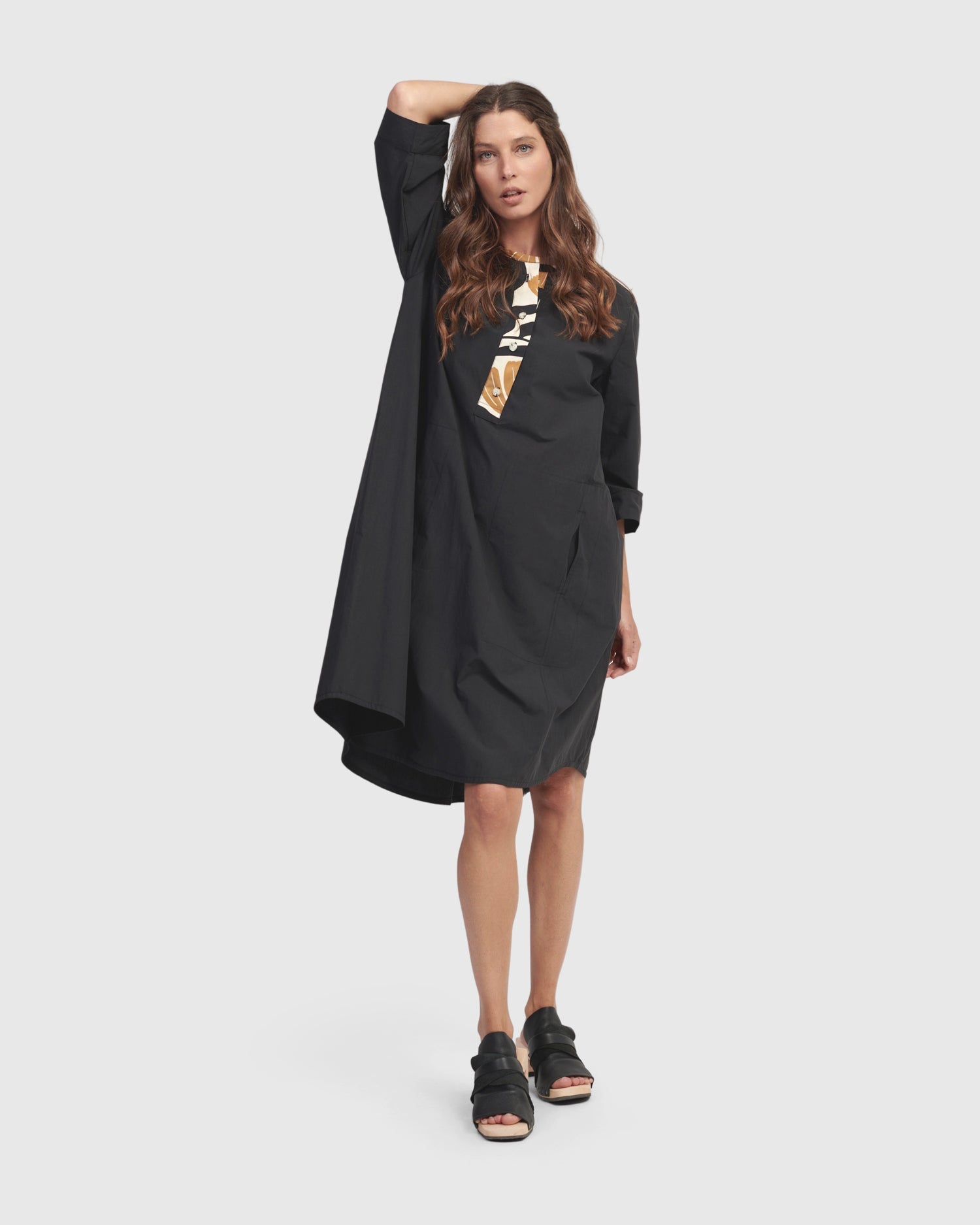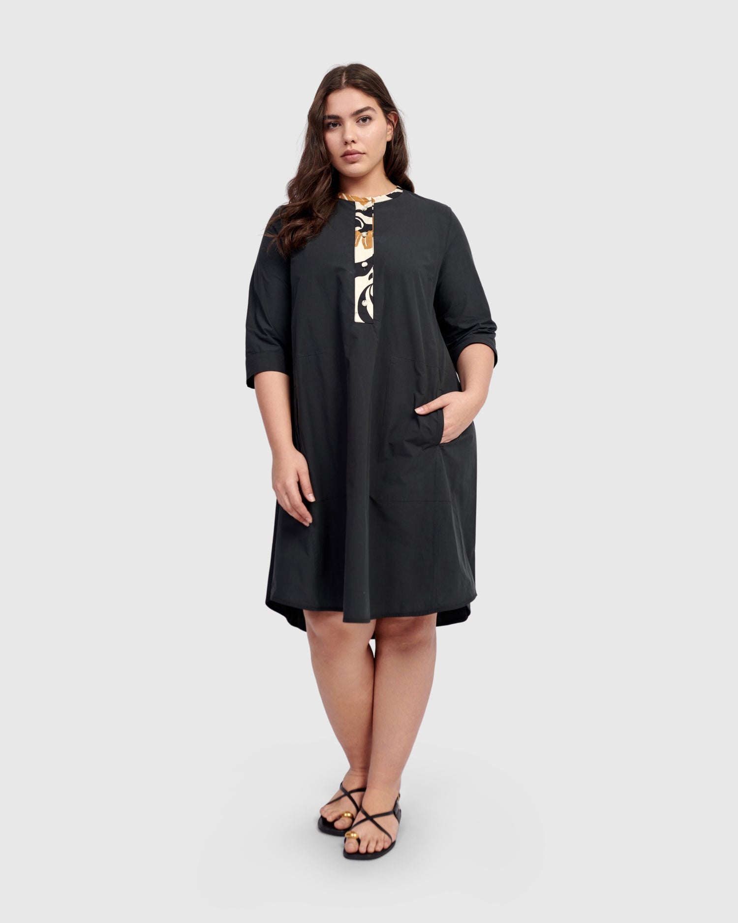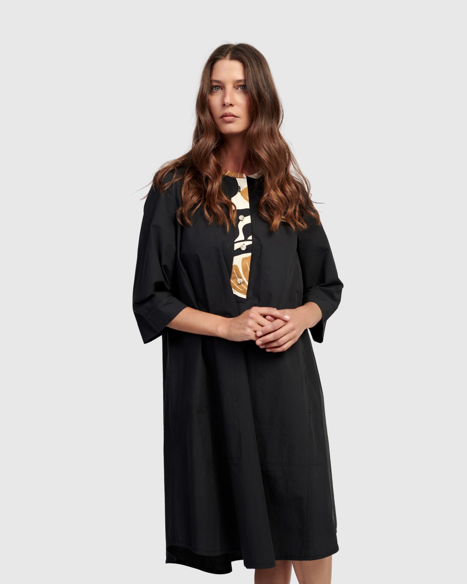This dazzling shirt dress has a loose pullover fit with half button placket, three quarter length sleeves, hidden side pockets and falls just at the knee with a shirttail hem. Made in a crisp woven cotton that wears well in warm temperatures and layers comfortably.