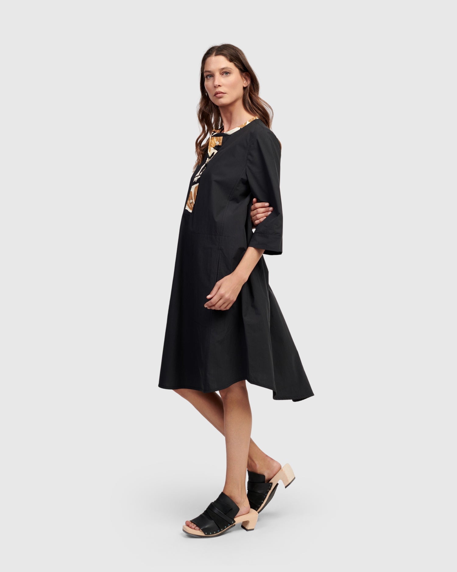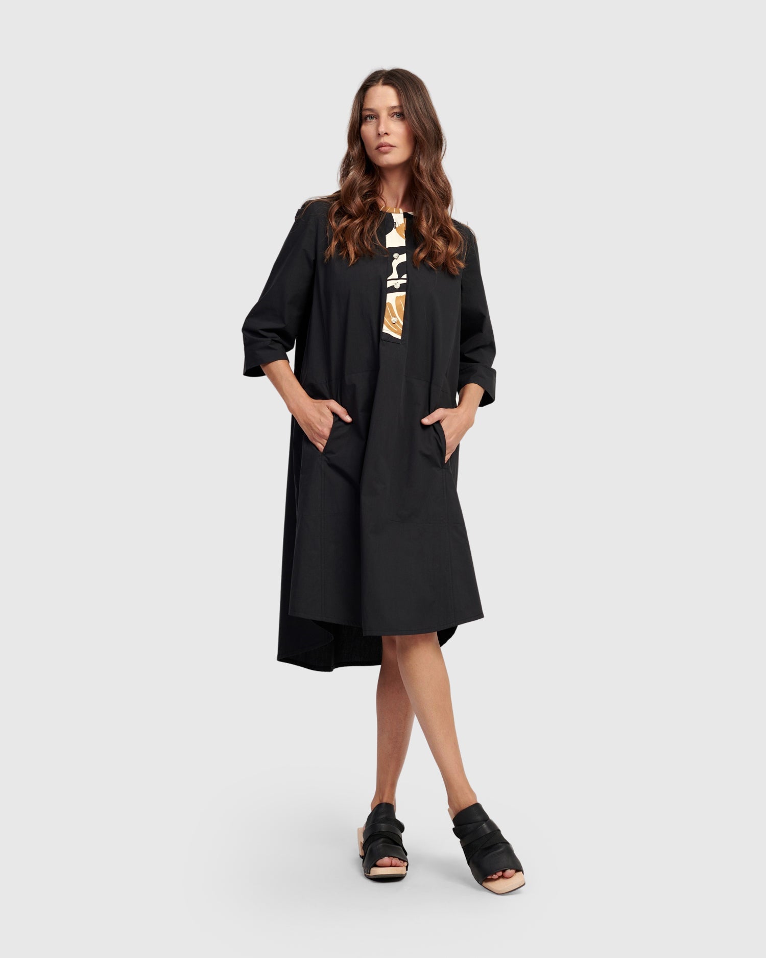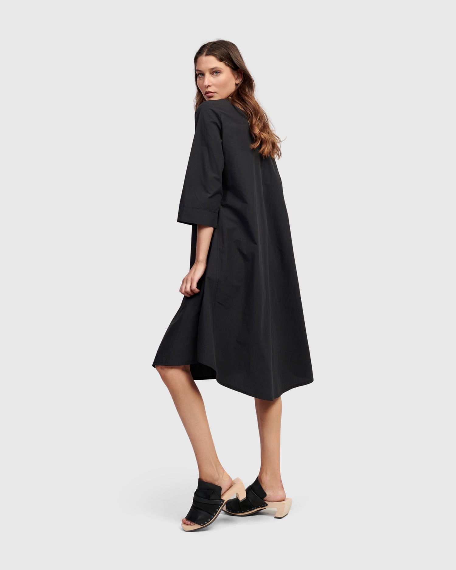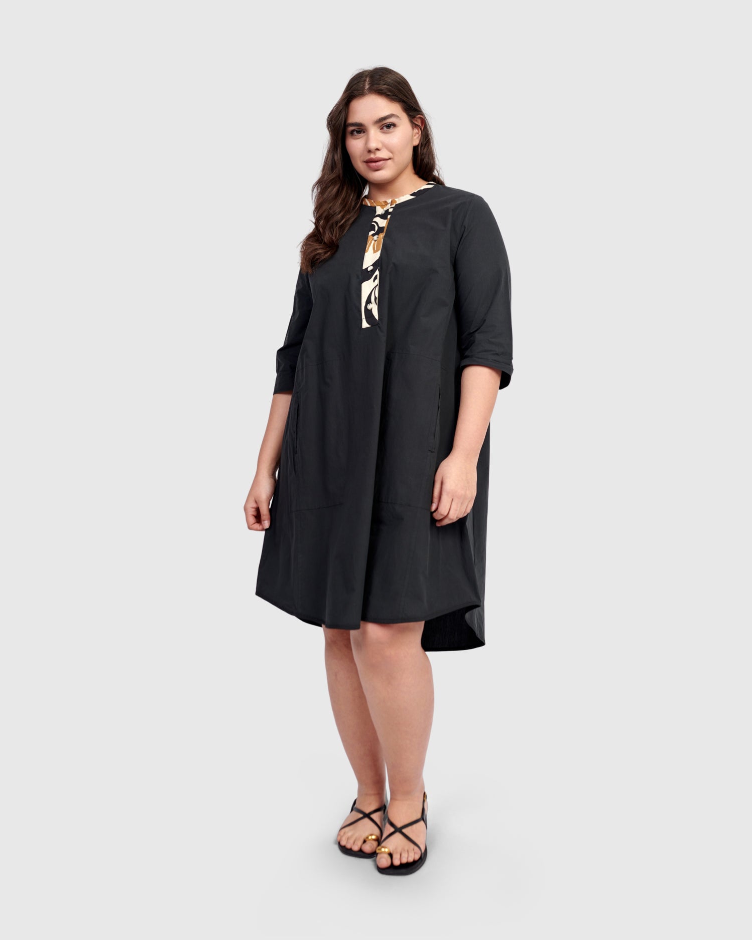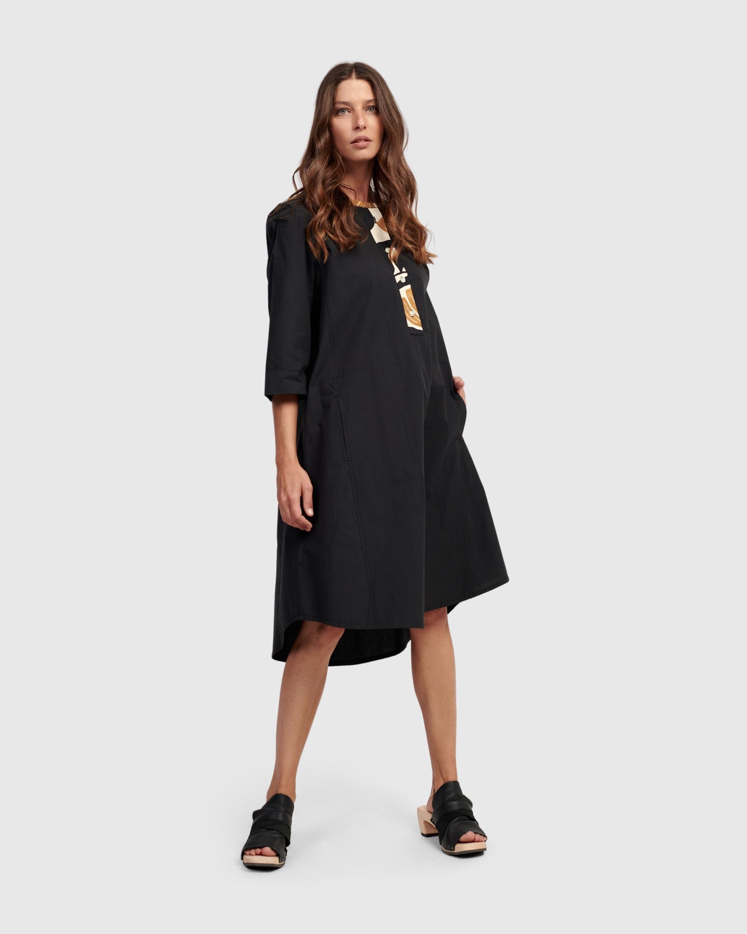 This dazzling shirt dress has a loose pullover fit with half button placket, three quarter length sleeves, hidden side pockets and falls just at the knee with a shirttail hem. Made in a crisp woven cotton that wears well in warm temperatures and layers comfortably.