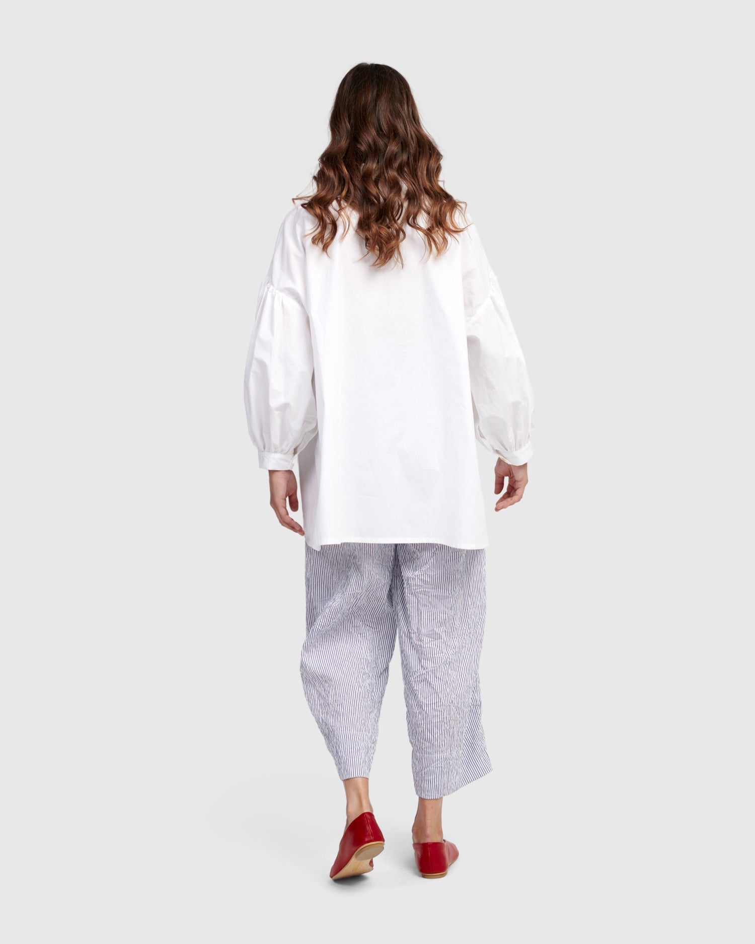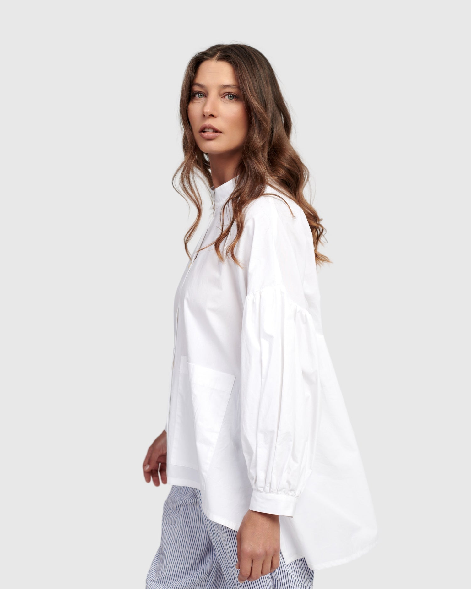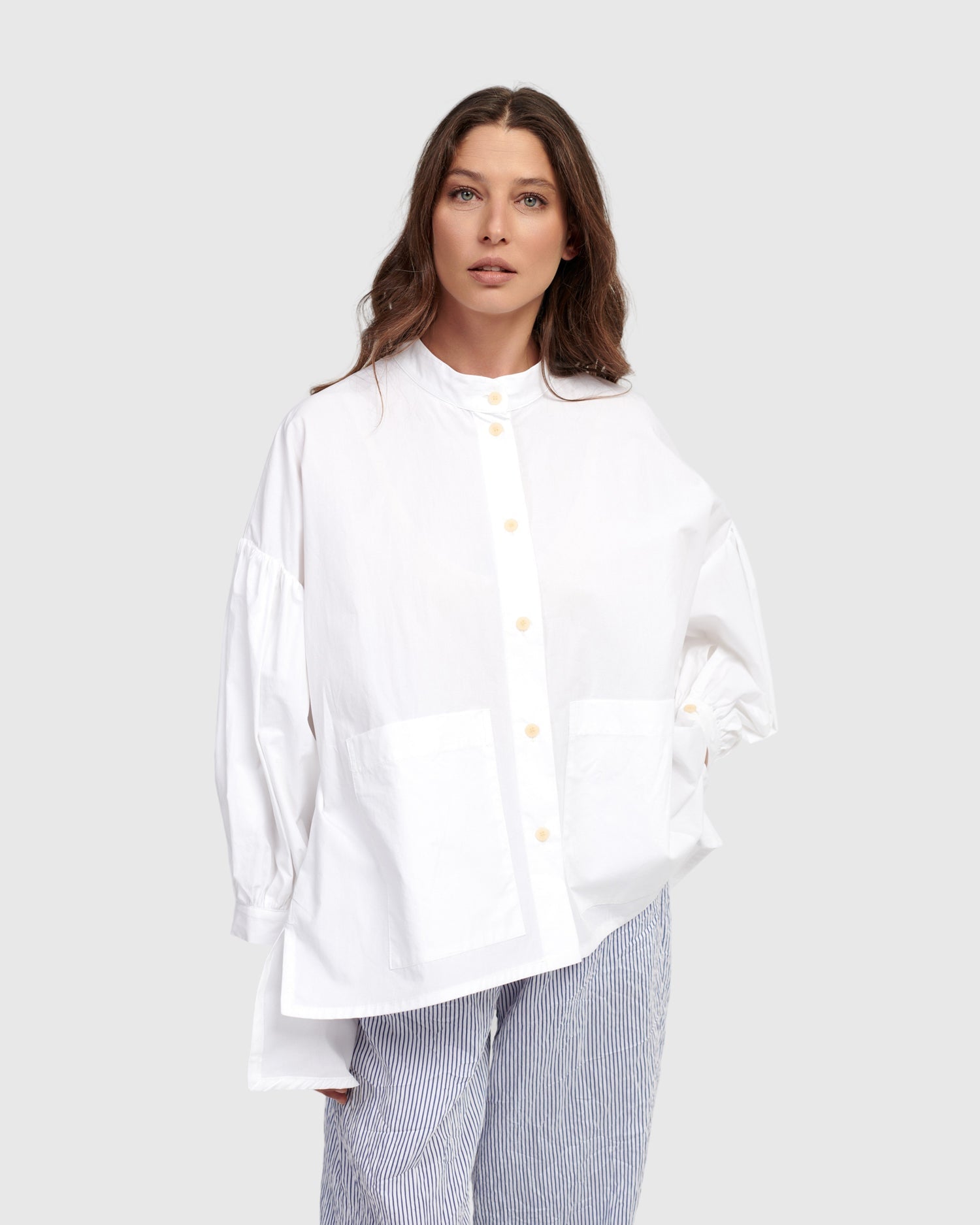 Made in a crisp cotton, this oversized blouse has a Mandarin collar with full button placket, drop shoulder peasant sleeves with button cuffs, two front patch pockets, and a hi-lo hem. A boxy silhouette offers plenty of breathability in warmer temps.