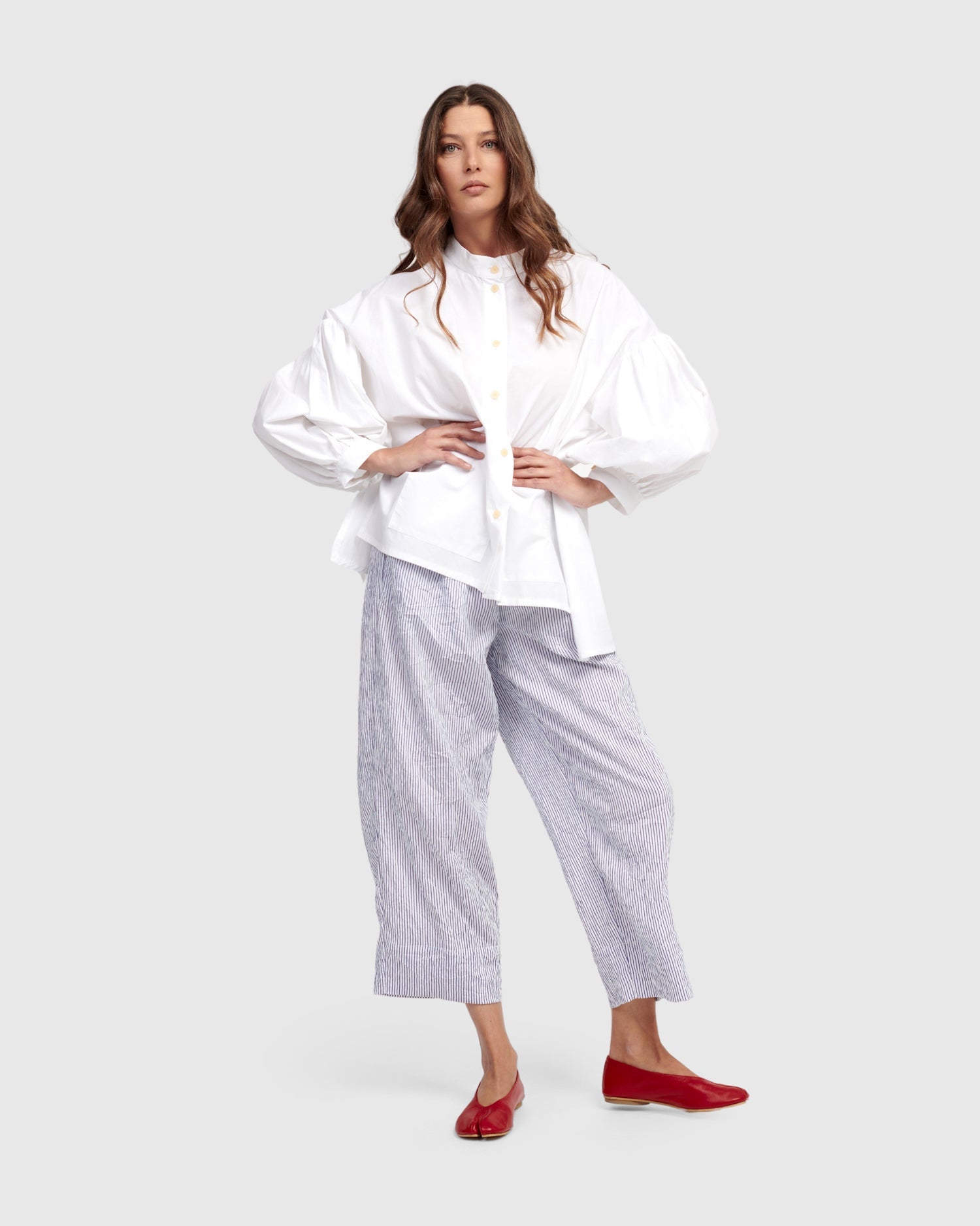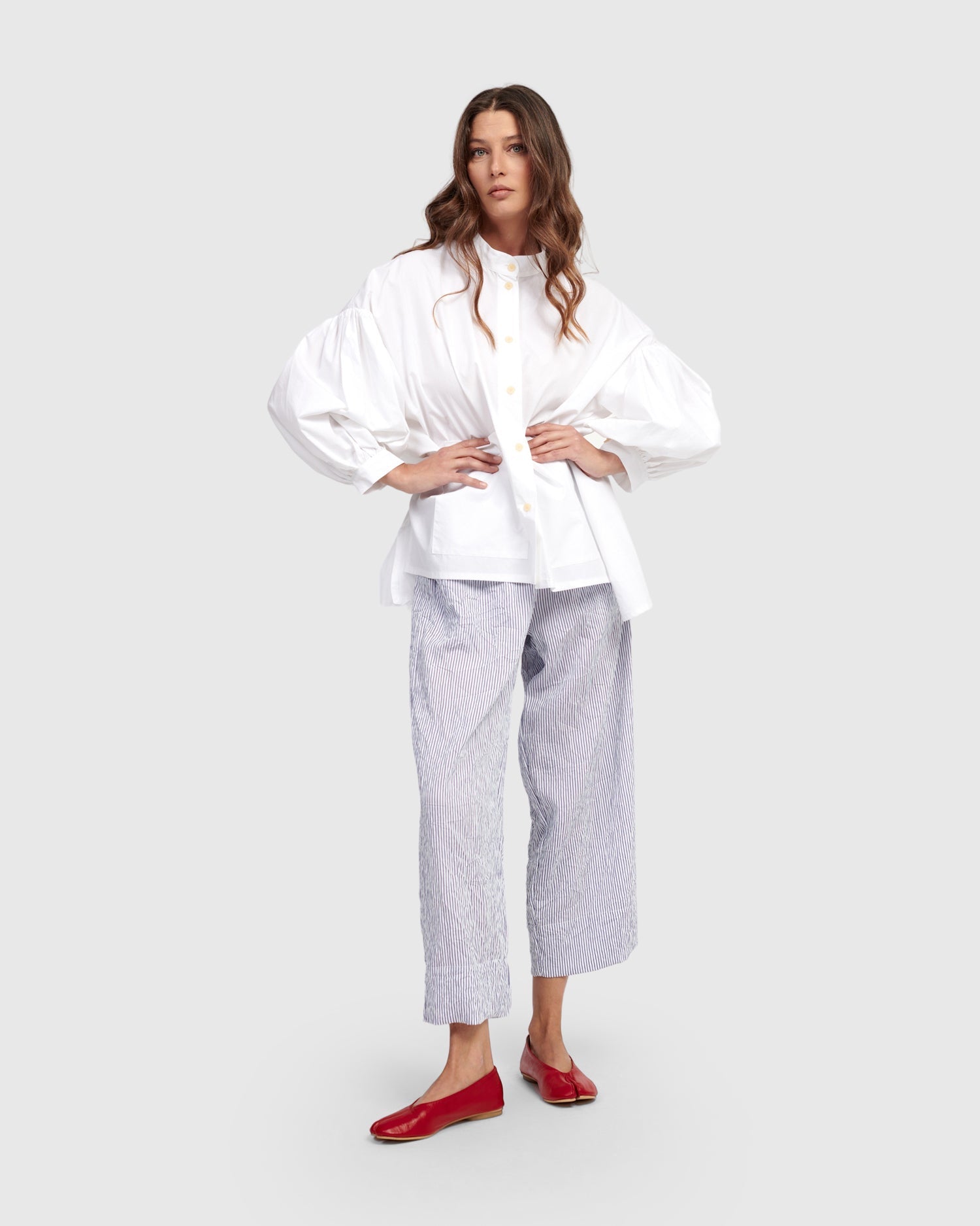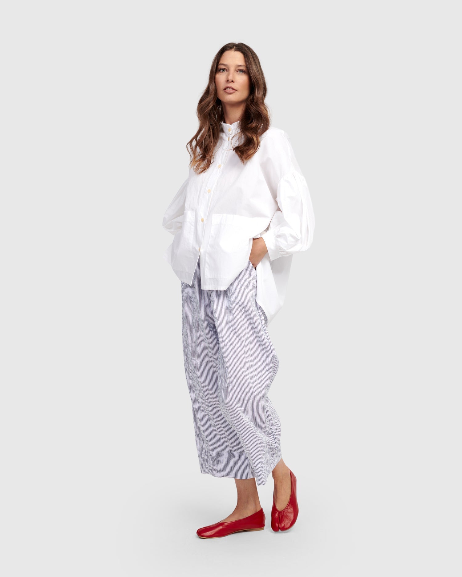 Made in a crisp cotton, this oversized blouse has a Mandarin collar with full button placket, drop shoulder peasant sleeves with button cuffs, two front patch pockets, and a hi-lo hem. A boxy silhouette offers plenty of breathability in warmer temps.