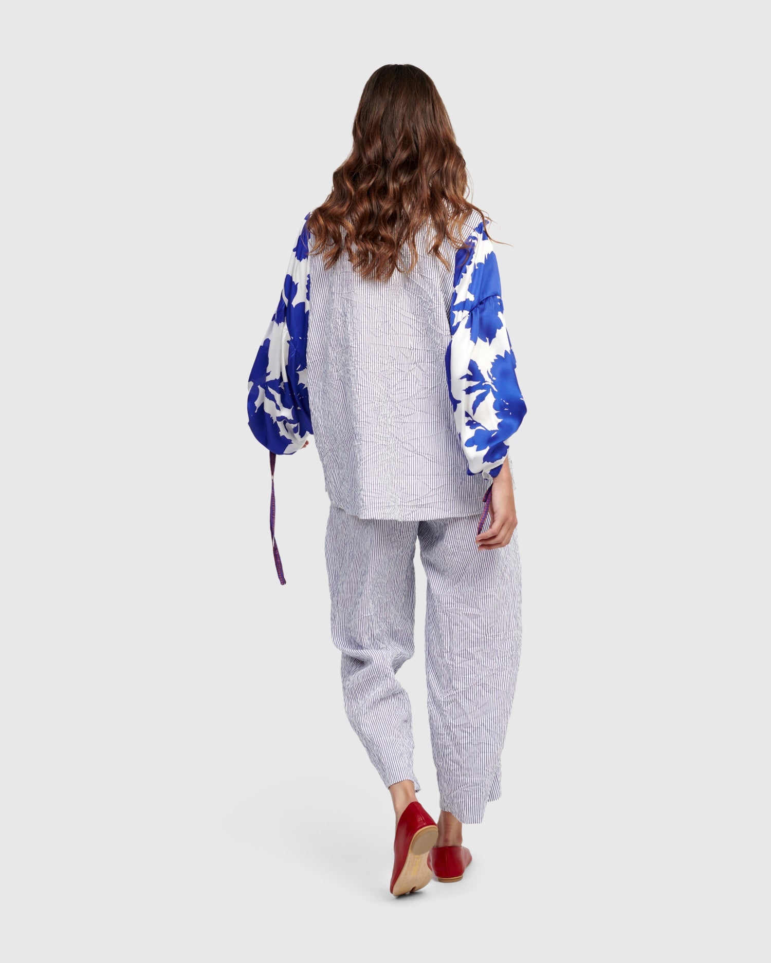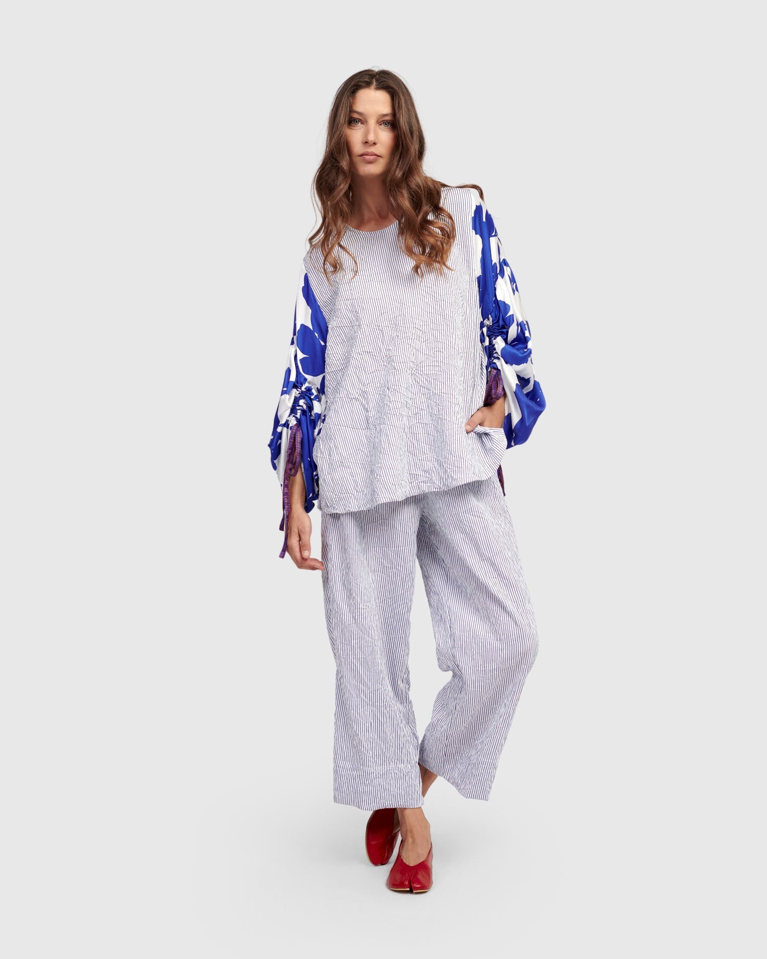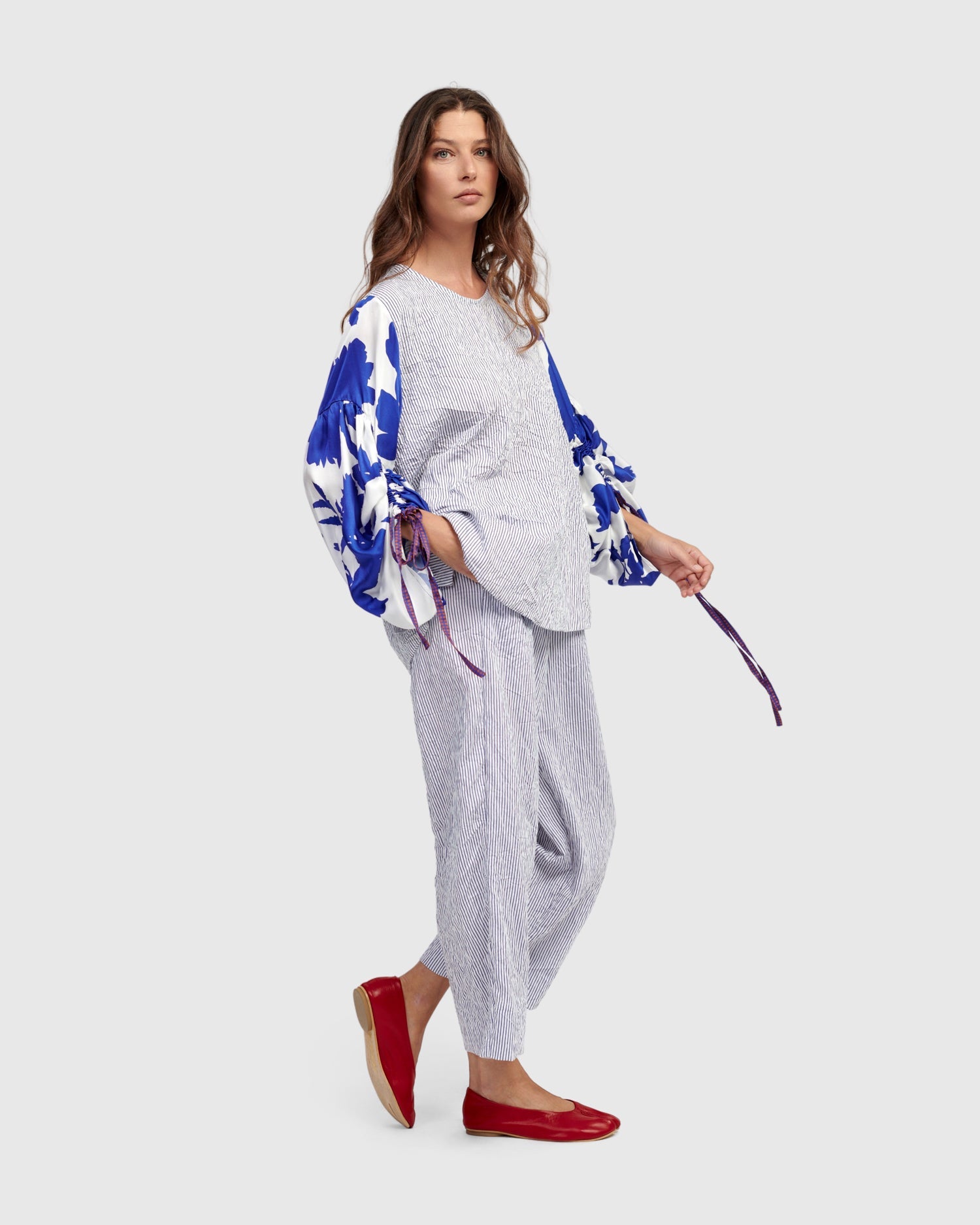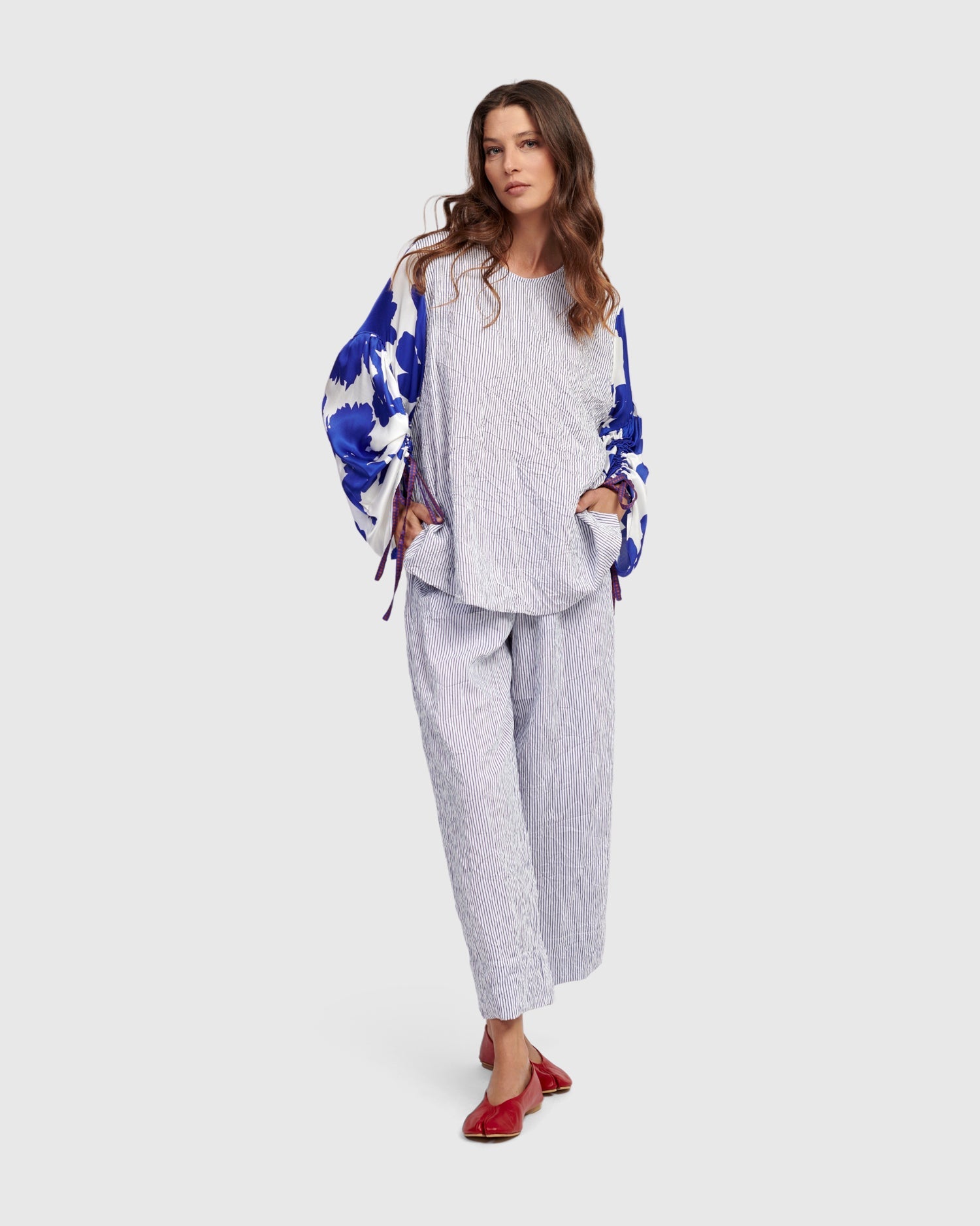 It's all in the details! This pullover blouse has a sweet delicate feel with silky blouson sleeves with adjustable cinching, crew neck with button detail at back, and a boxy silhouette. Made in a crinkled woven fabric, perfect for all-day-wear.