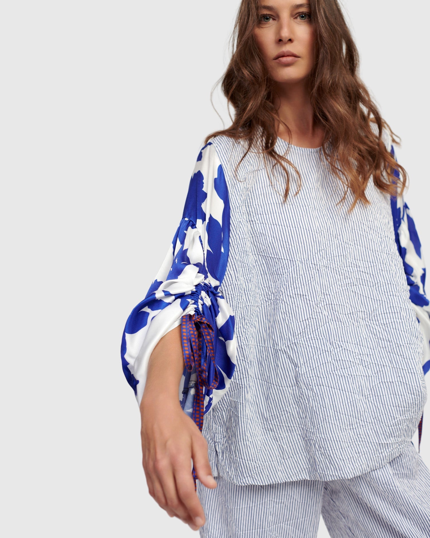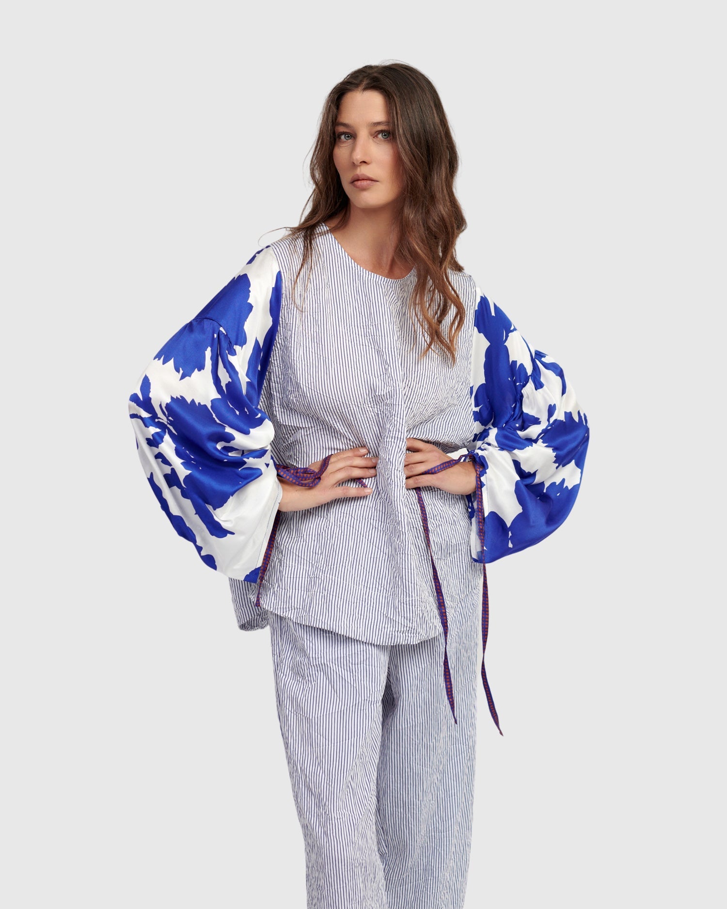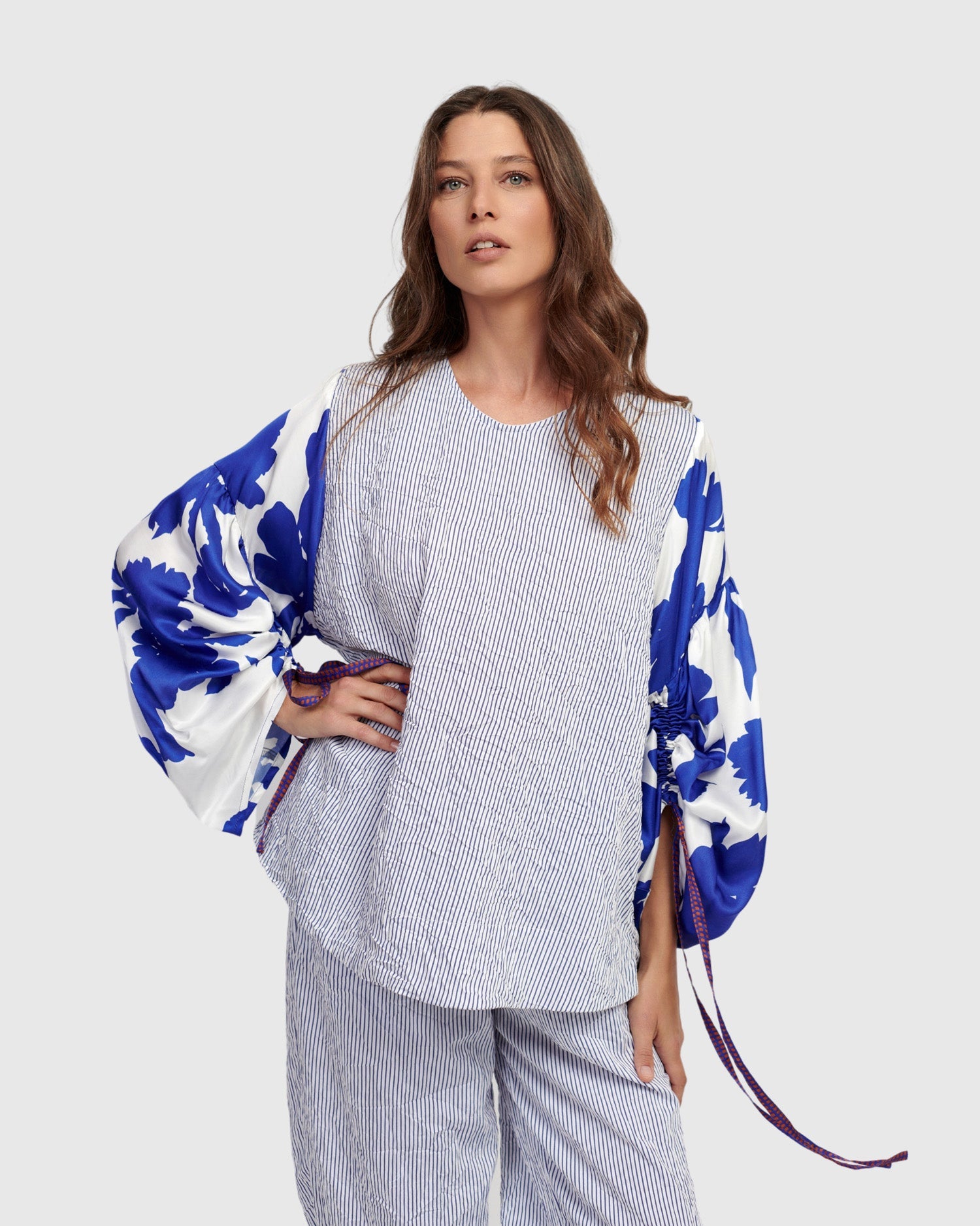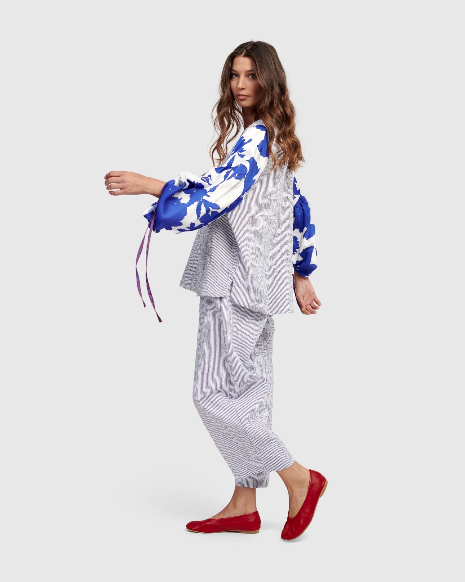 It's all in the details! This pullover blouse has a sweet delicate feel with silky blouson sleeves with adjustable cinching, crew neck with button detail at back, and a boxy silhouette. Made in a crinkled woven fabric, perfect for all-day-wear.