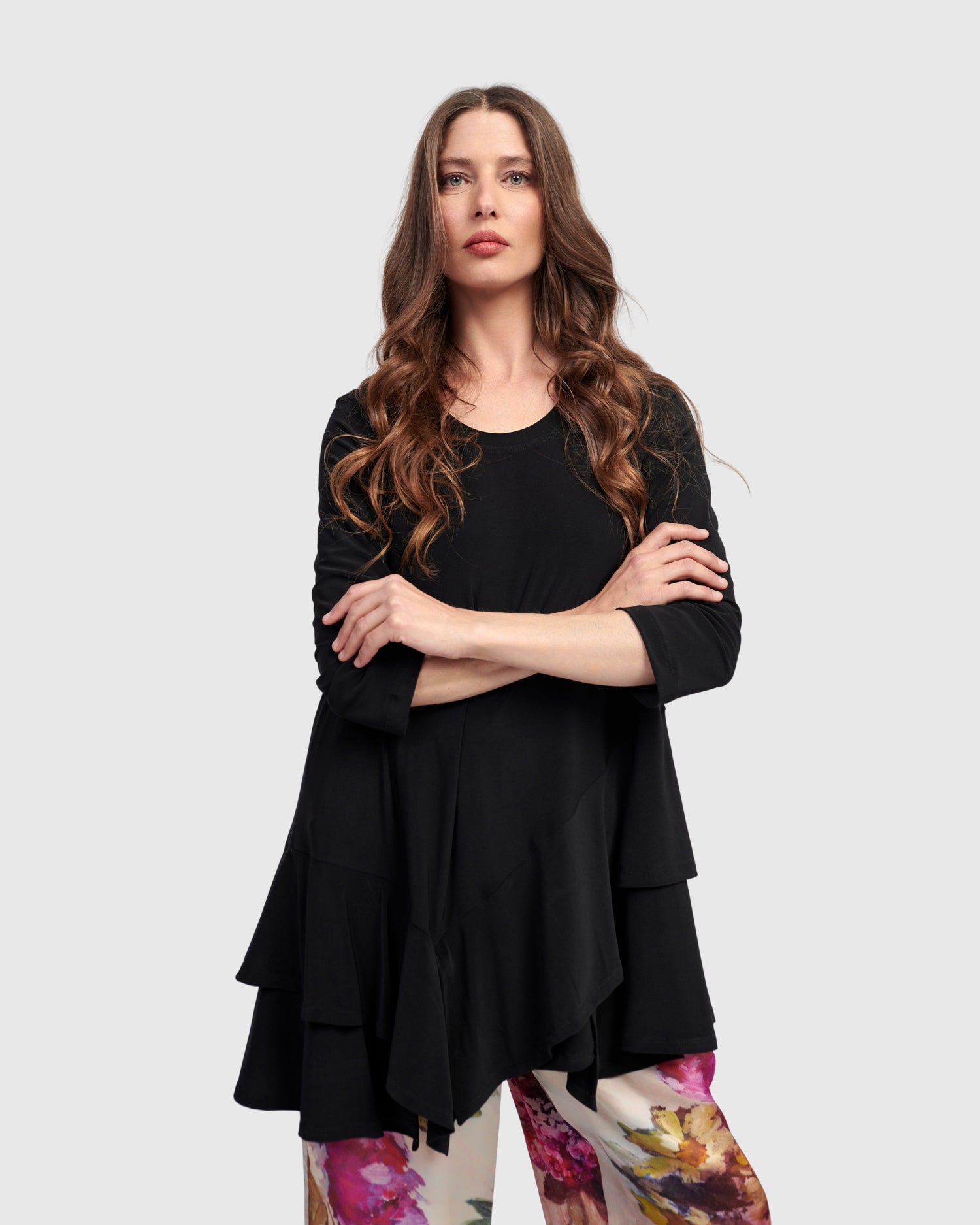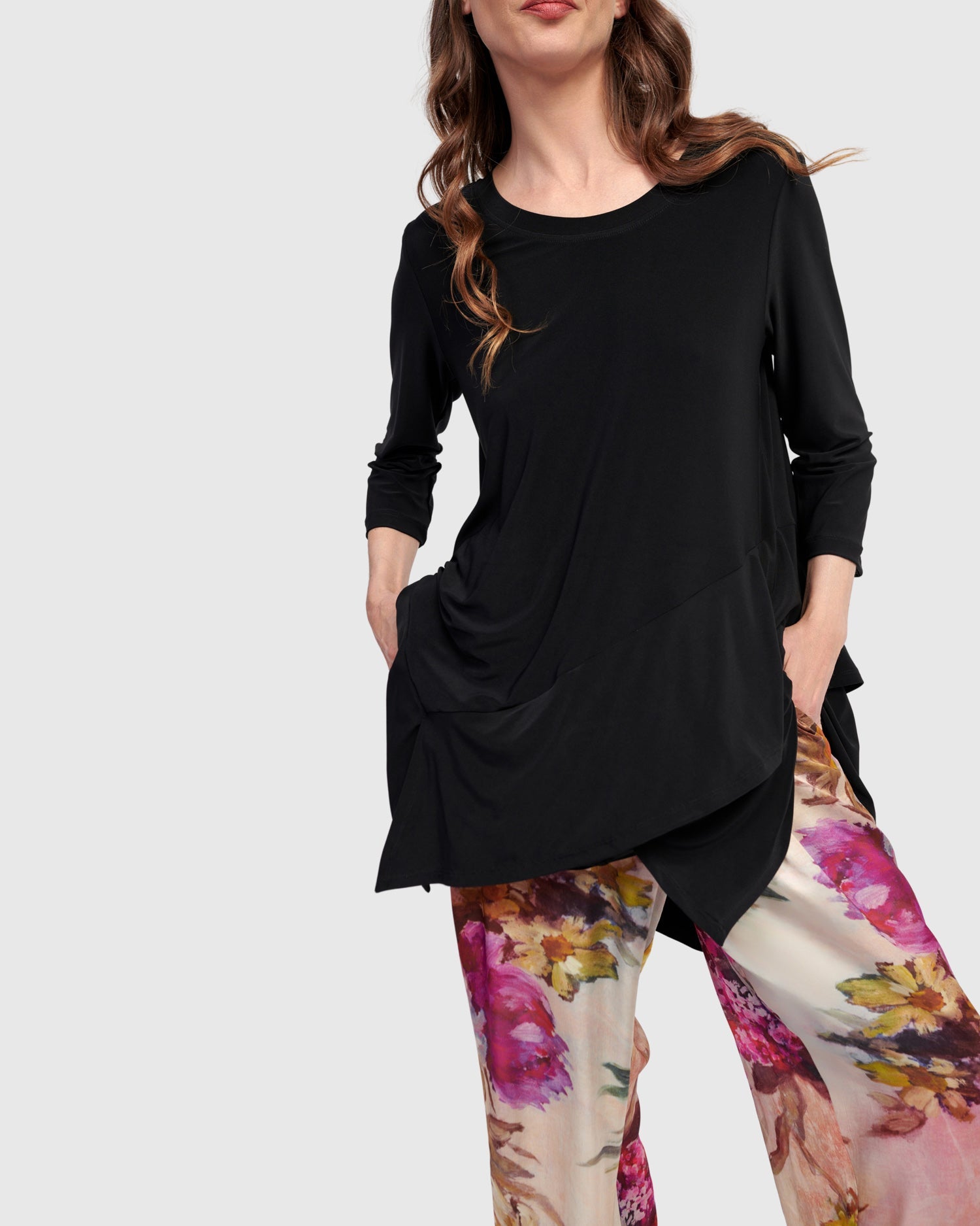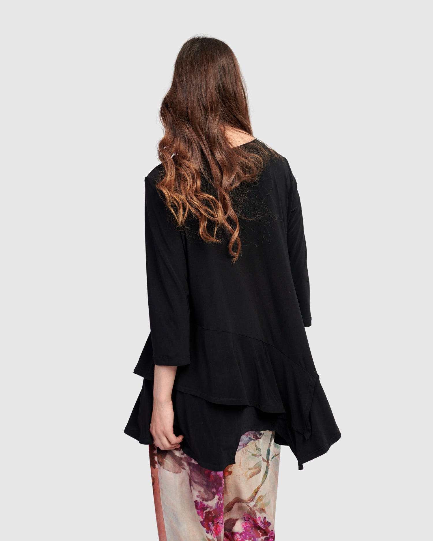 This soft pullover top has a crew neck, three quarter length sleeves and asymmetric flounce hem with coverage in back. Made in a stretch slinky knit, it has a close fit in the shoulders, relaxed at the bust and falls into an A-line silhouette.