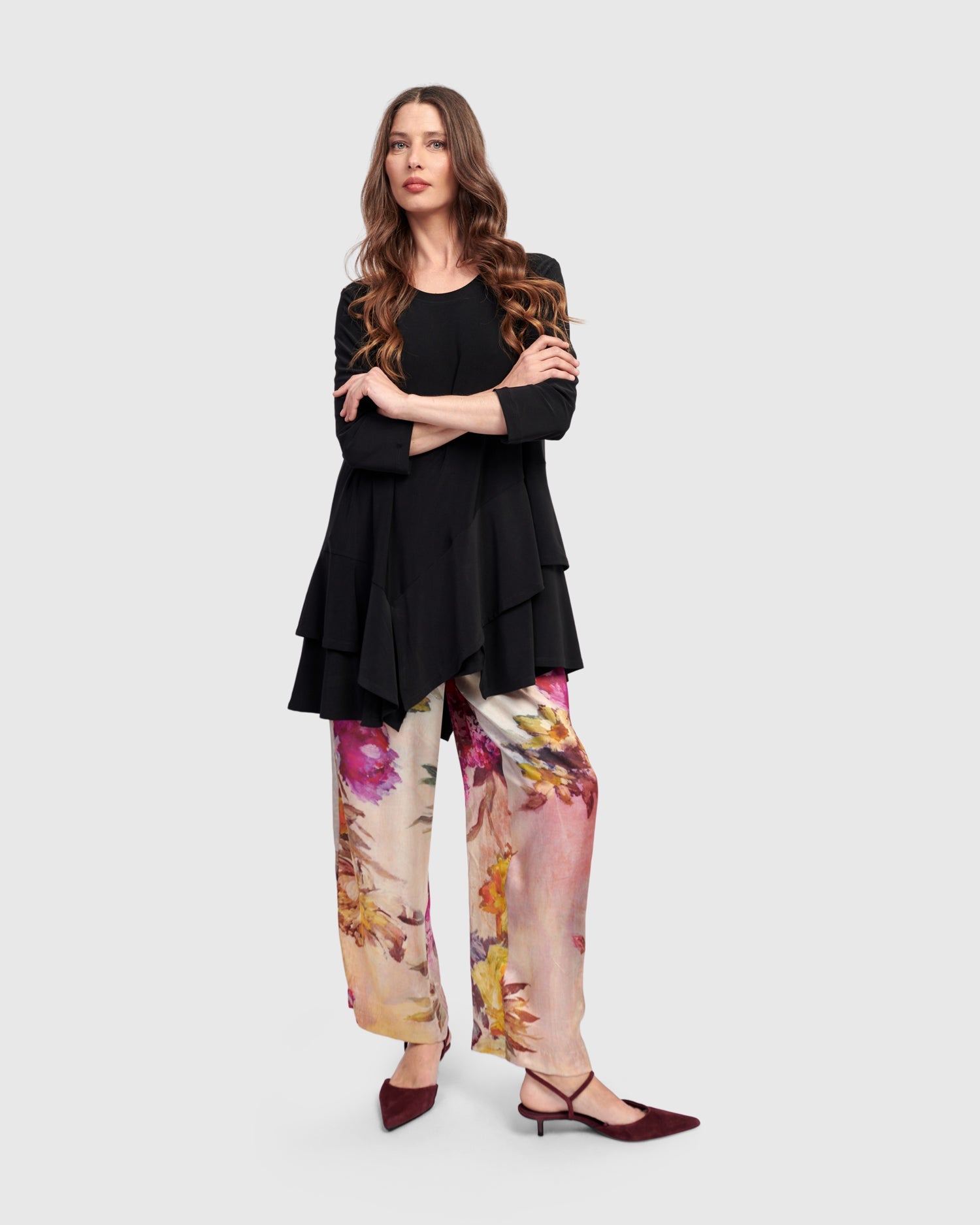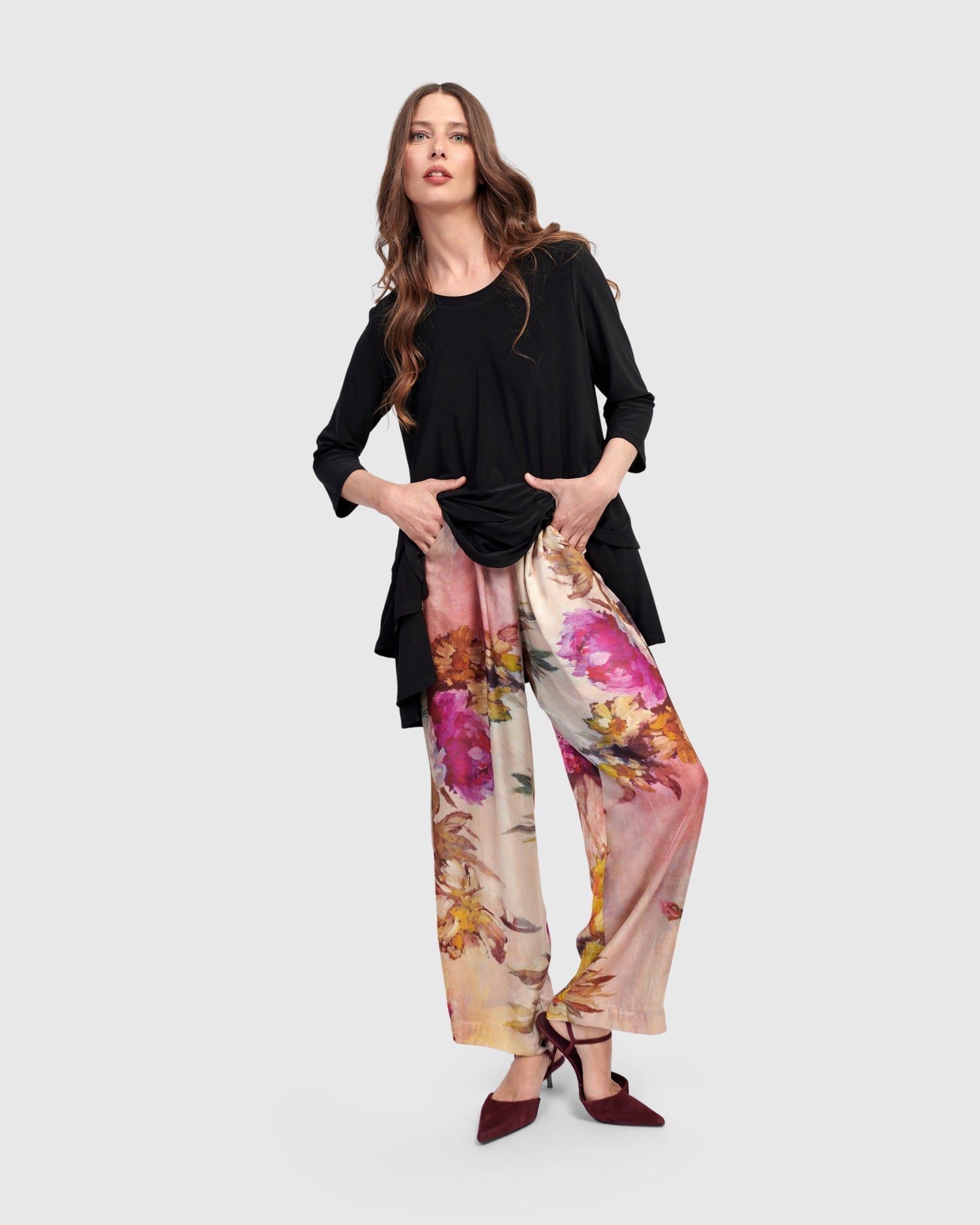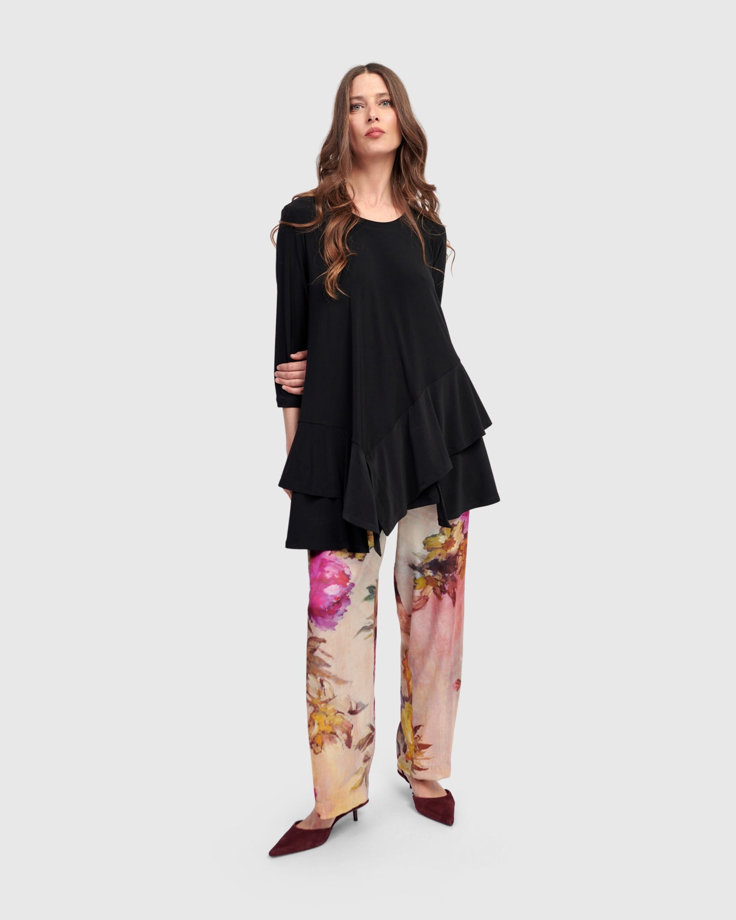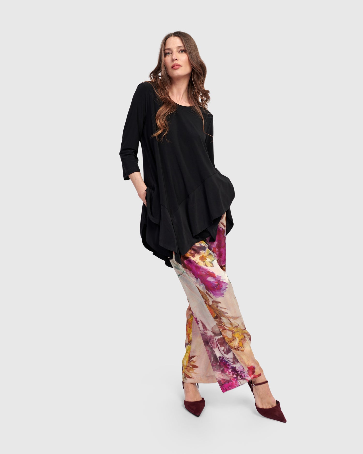 This soft pullover top has a crew neck, three quarter length sleeves and asymmetric flounce hem with coverage in back. Made in a stretch slinky knit, it has a close fit in the shoulders, relaxed at the bust and falls into an A-line silhouette.