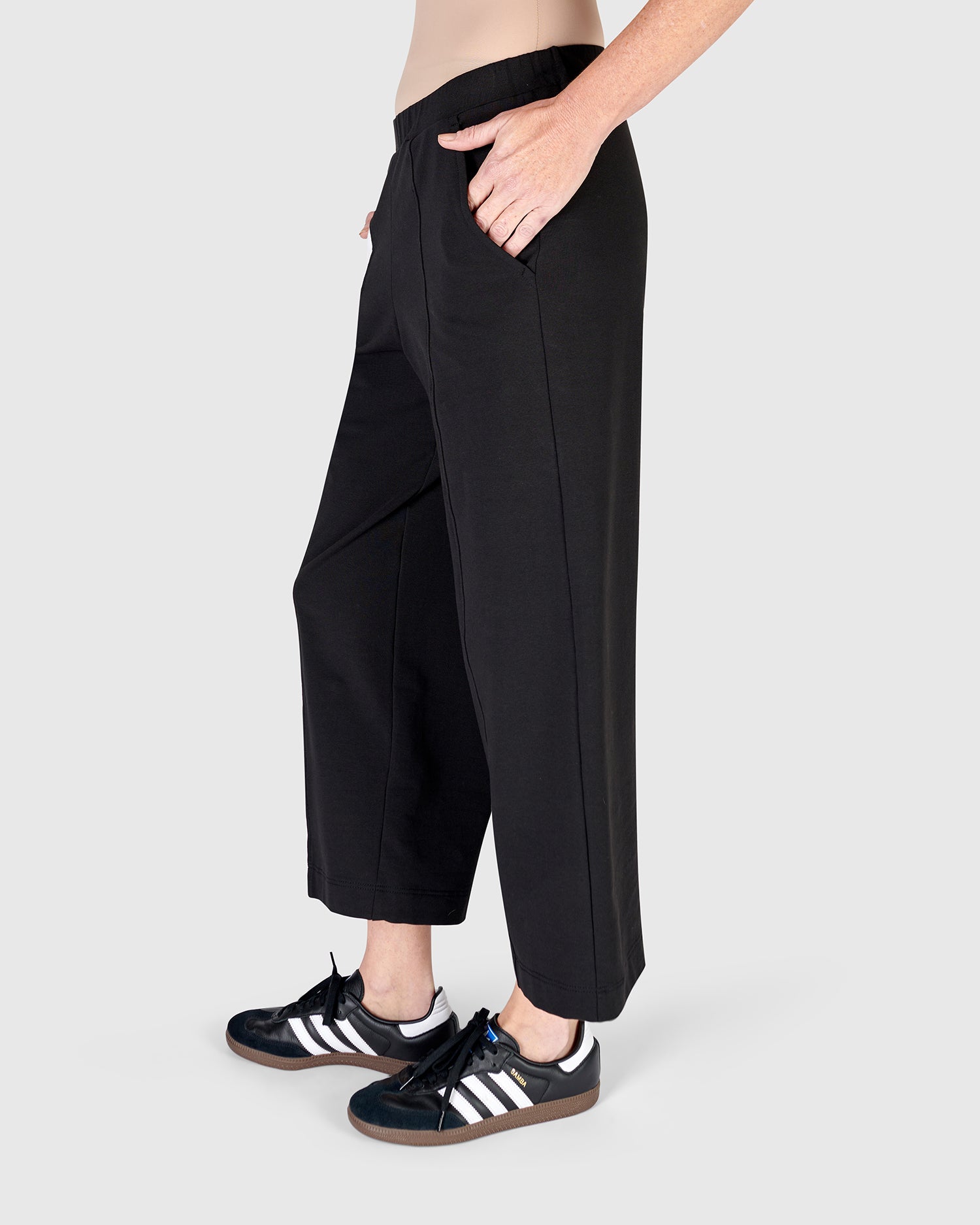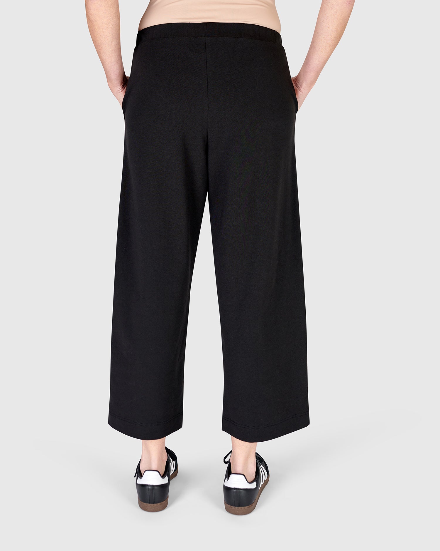 Made in a soft baby french terry knit for all day comfort, these high waisted lounge pants are perfect to pair with any tee or tunic. They have a relaxed fit, straight cropped leg, elastic waistband and side pockets.