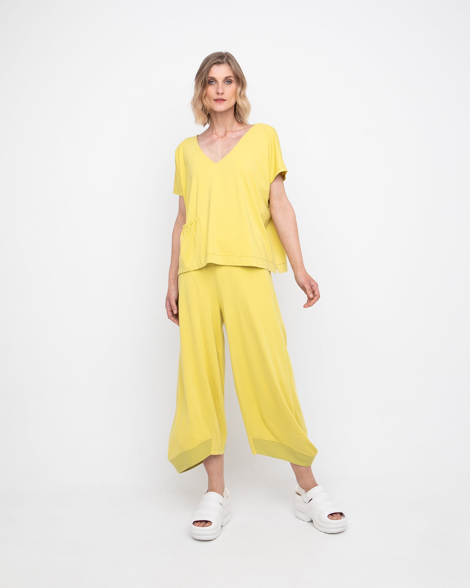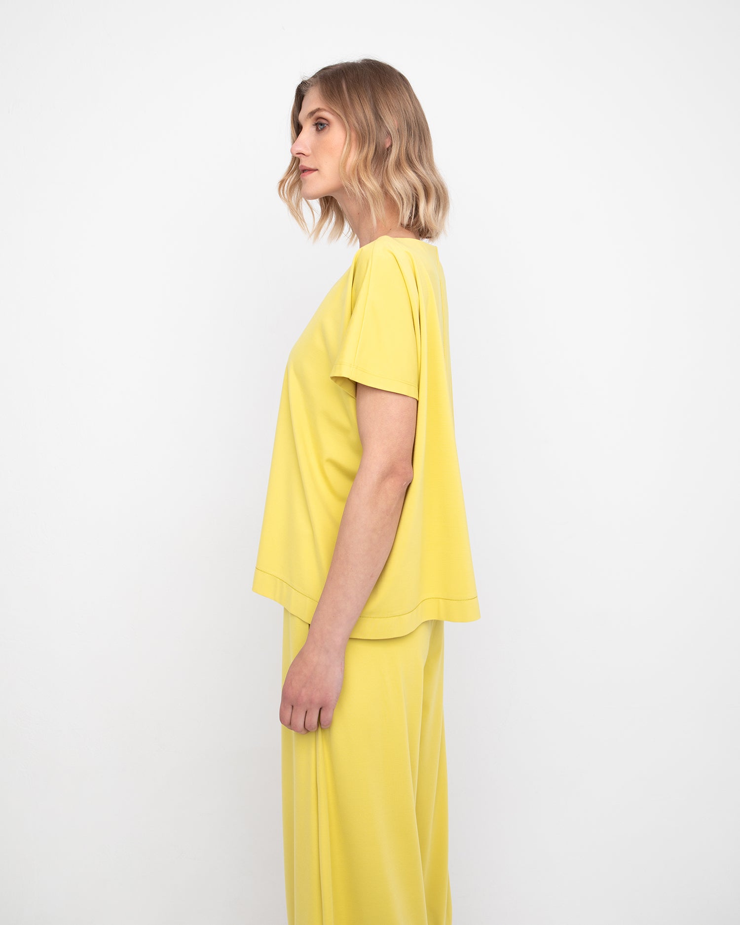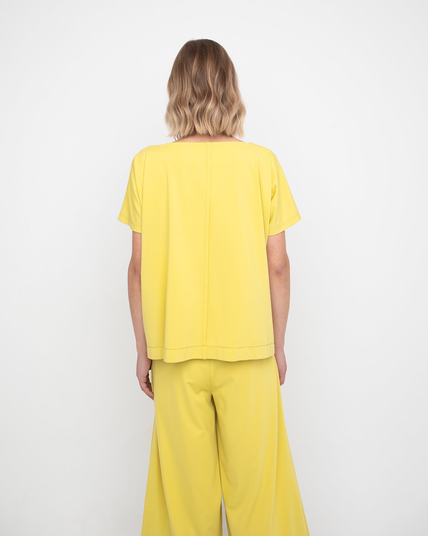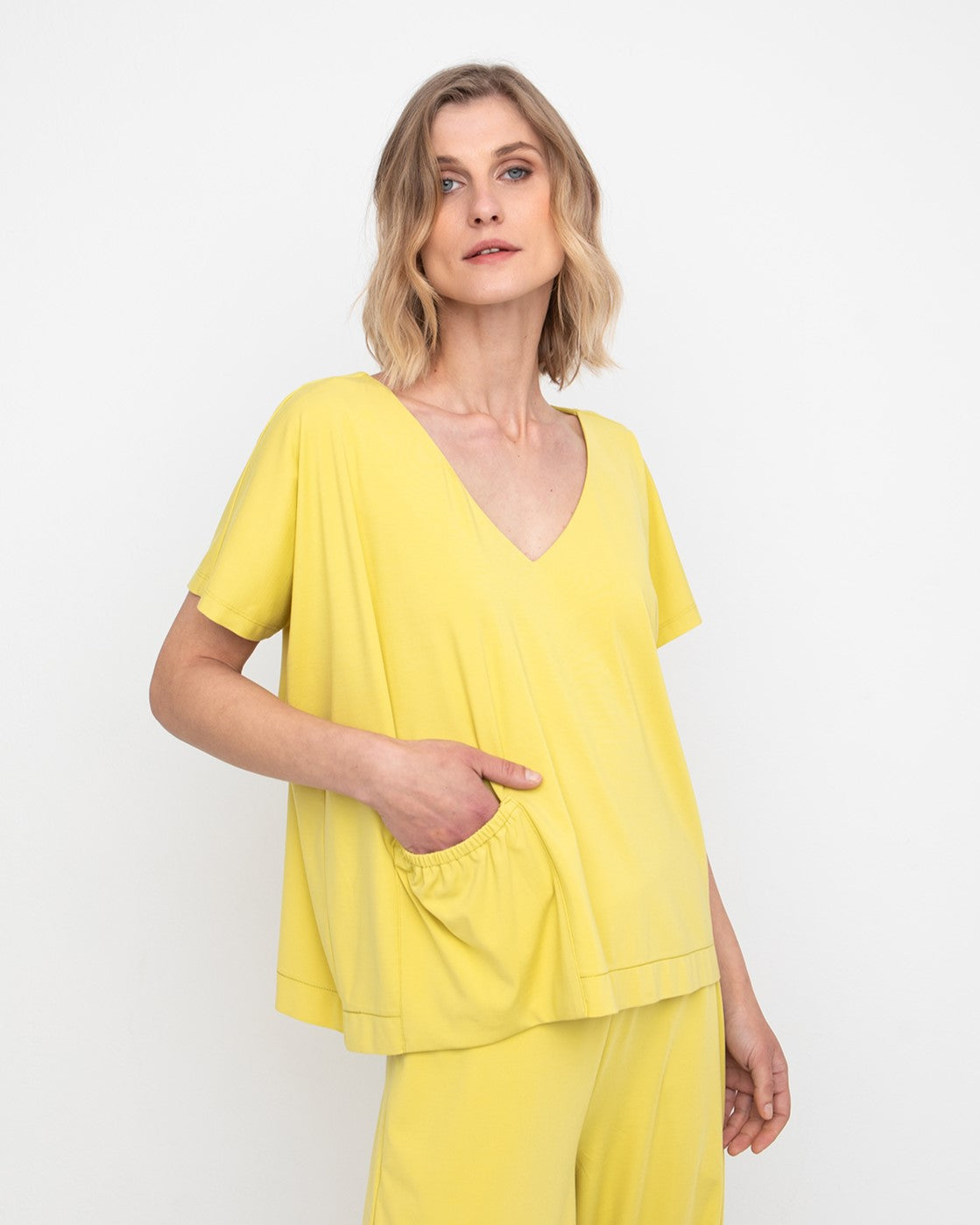 Cute tee alert! This bright pullover top has a relaxed fit and boxy silhouette, plus a deep V-neck, drop shoulder short sleeves and a cinched front pocket detail. It's made in a midweight ponte knit and hits just above the hip.