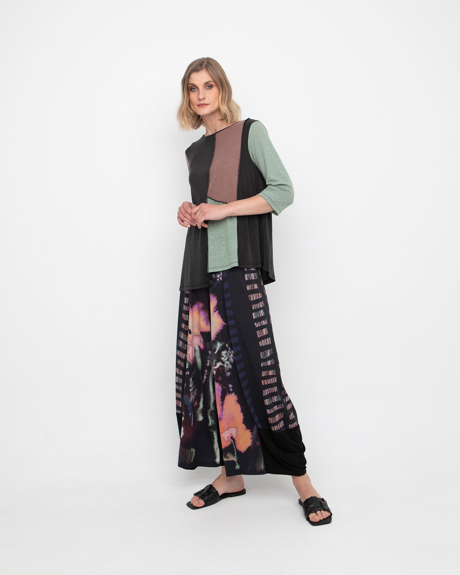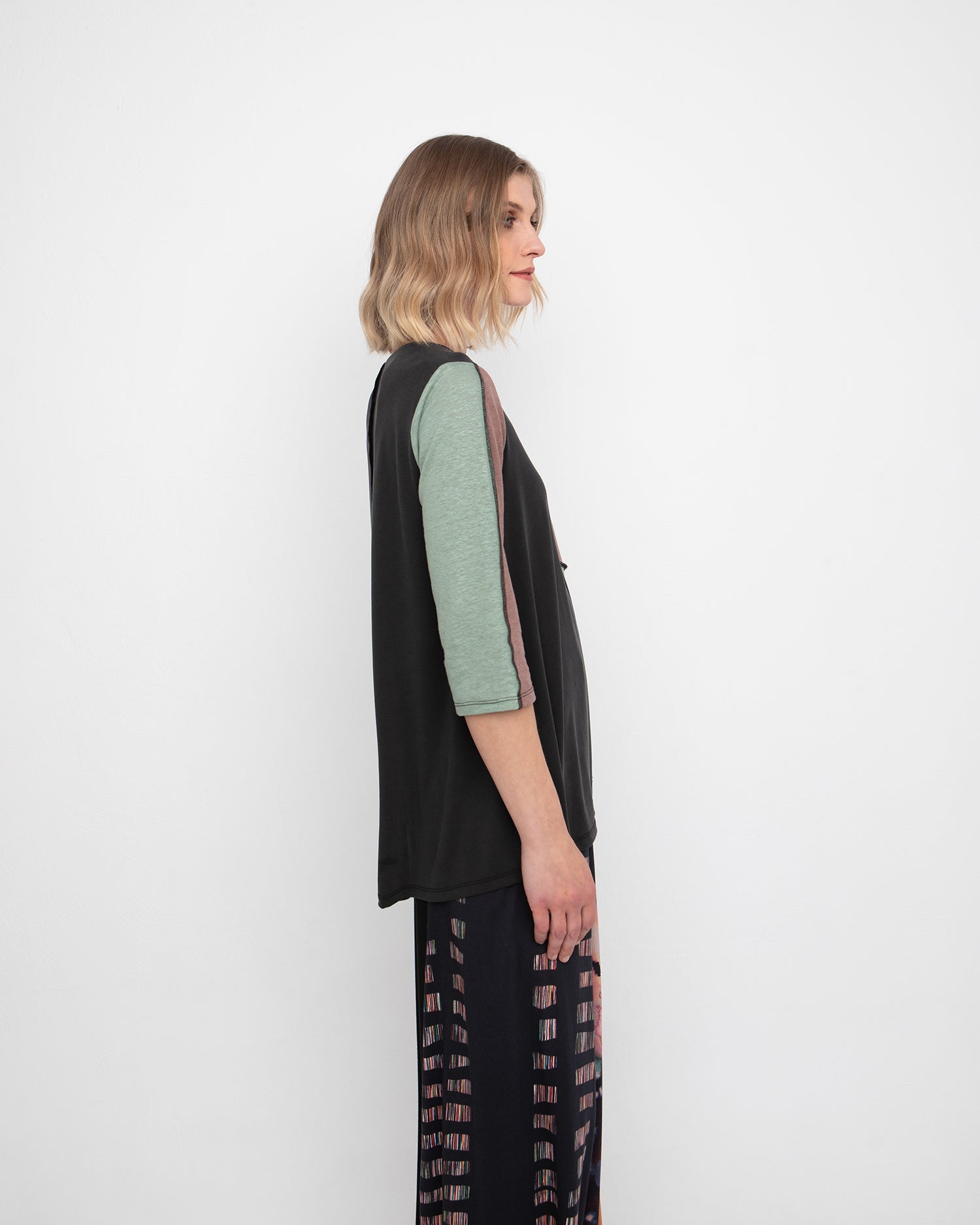 This colorblock pullover top is buttery soft and has a crew neck, three-quarter length sleeves, pieced paneling with exposed seams and a slim A-line silhouette.