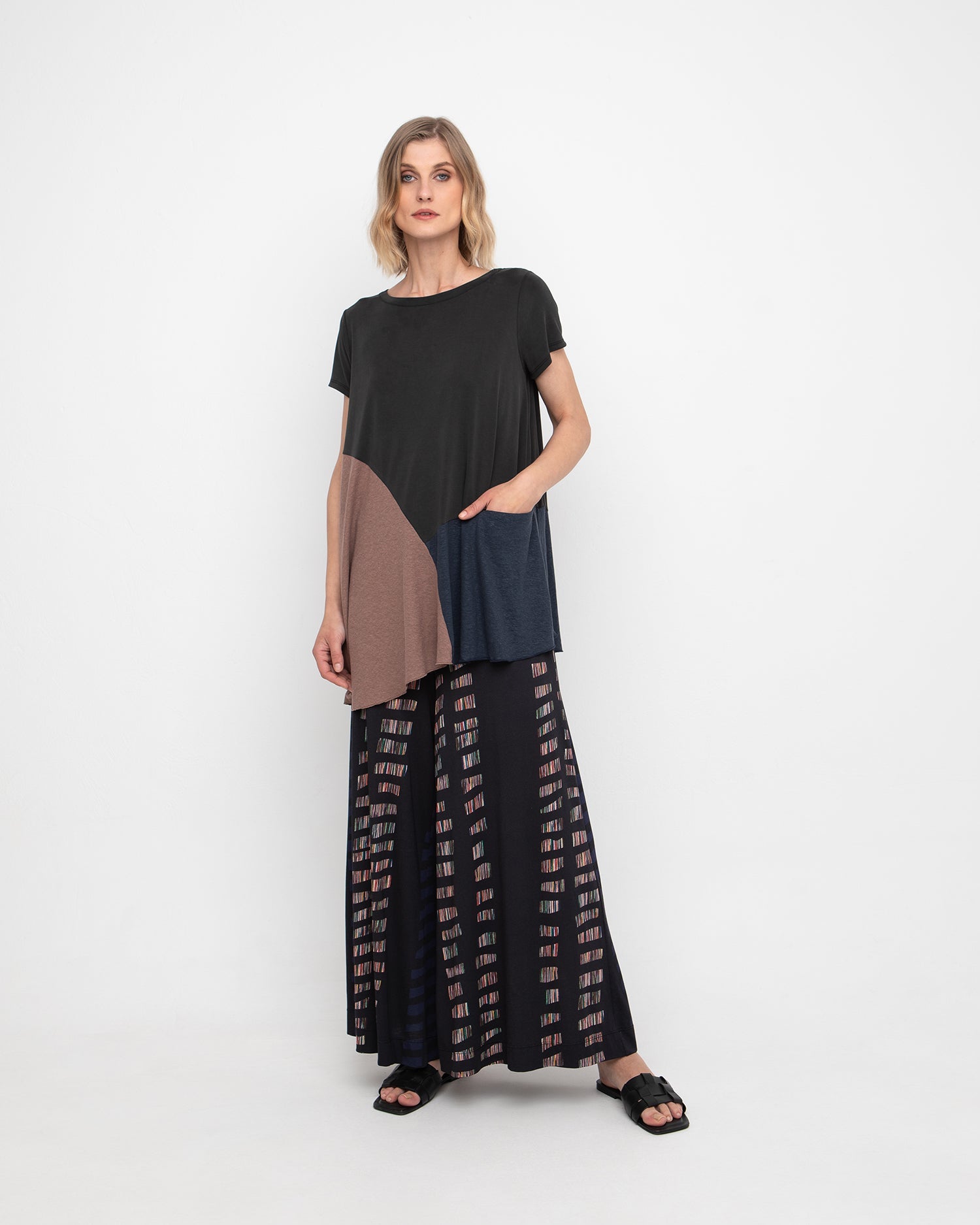 These swishy palazzo pants are full length and have a relaxed fit with a flowy leg taper. Features an elastic back waist and side pockets.