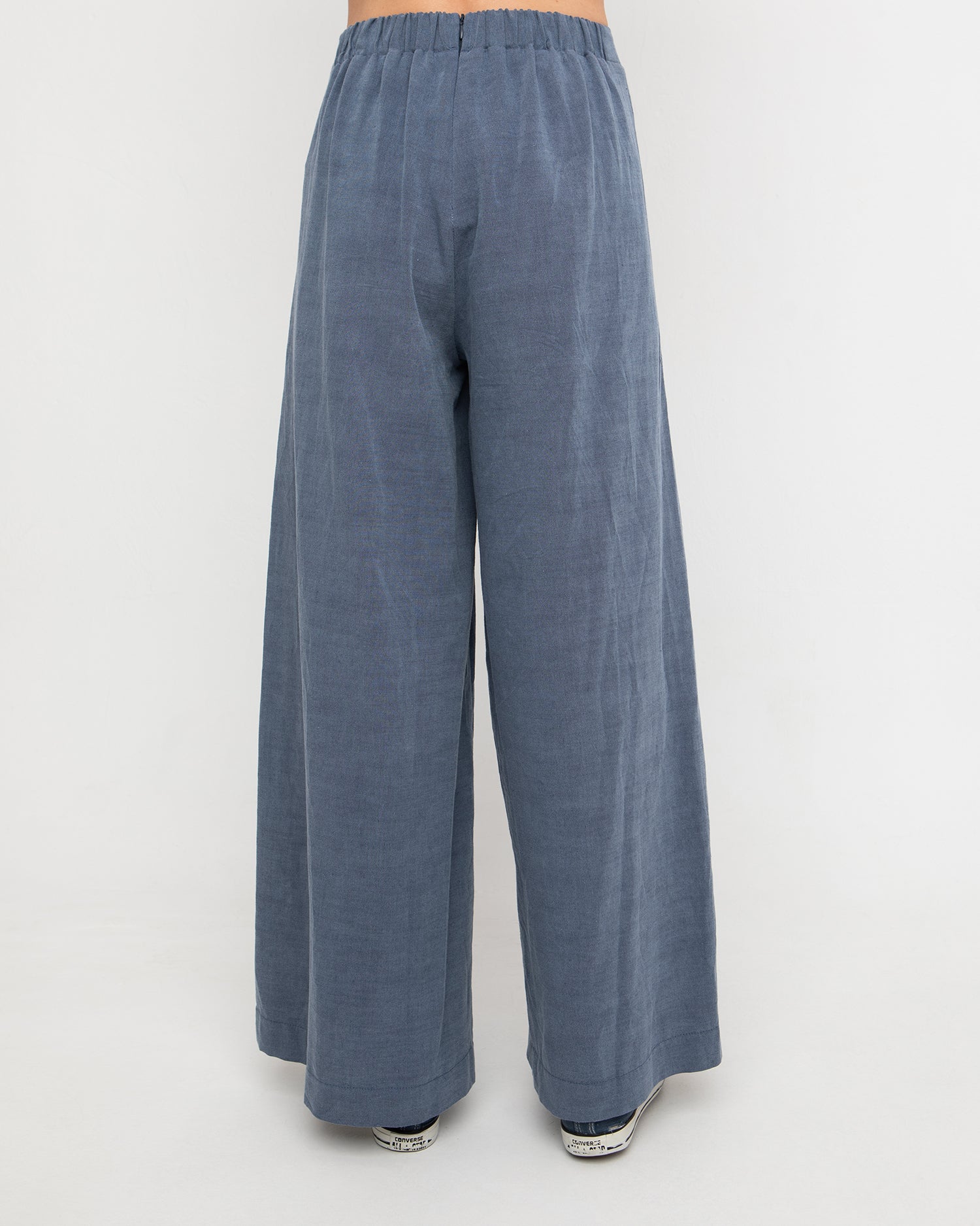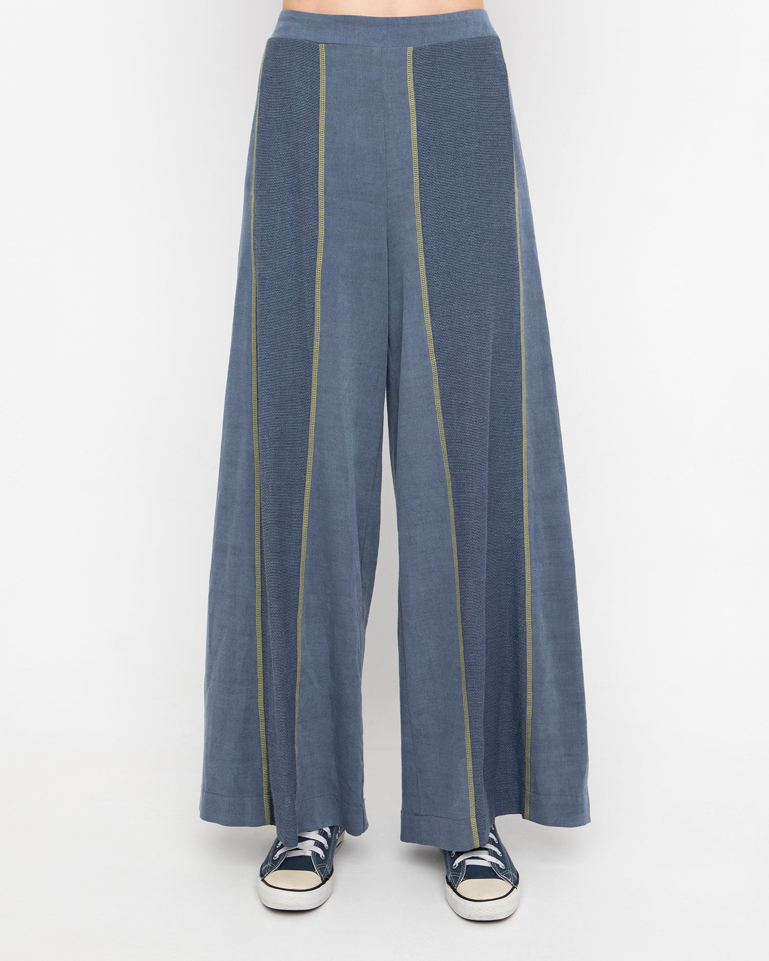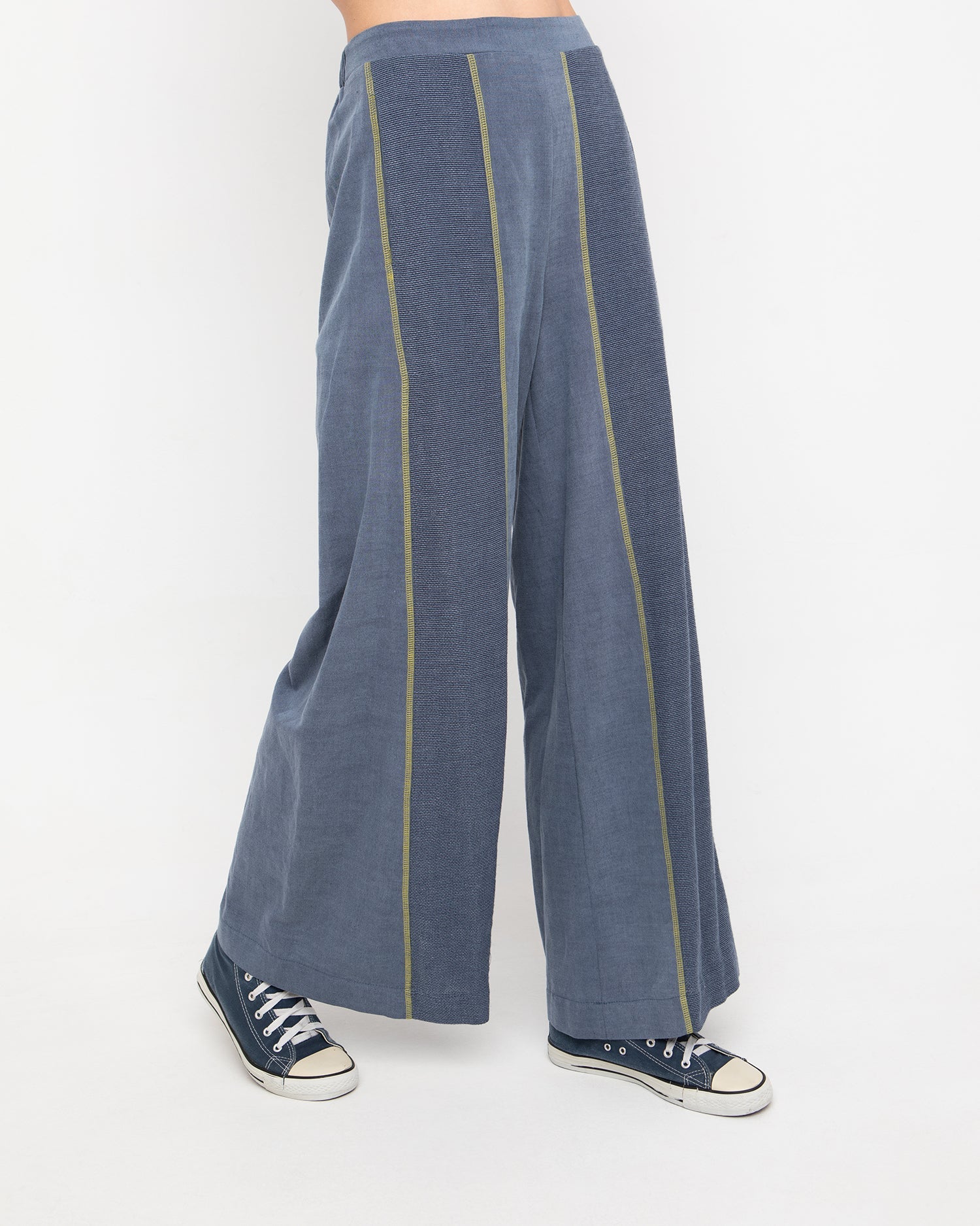 These high-waisted trousers have a wide leg, hidden side pockets, and flat front with elastic back waist plus a zipper. Made in a netted textural woven, these trousers exude a chic, seafaring vibe.