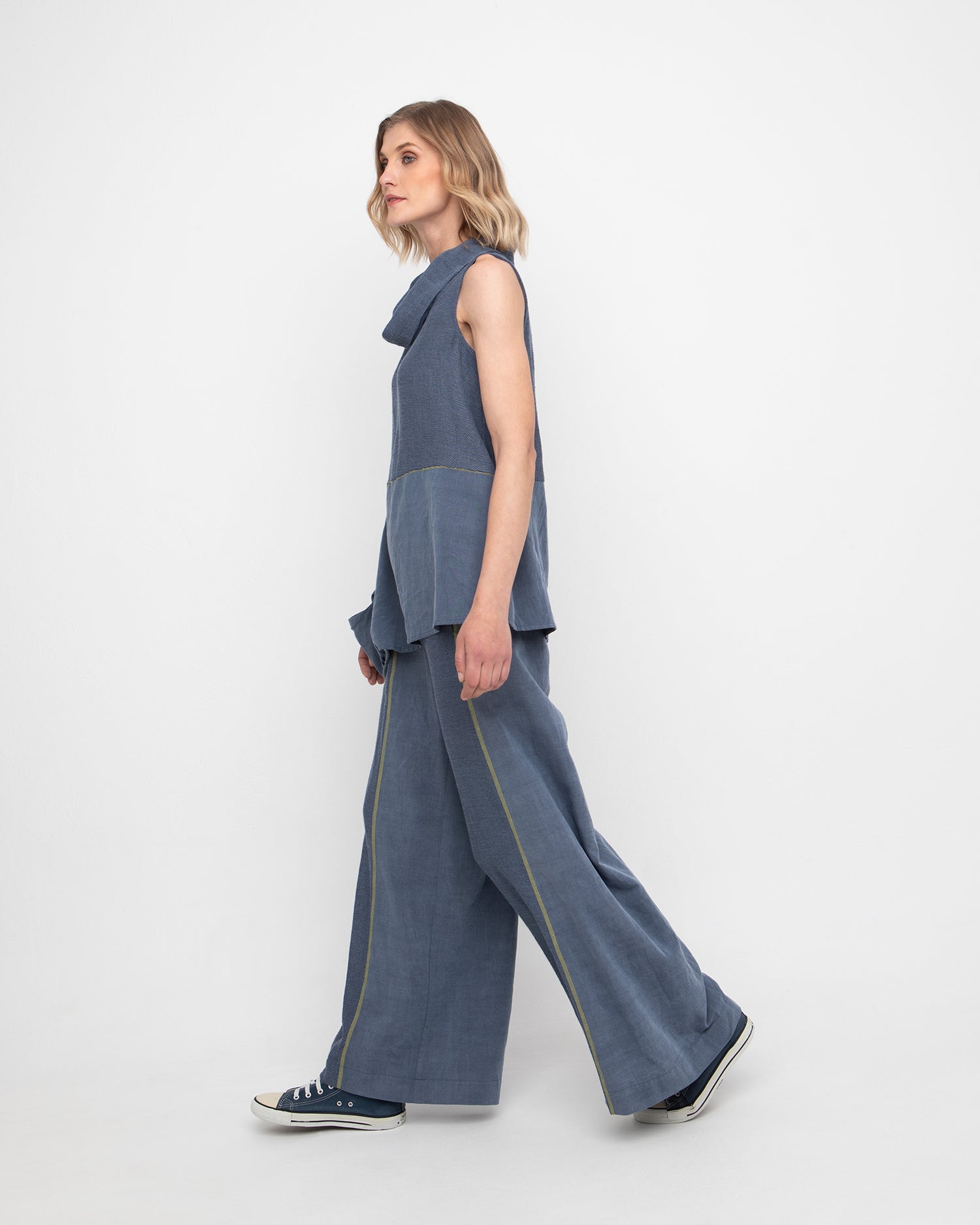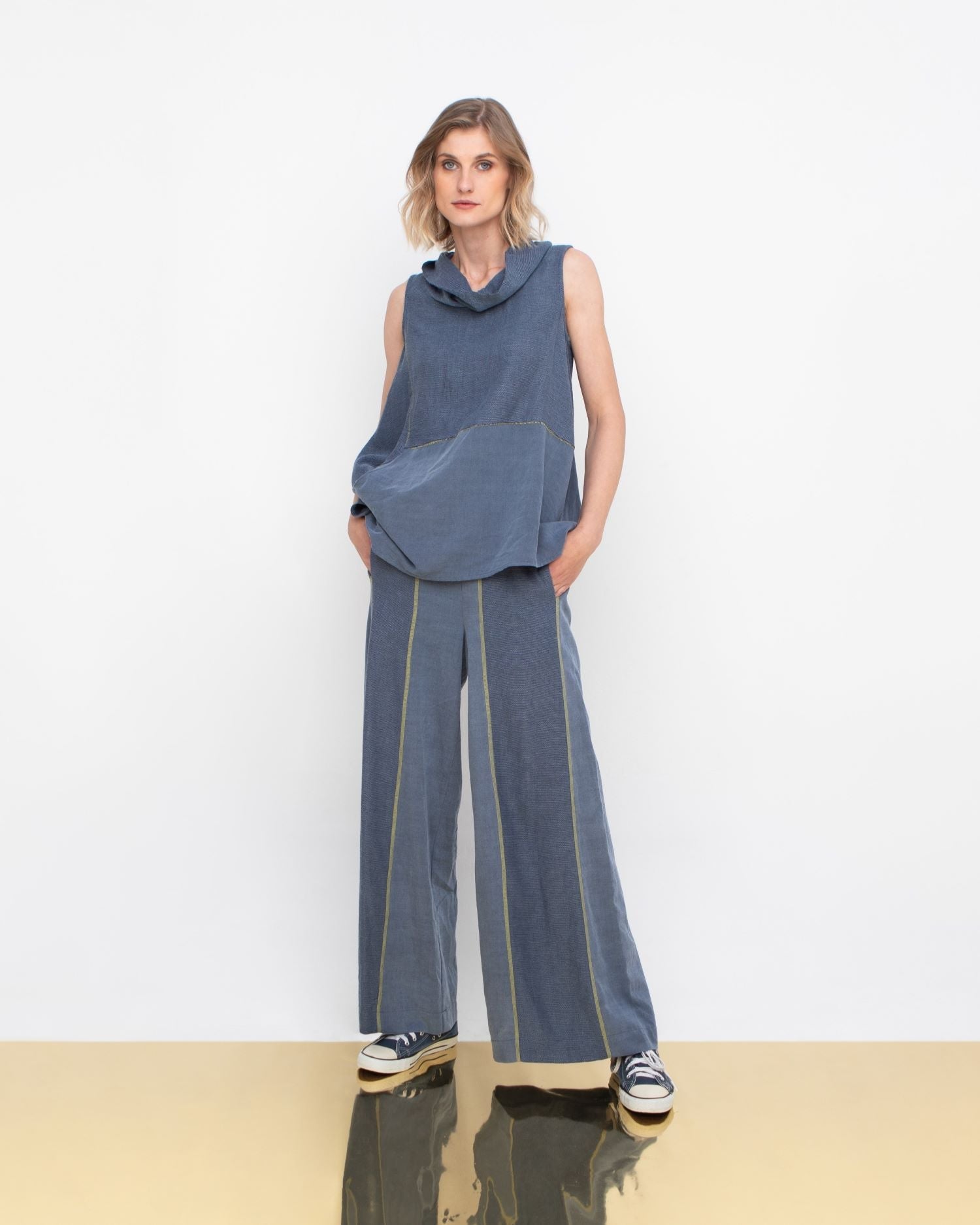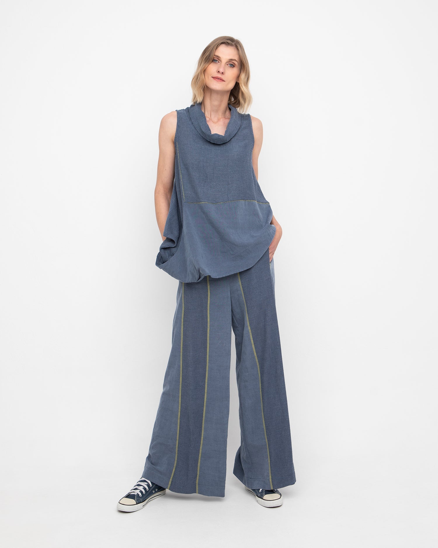 These high-waisted trousers have a wide leg, hidden side pockets, and flat front with elastic back waist plus a zipper. Made in a netted textural woven, these trousers exude a chic, seafaring vibe.