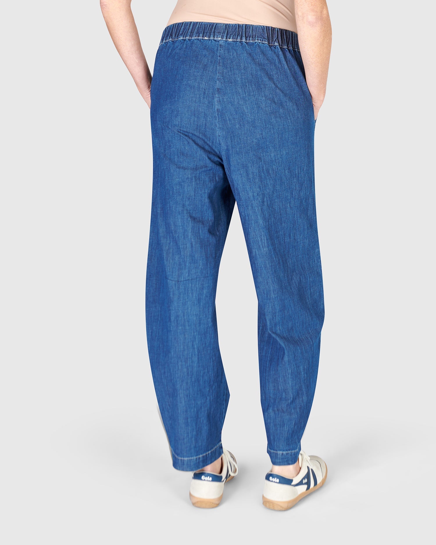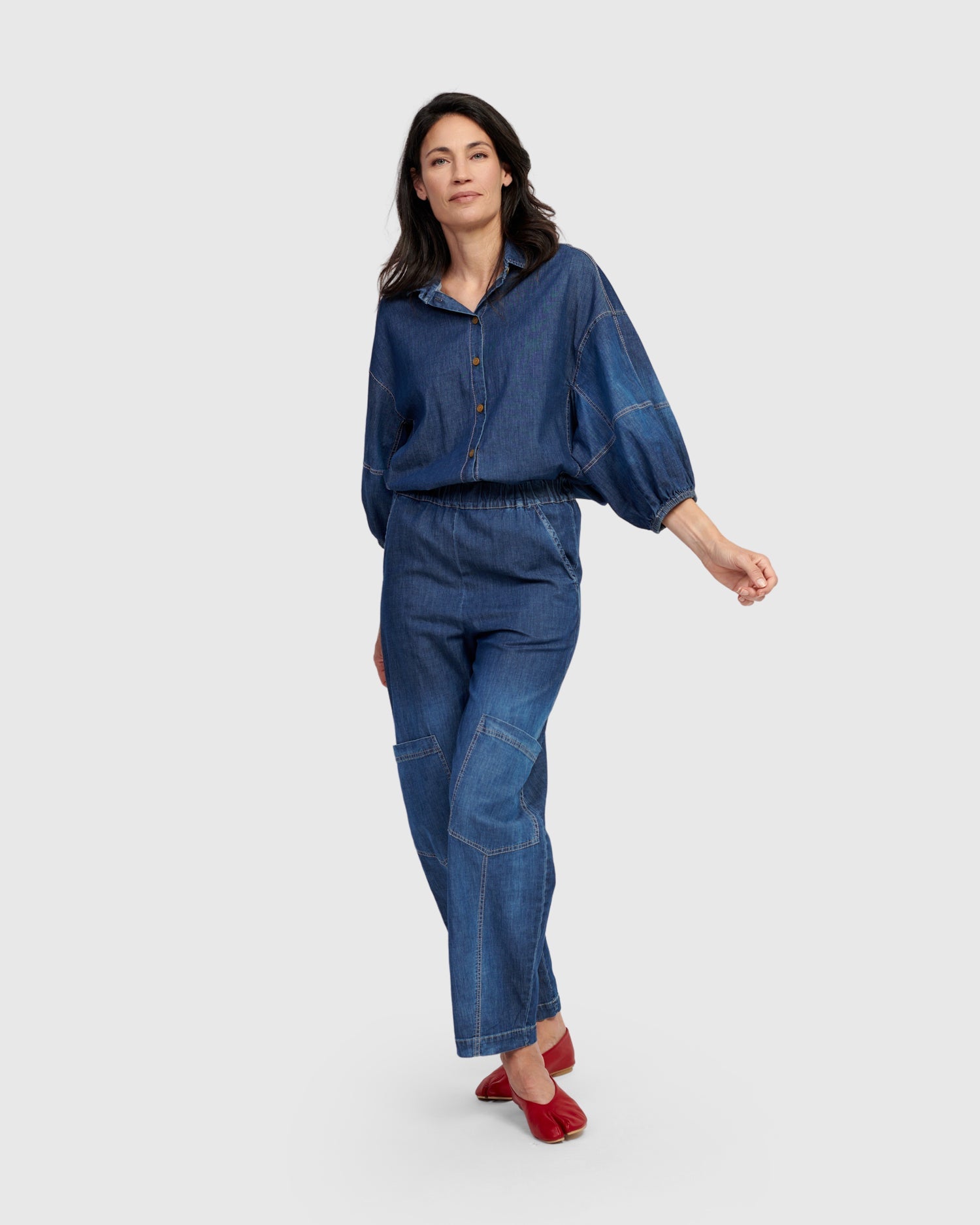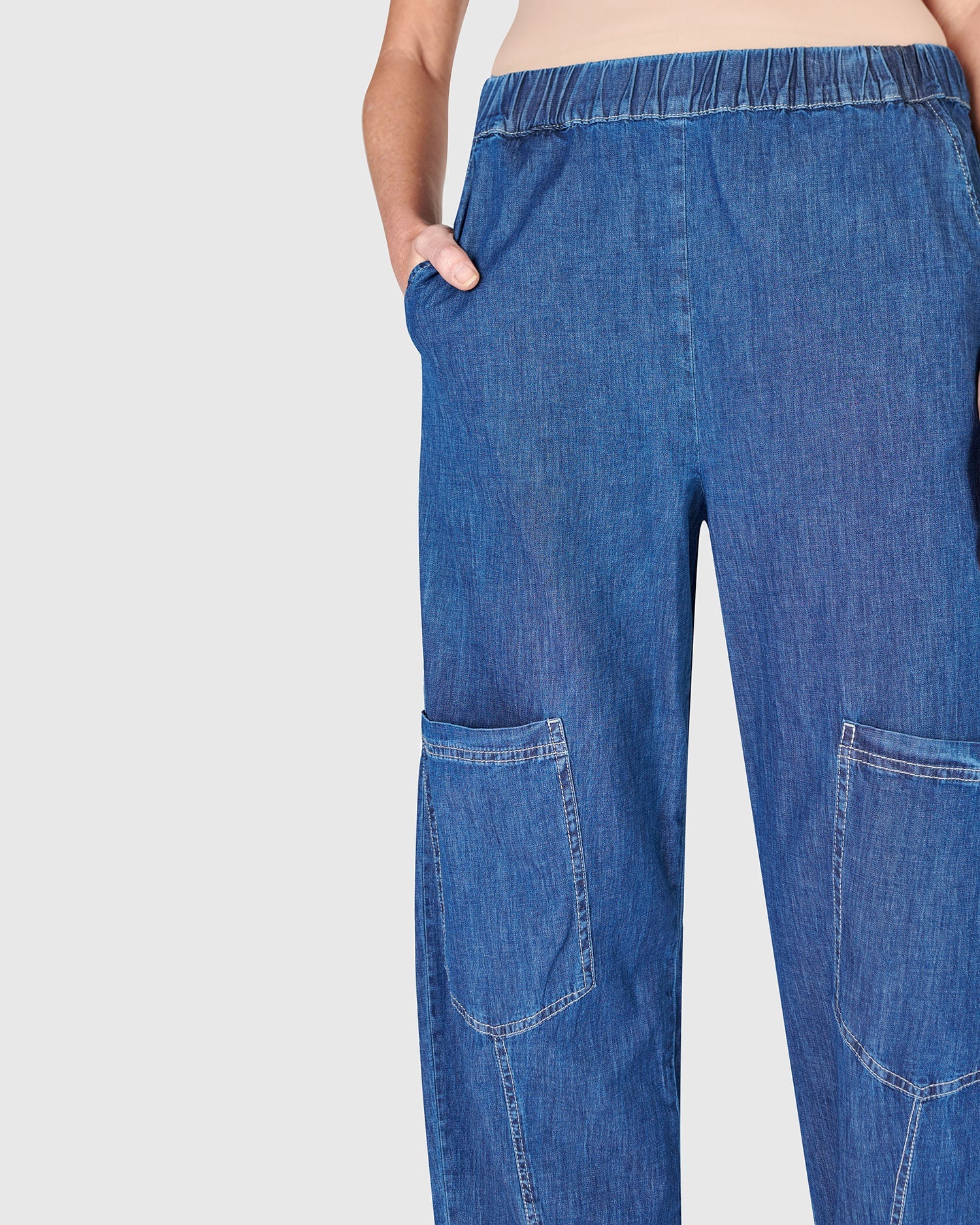 These high-waisted full length pants have an all-around elastic waist, side pockets, and a slim leg that tapers every so slightly at the bottom. Crafted in an easy, relaxed denim. Don't forget the patch pockets at the knees for a cool casual look.