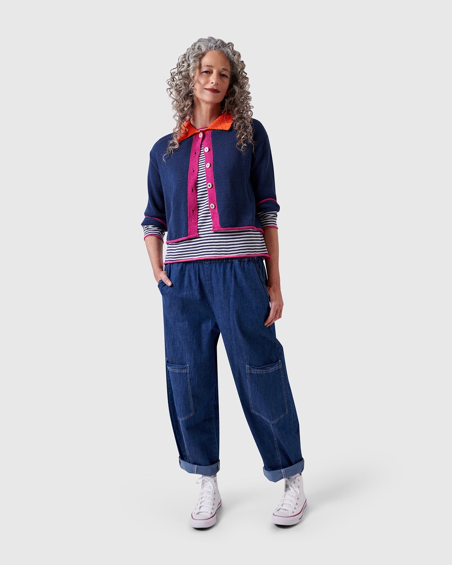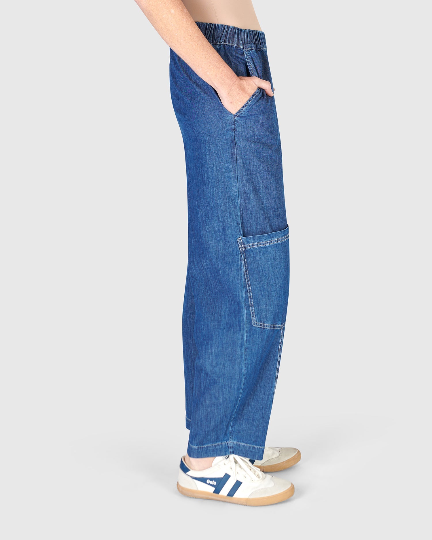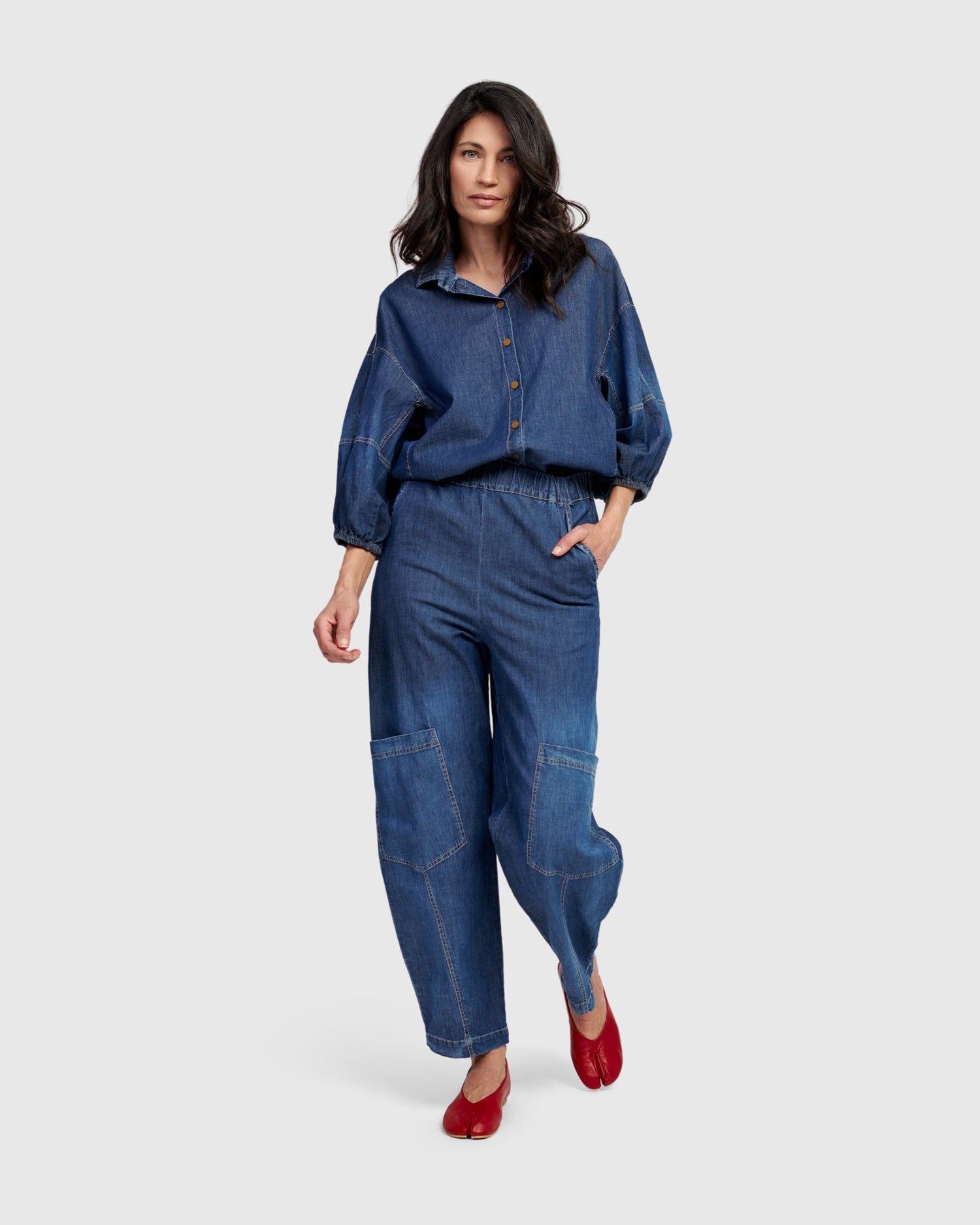 These high-waisted full length pants have an all-around elastic waist, side pockets, and a slim leg that tapers every so slightly at the bottom. Crafted in an easy, relaxed denim. Don't forget the patch pockets at the knees for a cool casual look.
