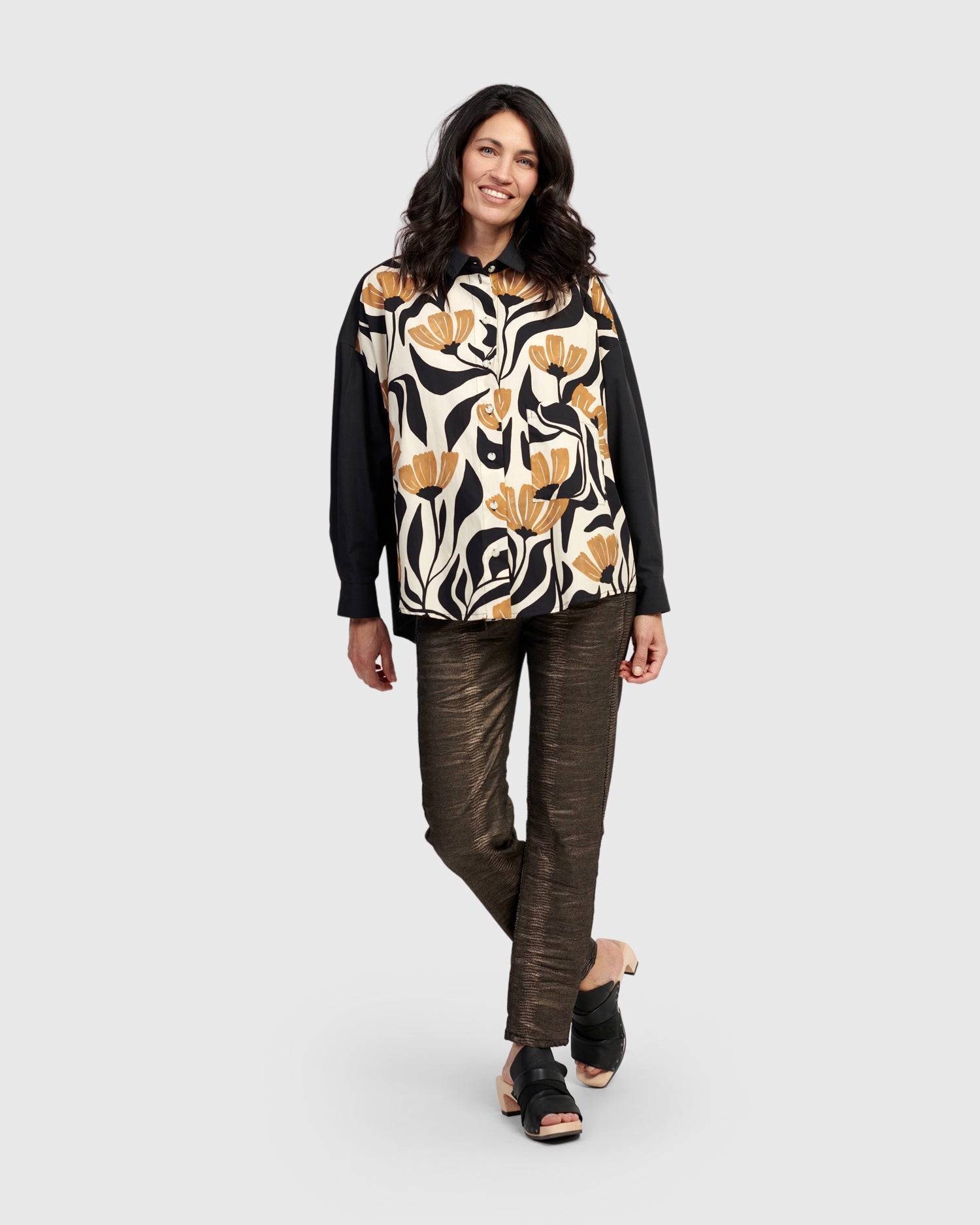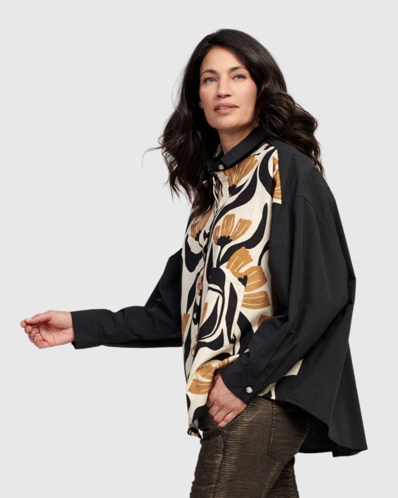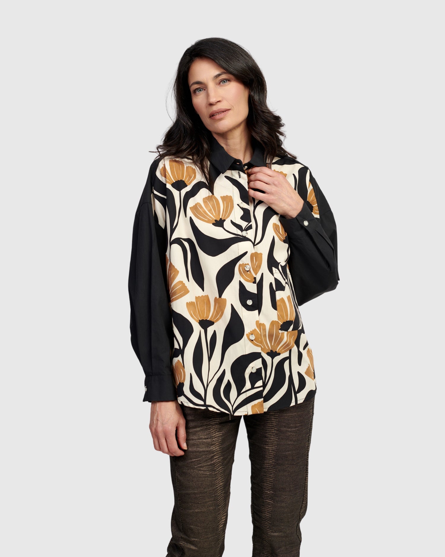 This button down shirt takes on menswear with a feminine twist–it has an oversized, boxy silhouette with a circular hem, plus a floral front with a black back and sleeves. The details: foldover collar, full button placket, front patch pocket, drop shoulder, oversized cuffed sleeves. Made in a crisp cotton poplin.