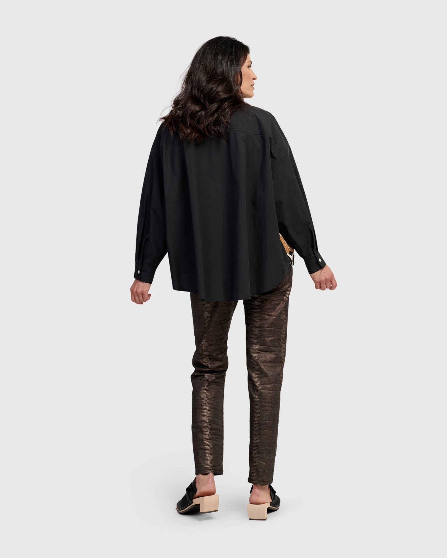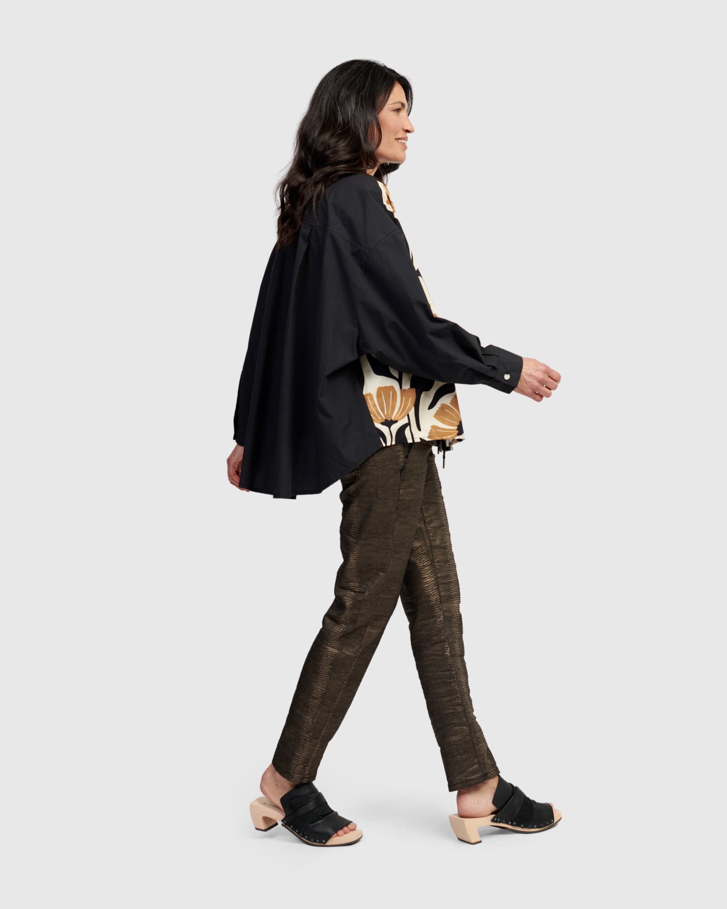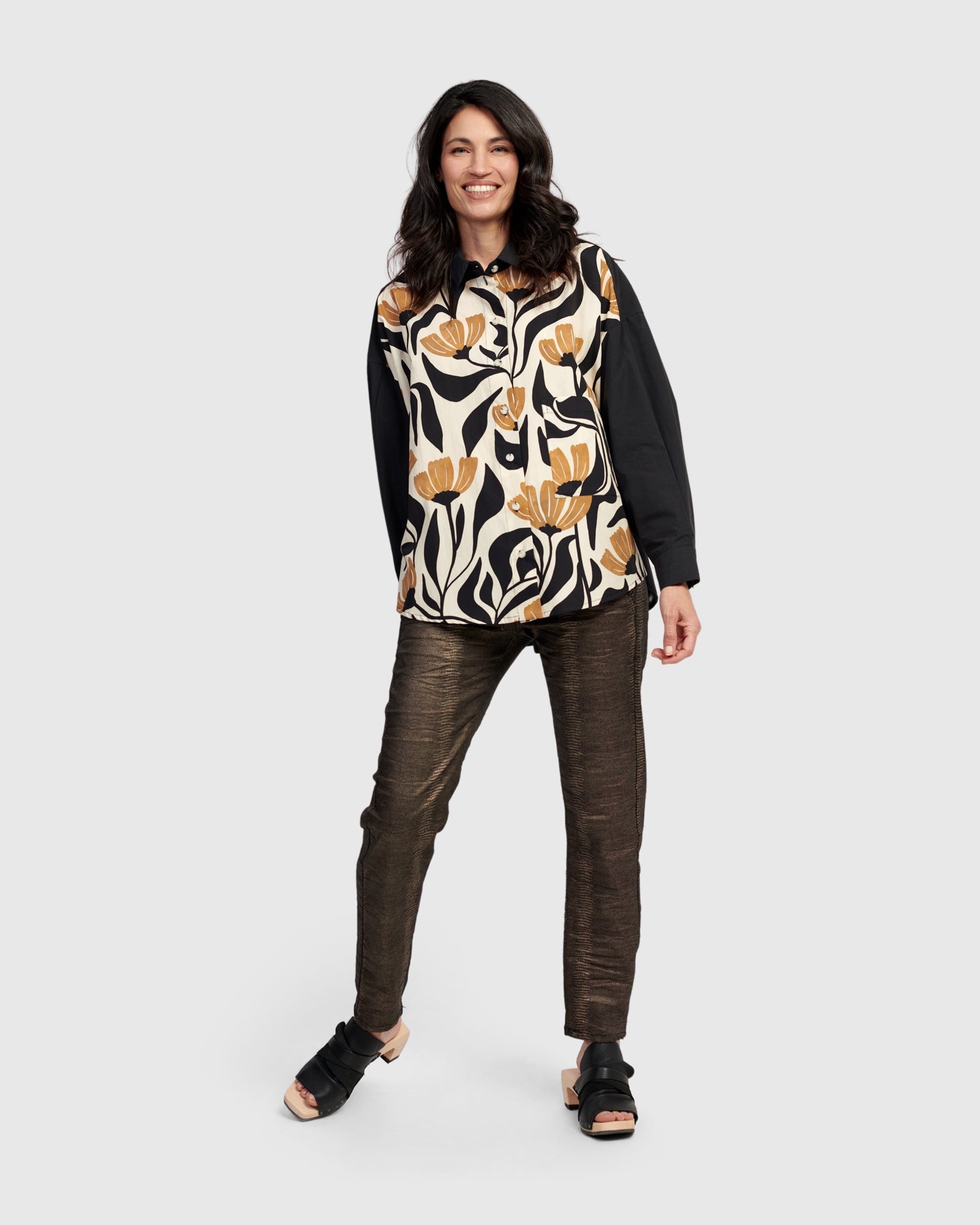 This button down shirt takes on menswear with a feminine twist–it has an oversized, boxy silhouette with a circular hem, plus a floral front with a black back and sleeves. The details: foldover collar, full button placket, front patch pocket, drop shoulder, oversized cuffed sleeves. Made in a crisp cotton poplin.
