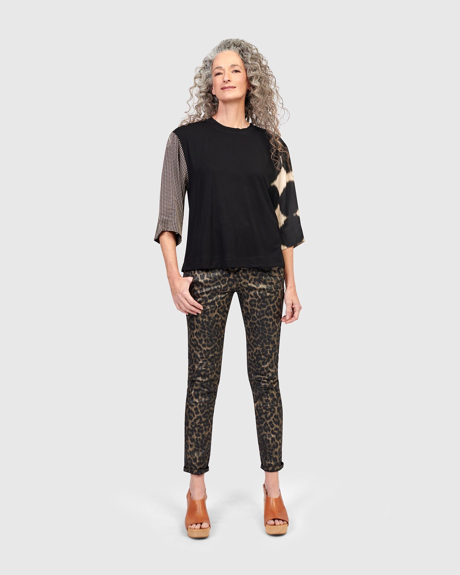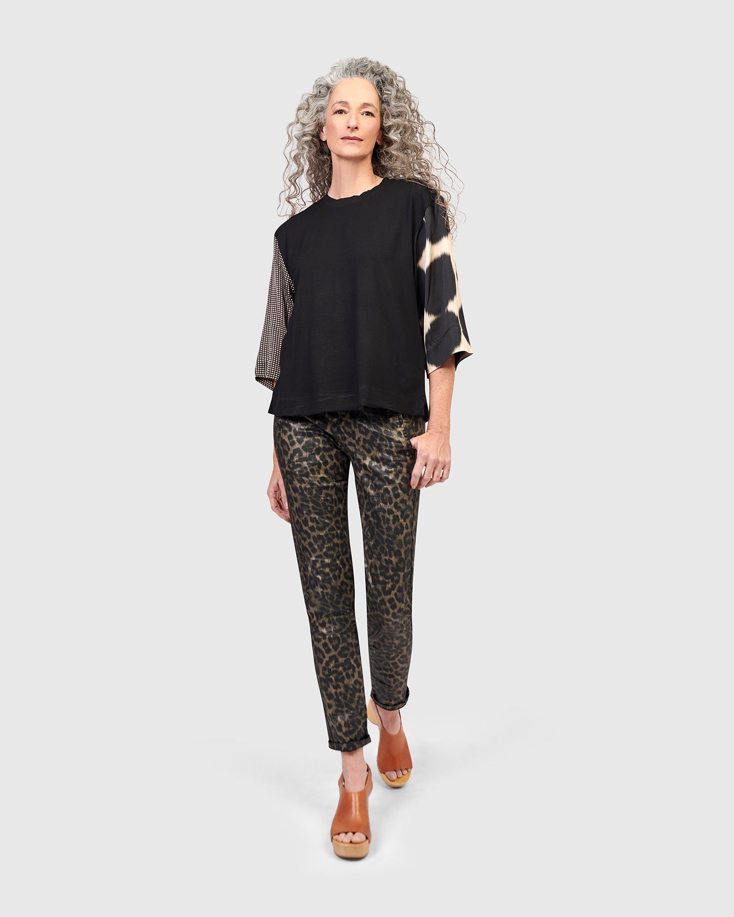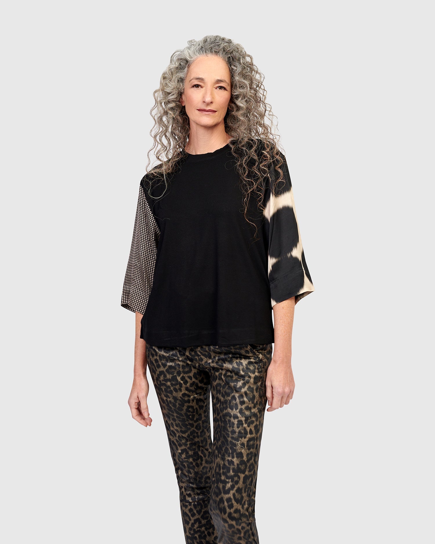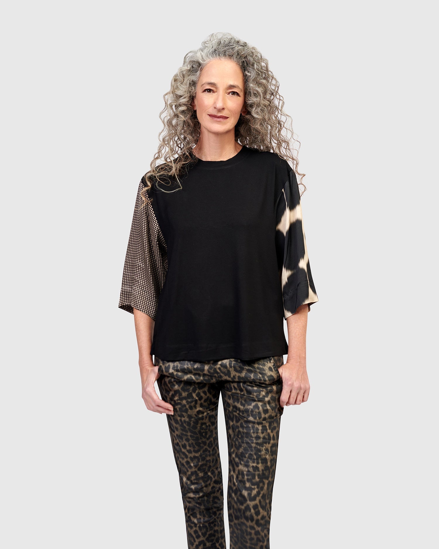 This easy pullover tee is all dressed up with three-quarter length silky woven sleeves. It has a crew neck and is made in a stretch jersey knit. It has a relaxed fit and boxy silhouette that falls just at the hip.