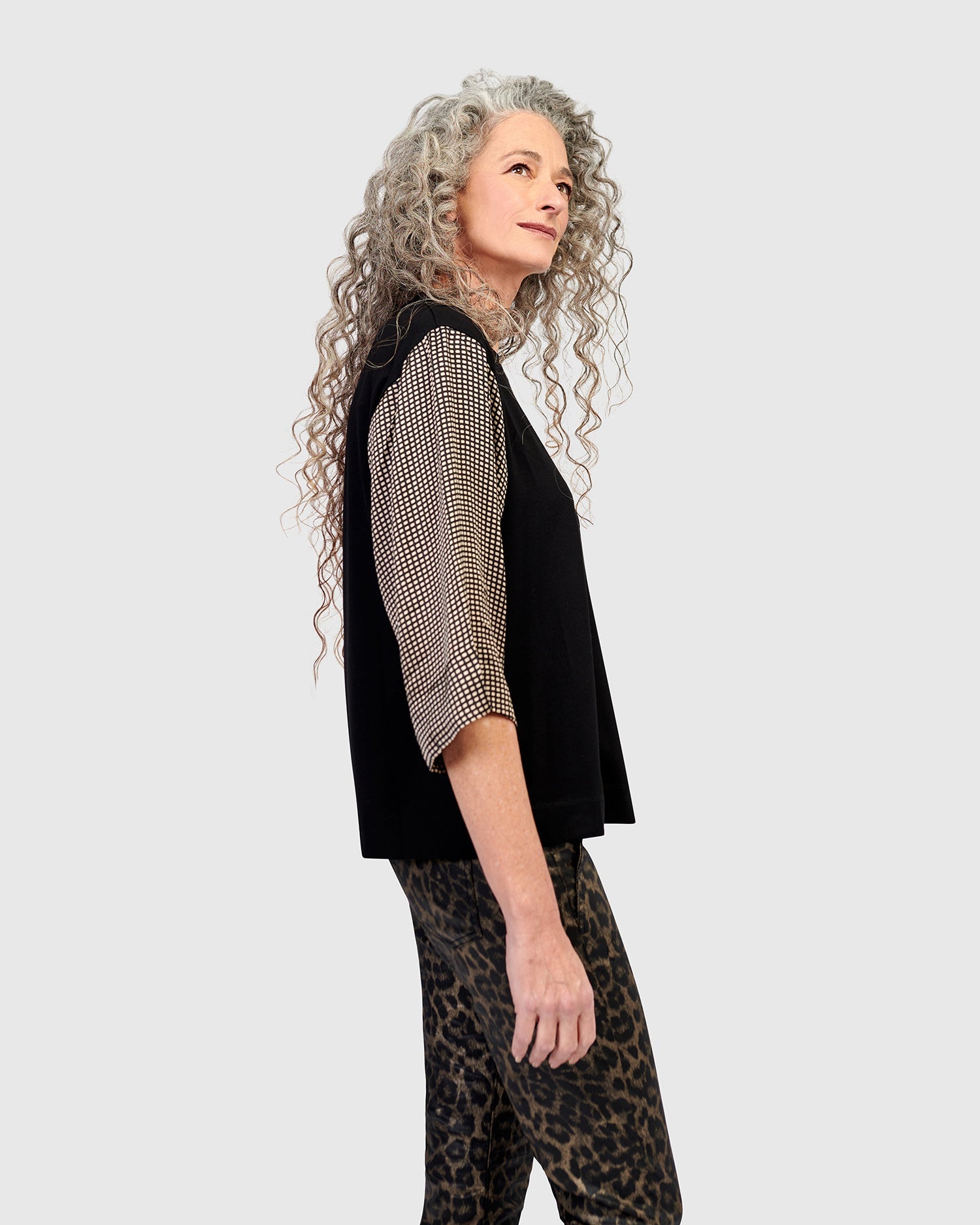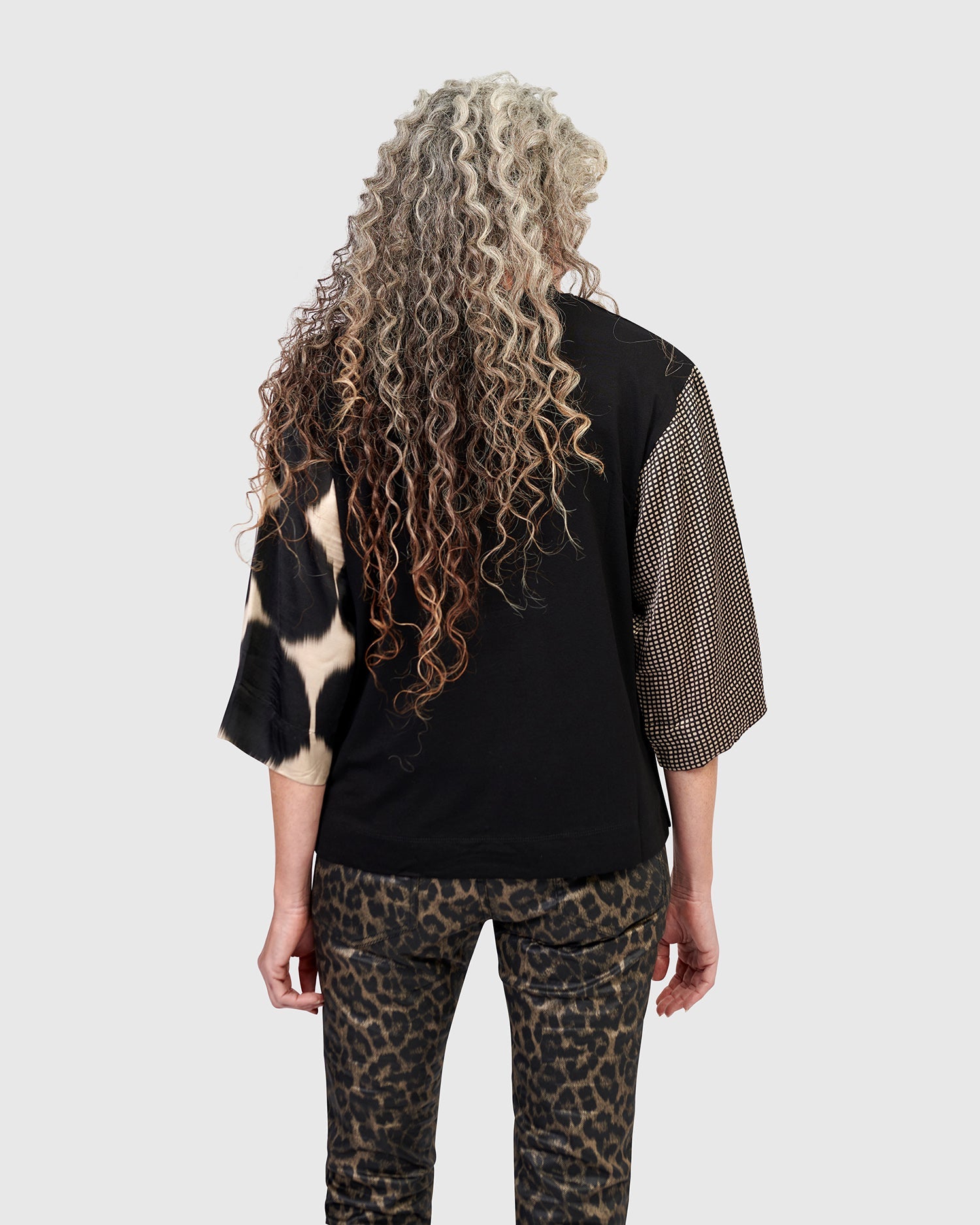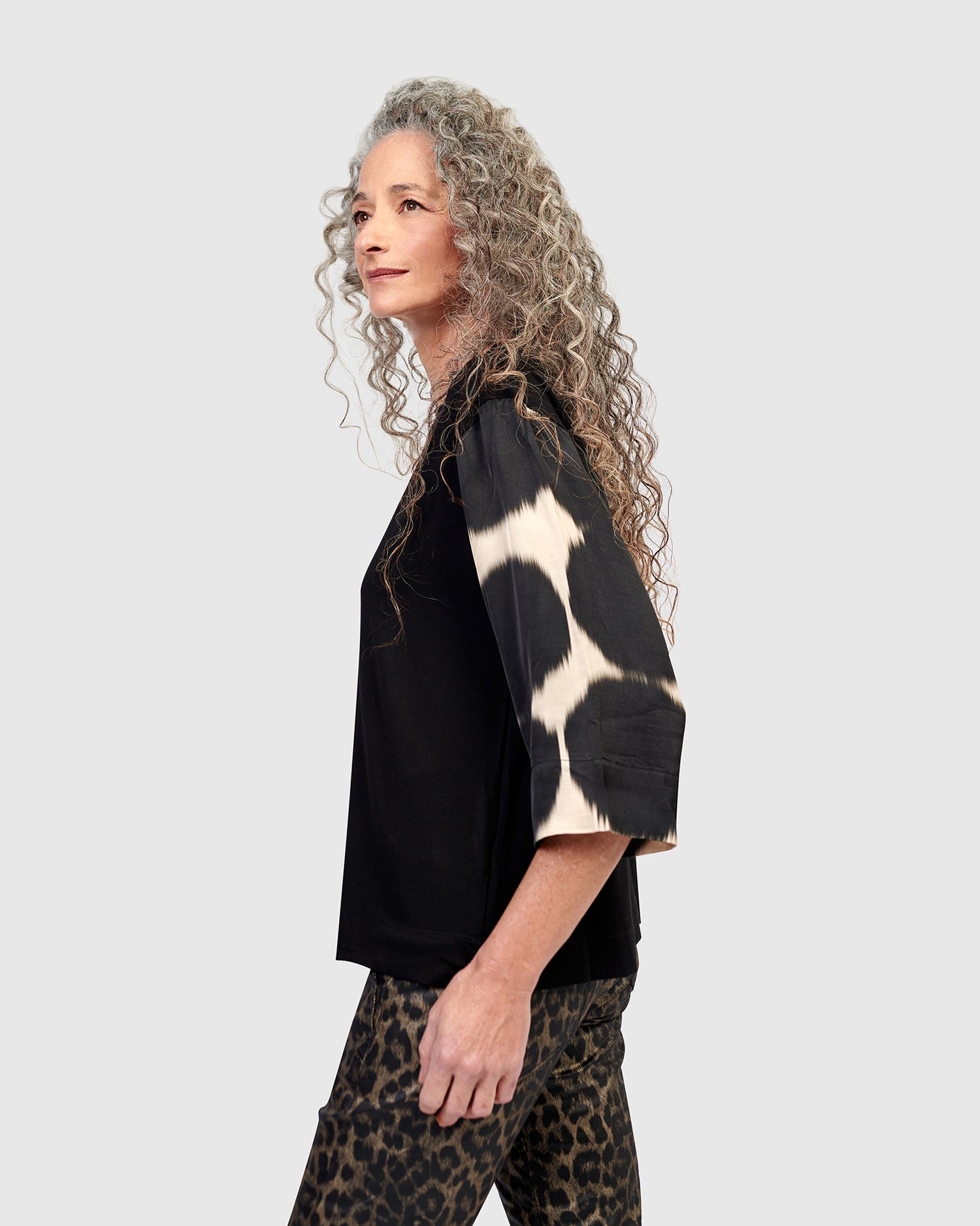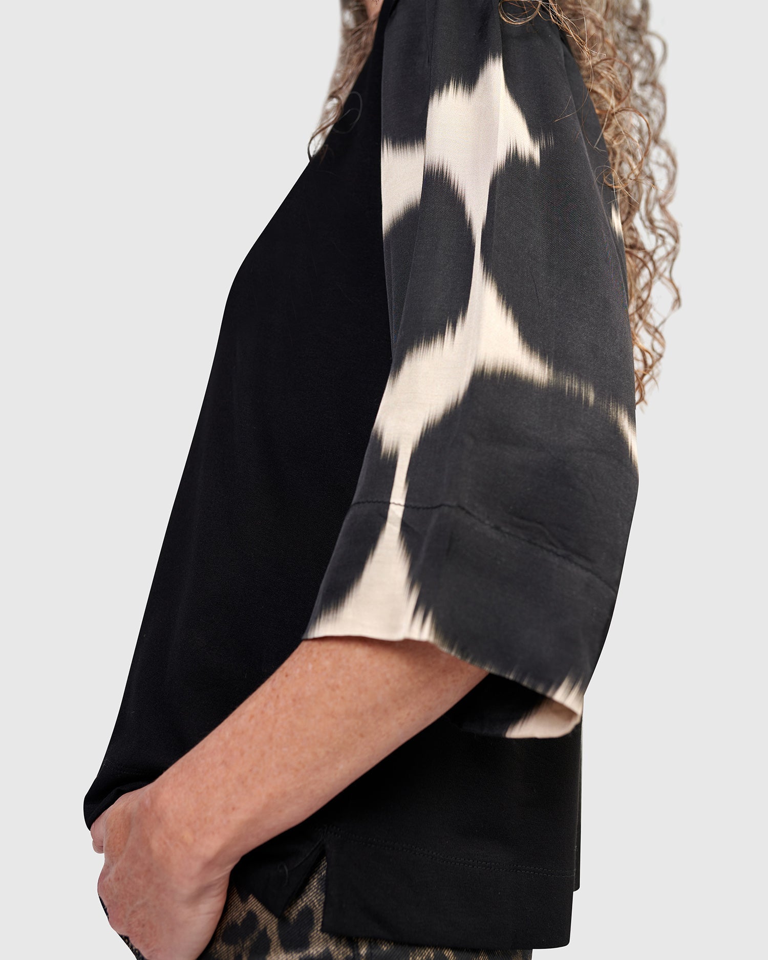This easy pullover tee is all dressed up with three-quarter length silky woven sleeves. It has a crew neck and is made in a stretch jersey knit. It has a relaxed fit and boxy silhouette that falls just at the hip.