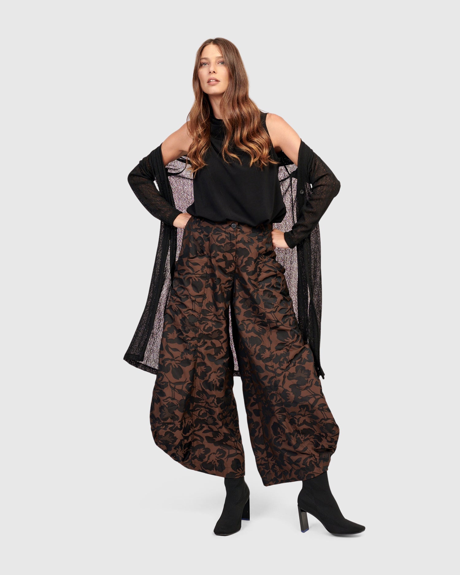 Evening wear meets signature style in our favorite Punto Pants, a best seller for good reason! These floral beauties are made in a swishy midweight woven fabric with a flat front waist with zipper and button closure, elastic back, pockets and signature architectural hem.