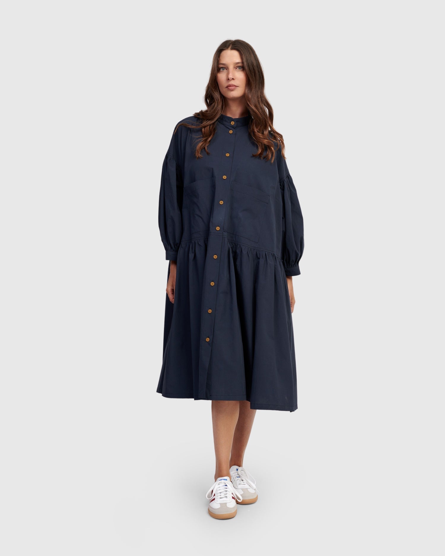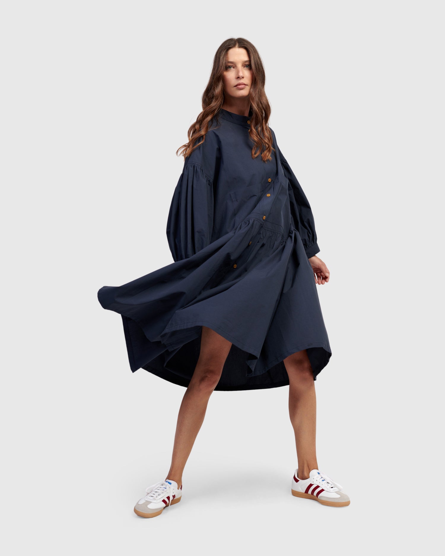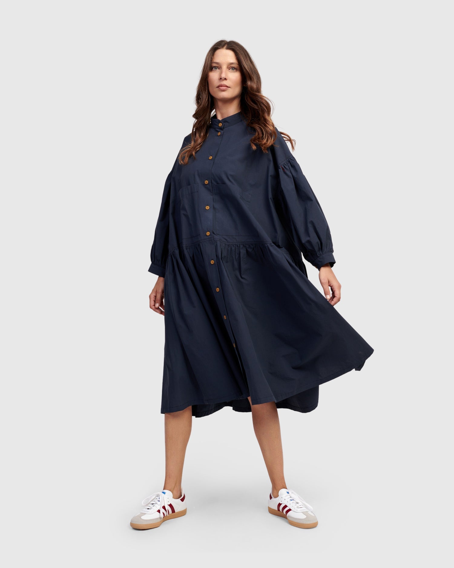 Too cool for school? Not here! This study-savvy style channels both a scholarly vibe with classic Alembika flair (see: classic men's shirting with a feminine twist) Made in a breathable cotton poplin, this oversized shirt dress has an A-line silhouette with a gathered drop waist, Mandarin collar with full button placket, three quarter length gathered puff sleeves, and front patch pockets.