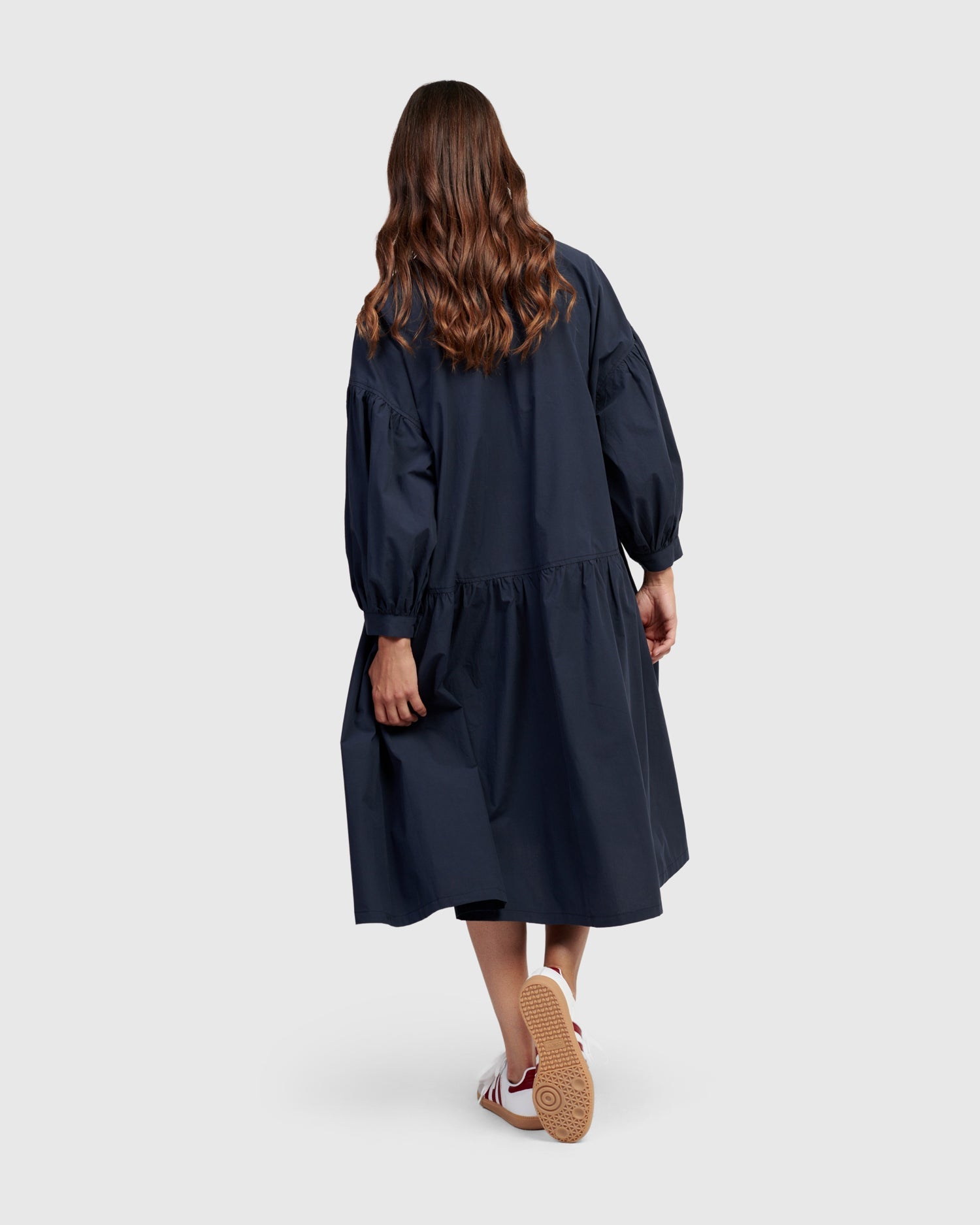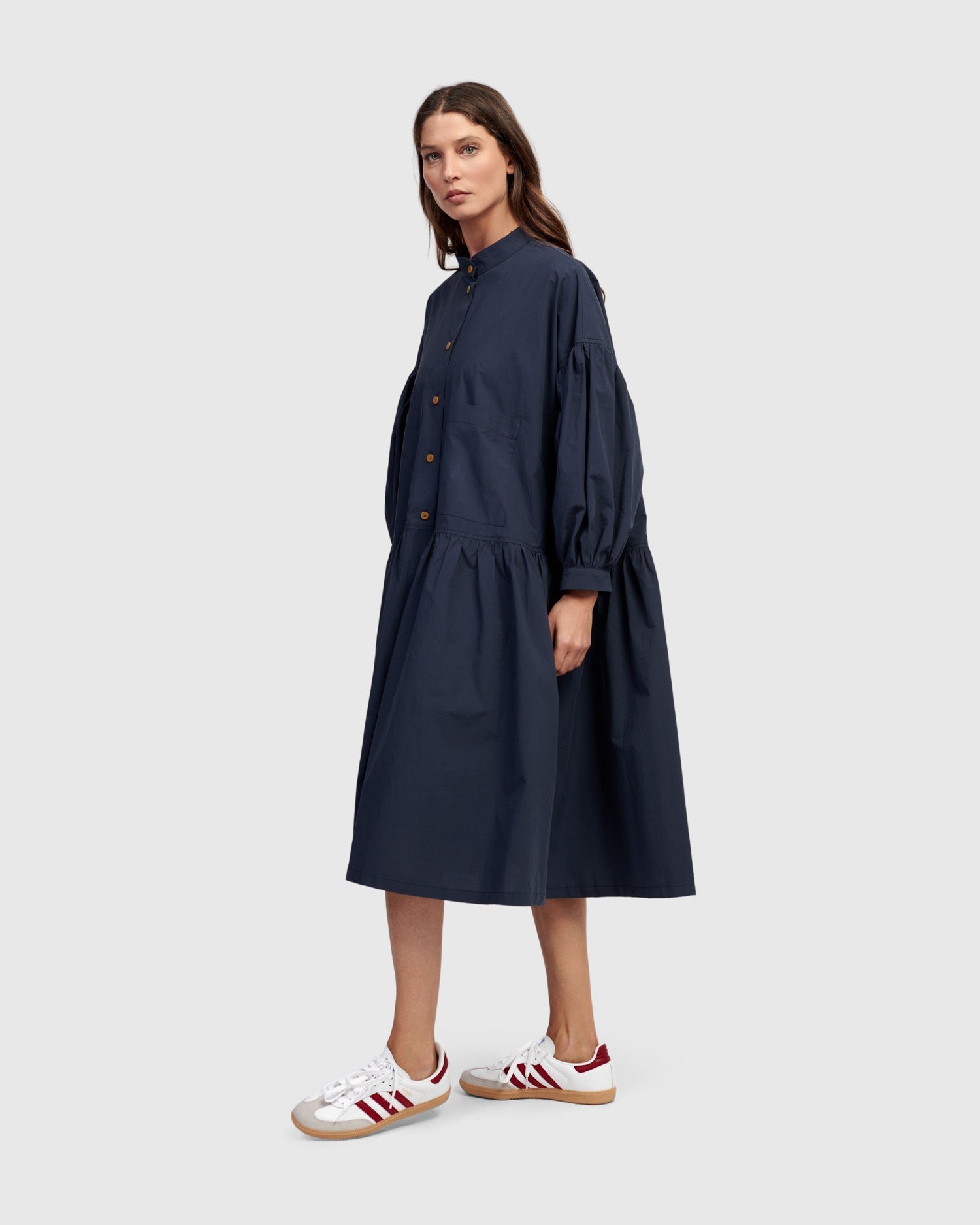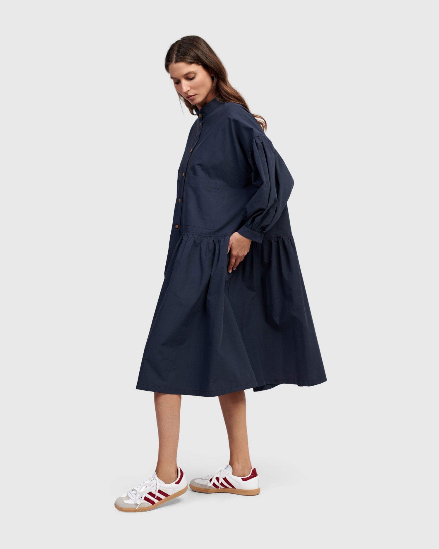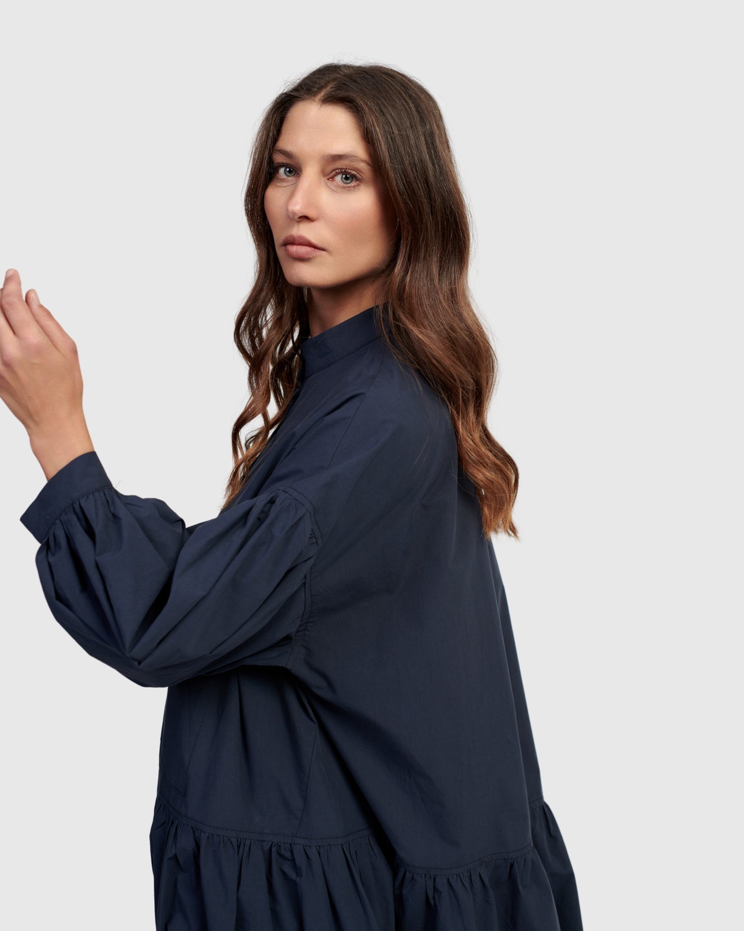 Too cool for school? Not here! This study-savvy style channels both a scholarly vibe with classic Alembika flair (see: classic men's shirting with a feminine twist) Made in a breathable cotton poplin, this oversized shirt dress has an A-line silhouette with a gathered drop waist, Mandarin collar with full button placket, three quarter length gathered puff sleeves, and front patch pockets.