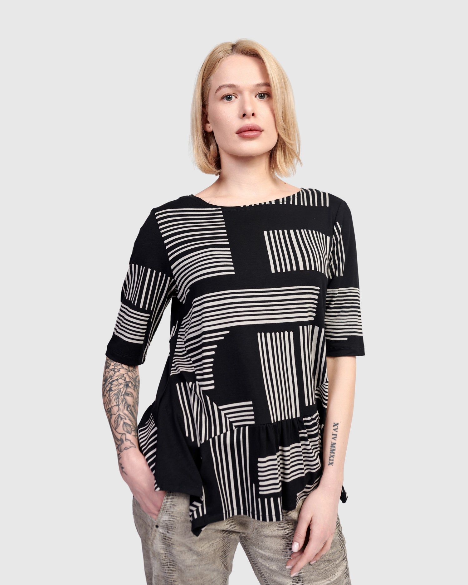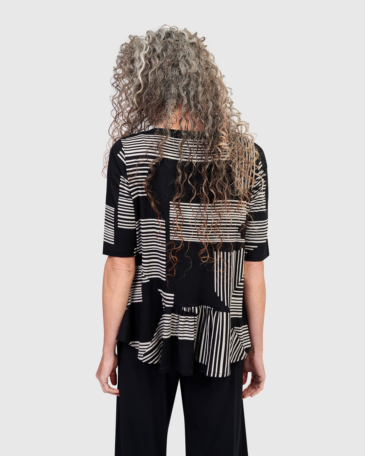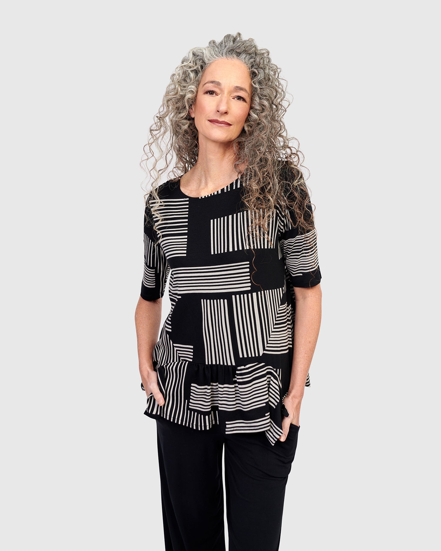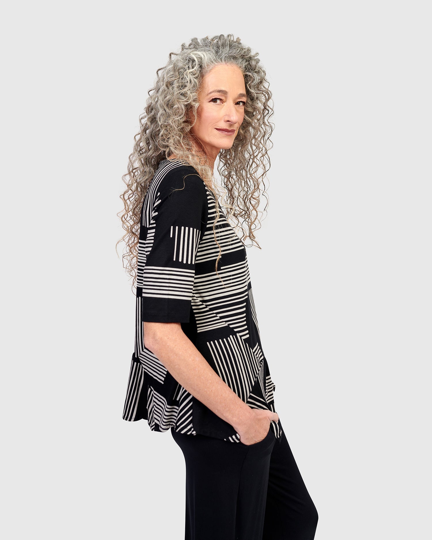 This fitted tee is made in a stretchy jersey knit and has a wide crew neck, elbow length sleeves, and A-line silhouette with flouncy hem in front and back. Hip length with plenty of swing.