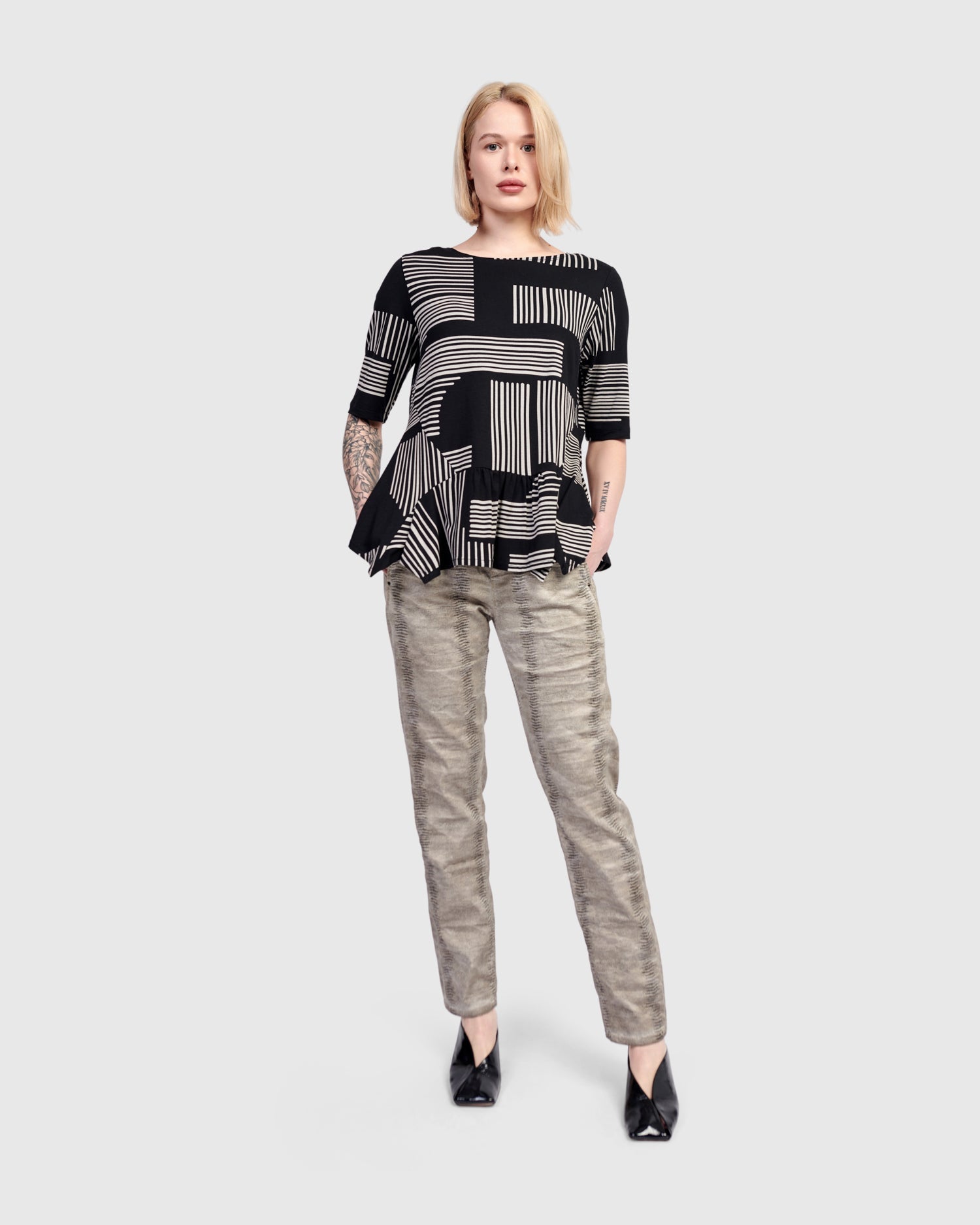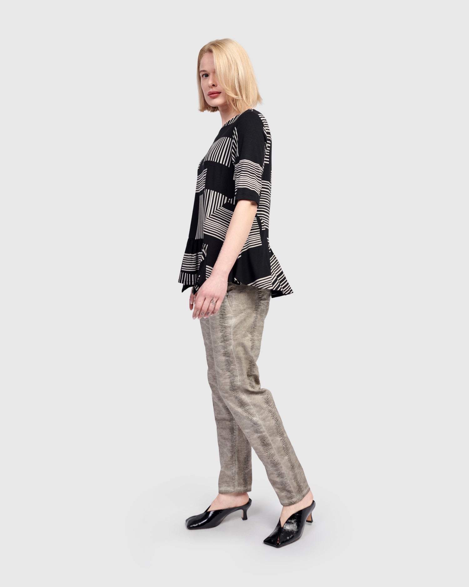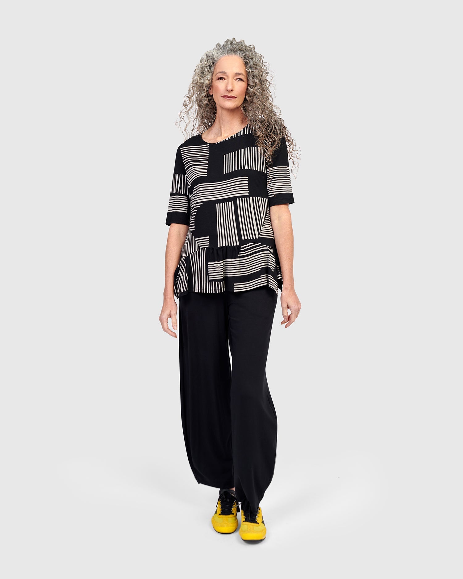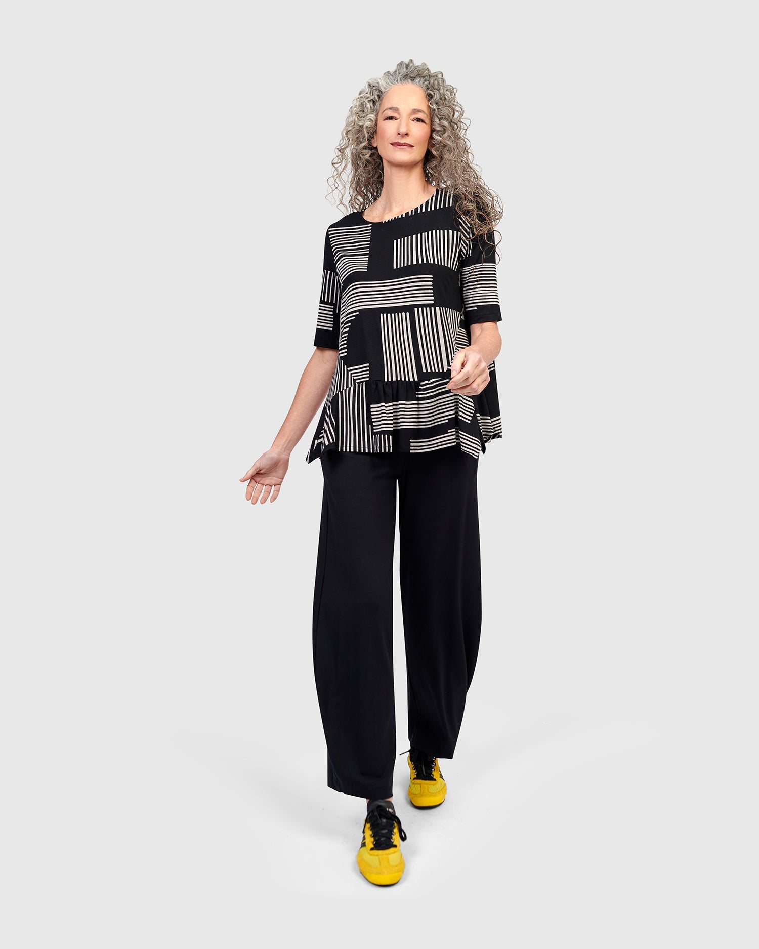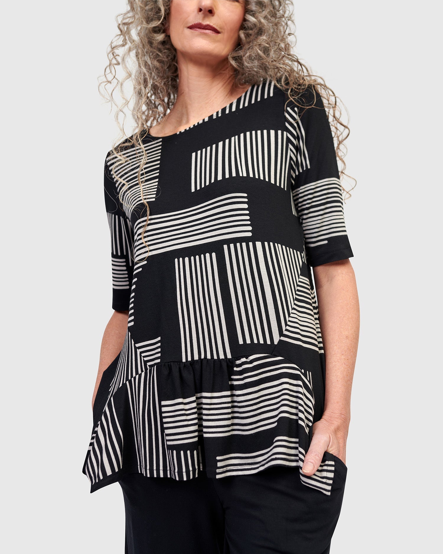 This fitted tee is made in a stretchy jersey knit and has a wide crew neck, elbow length sleeves, and A-line silhouette with flouncy hem in front and back. Hip length with plenty of swing.