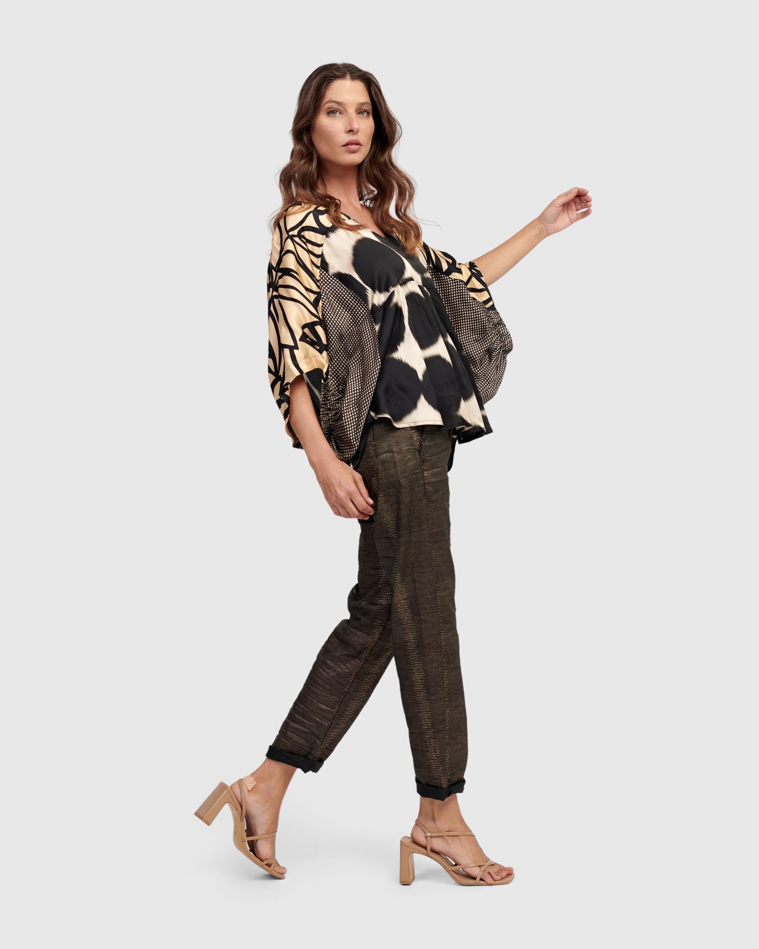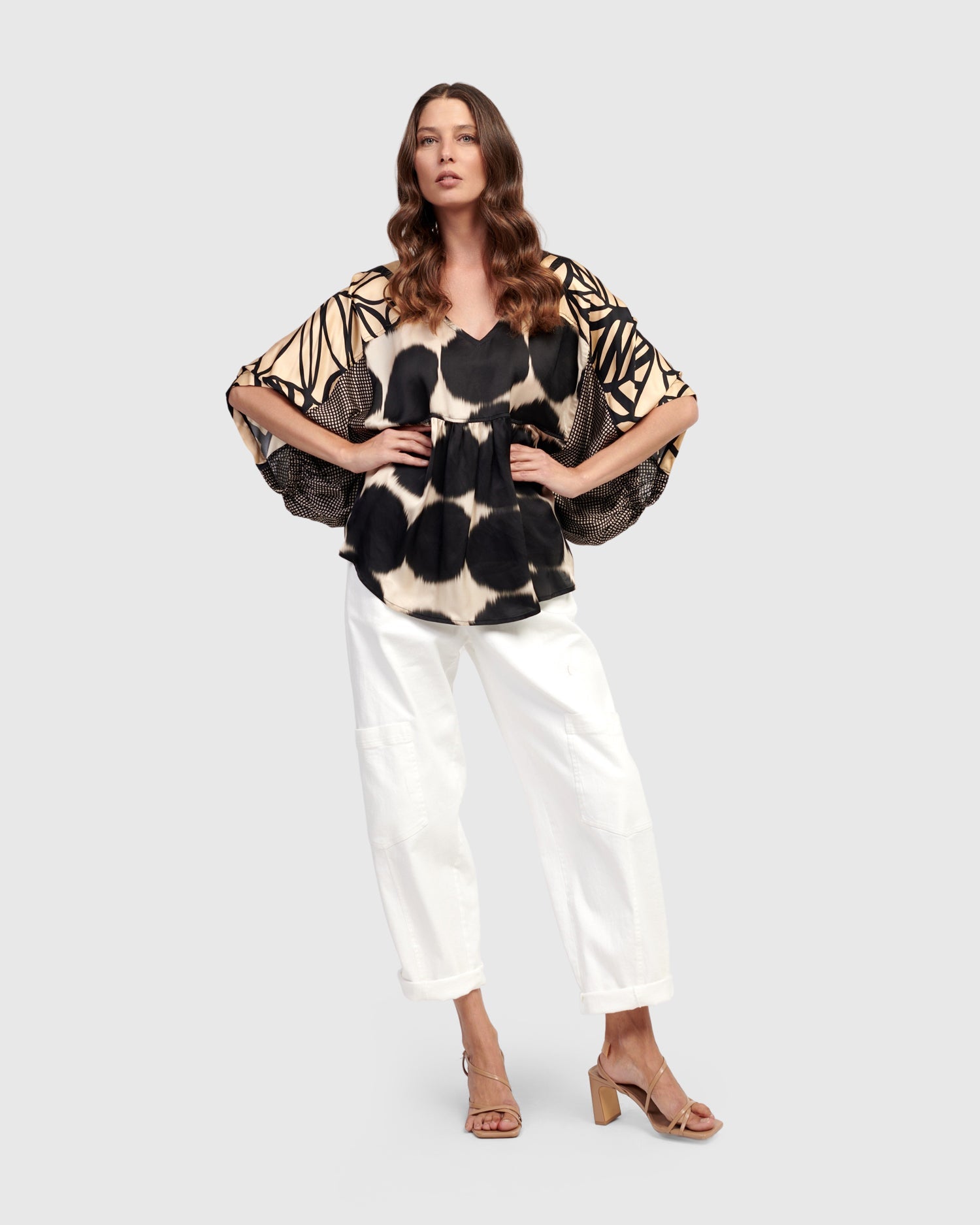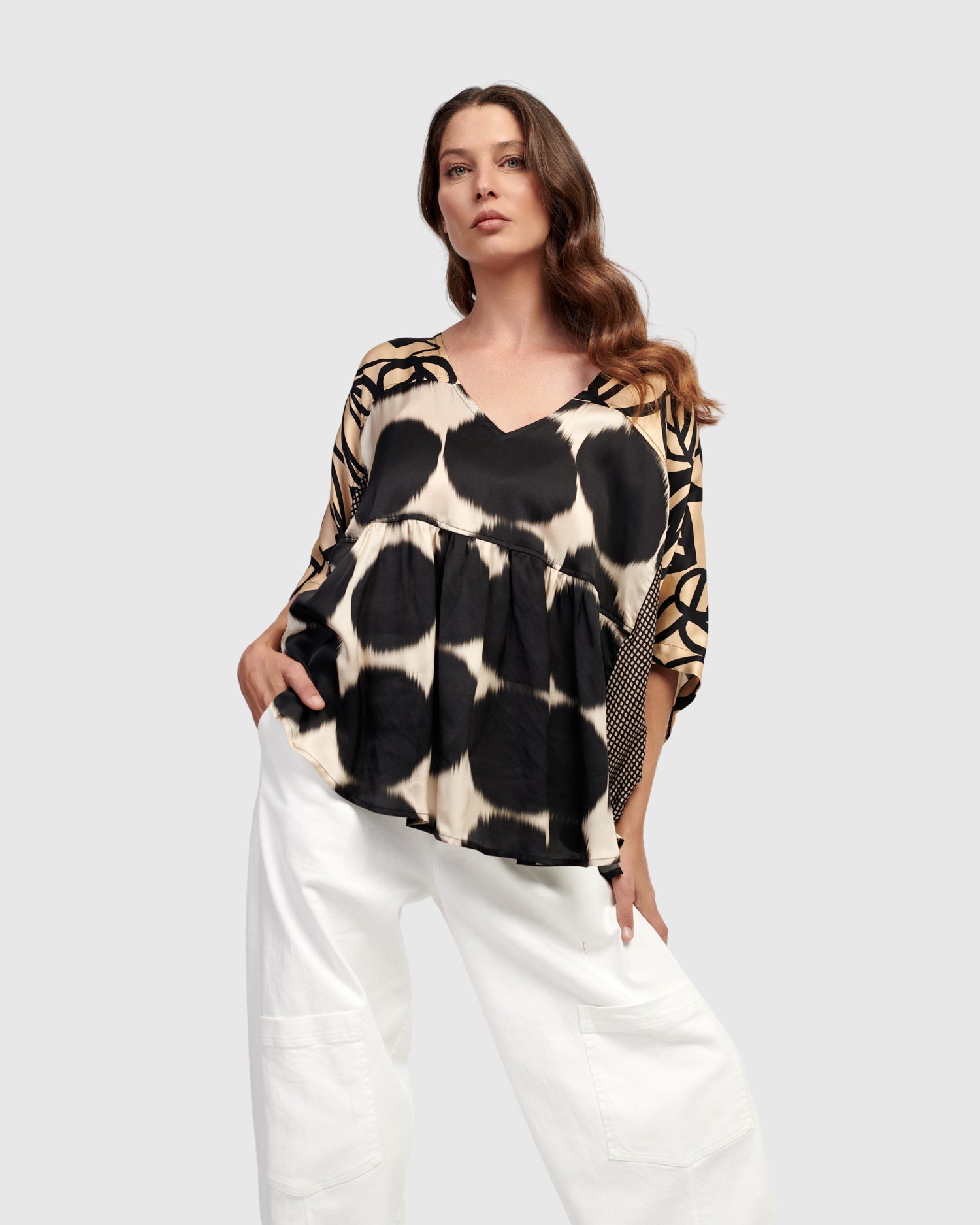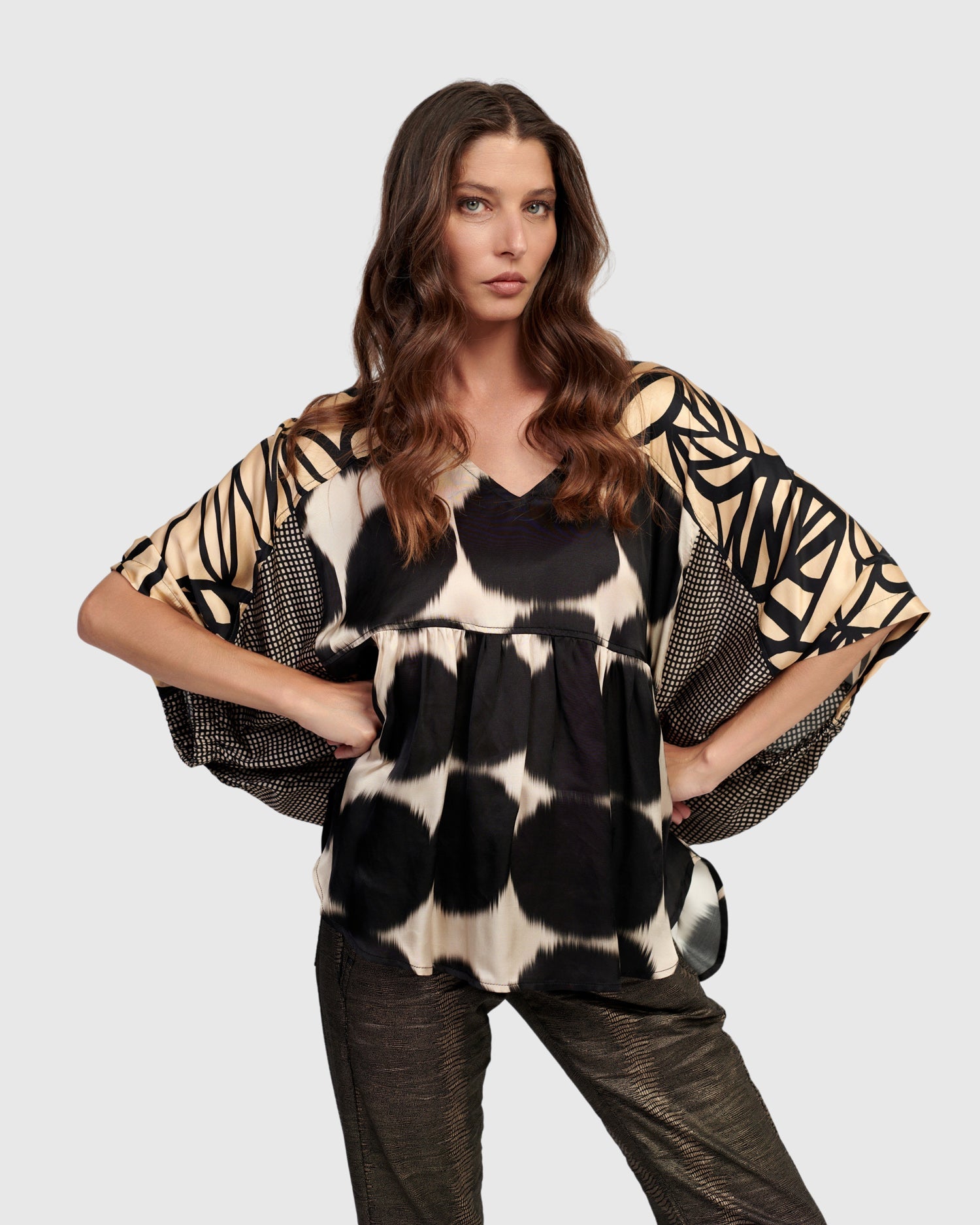 The sky's the limit in this mixed print butterfly sleeve blouse. Made in a satin-feel woven fabric, it has a V-neck, oversized and rounded elasticized silky sleeves, a gathered babydoll waist and rounded bottom hem that lends to the perfect drape. The loose fit, boxy silhouette offers plenty of comfort while the draped fabric and shape make this a chic option.