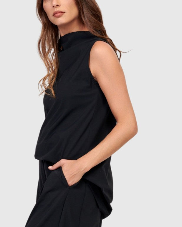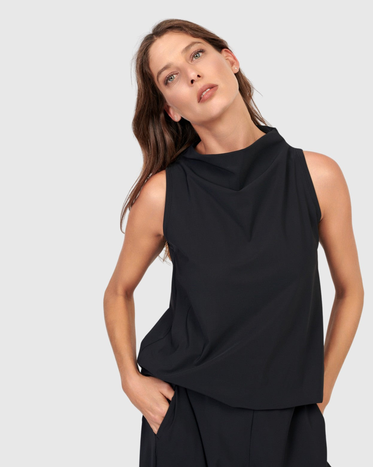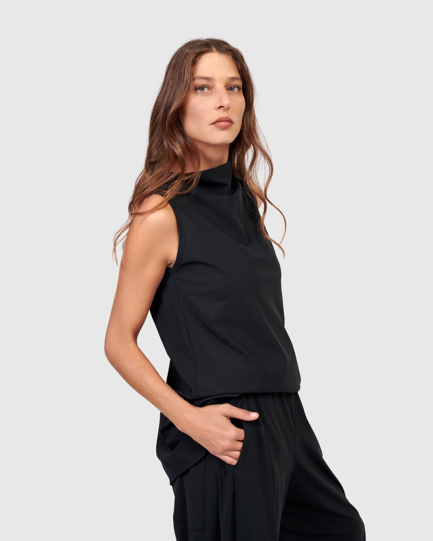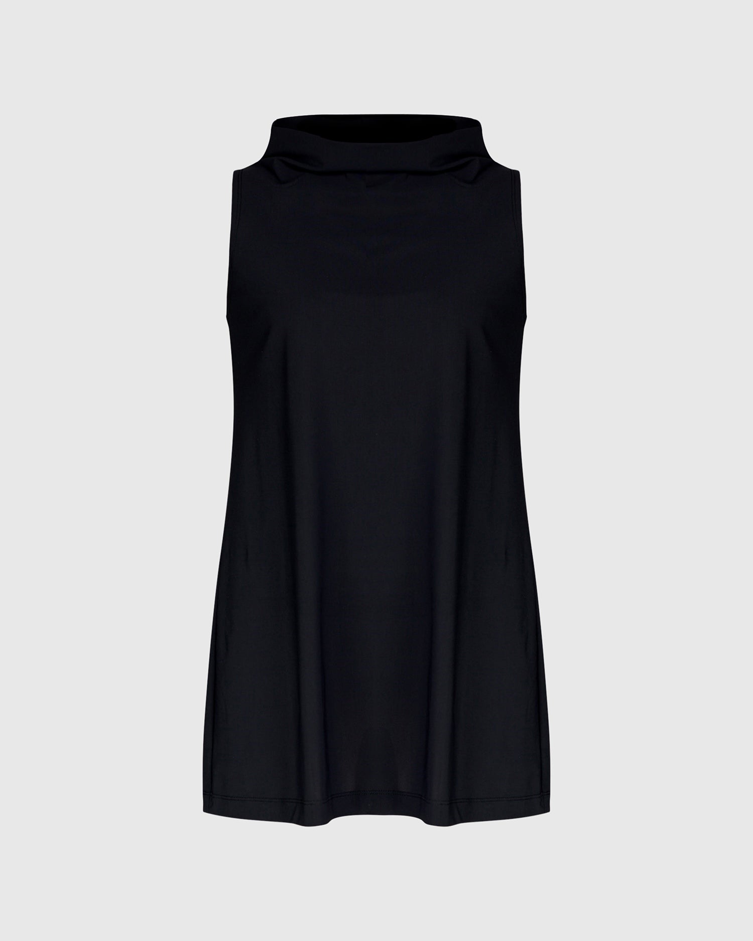 Your newest closet staple is here in sleek, breathable TECHNO. This sleeveless top has a funnel neck and slim A-line silhouette that falls to a tunic length. The relaxed fit lends to so many easy, low-effort styling options while maintaining an overall chic look.