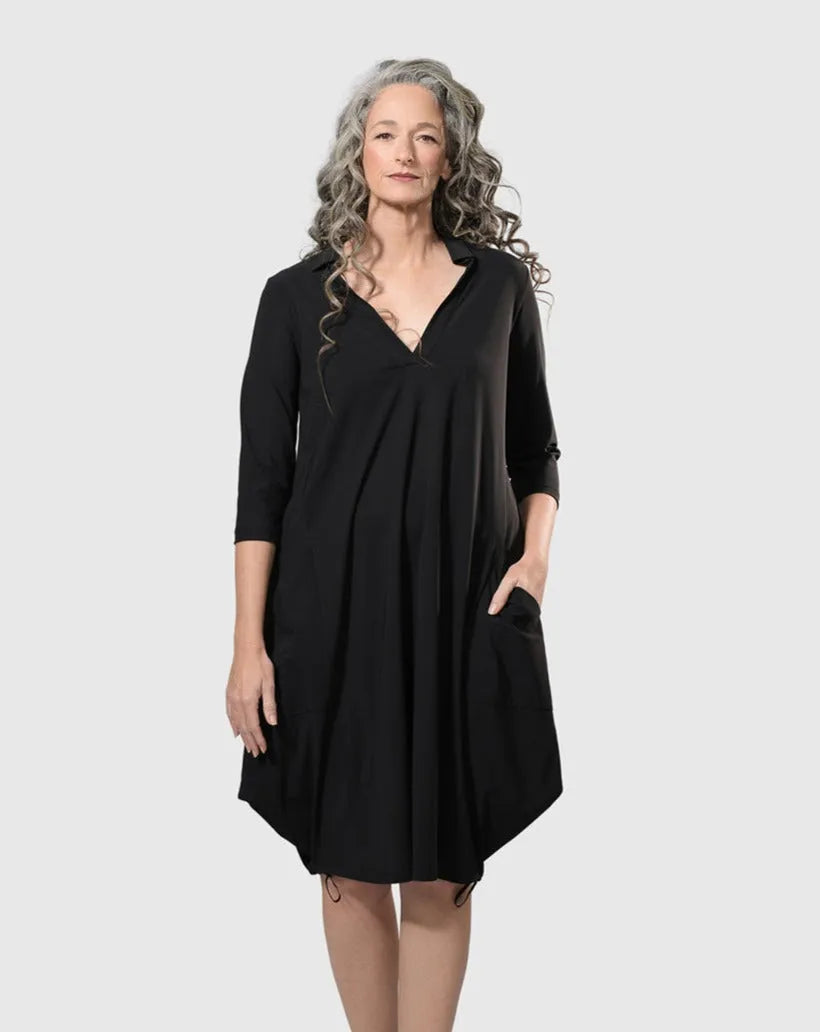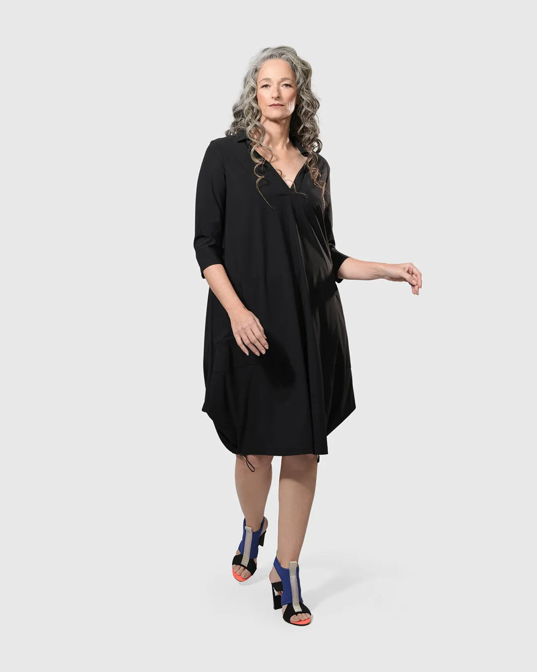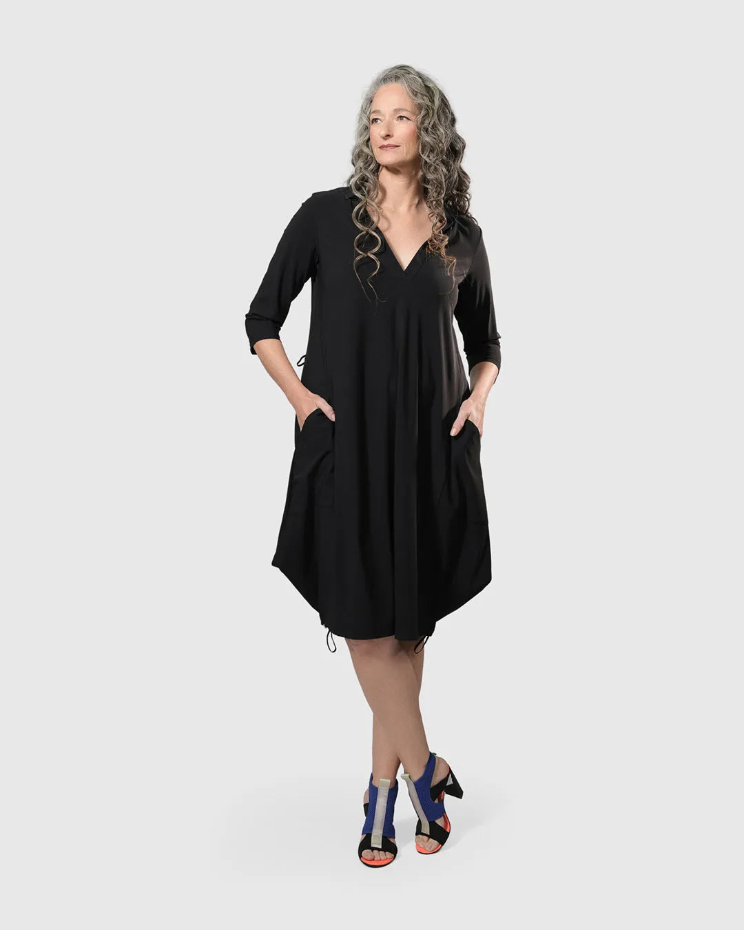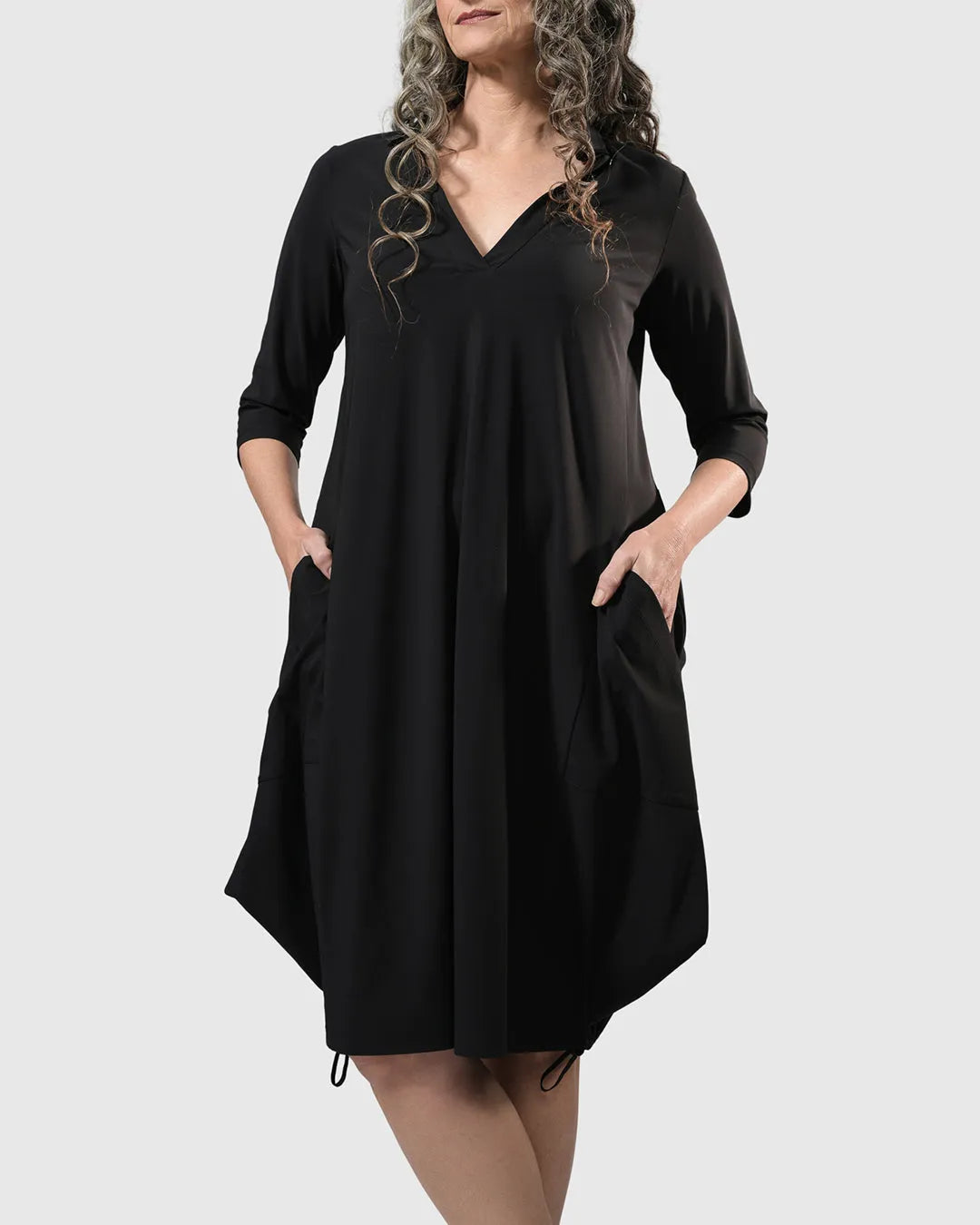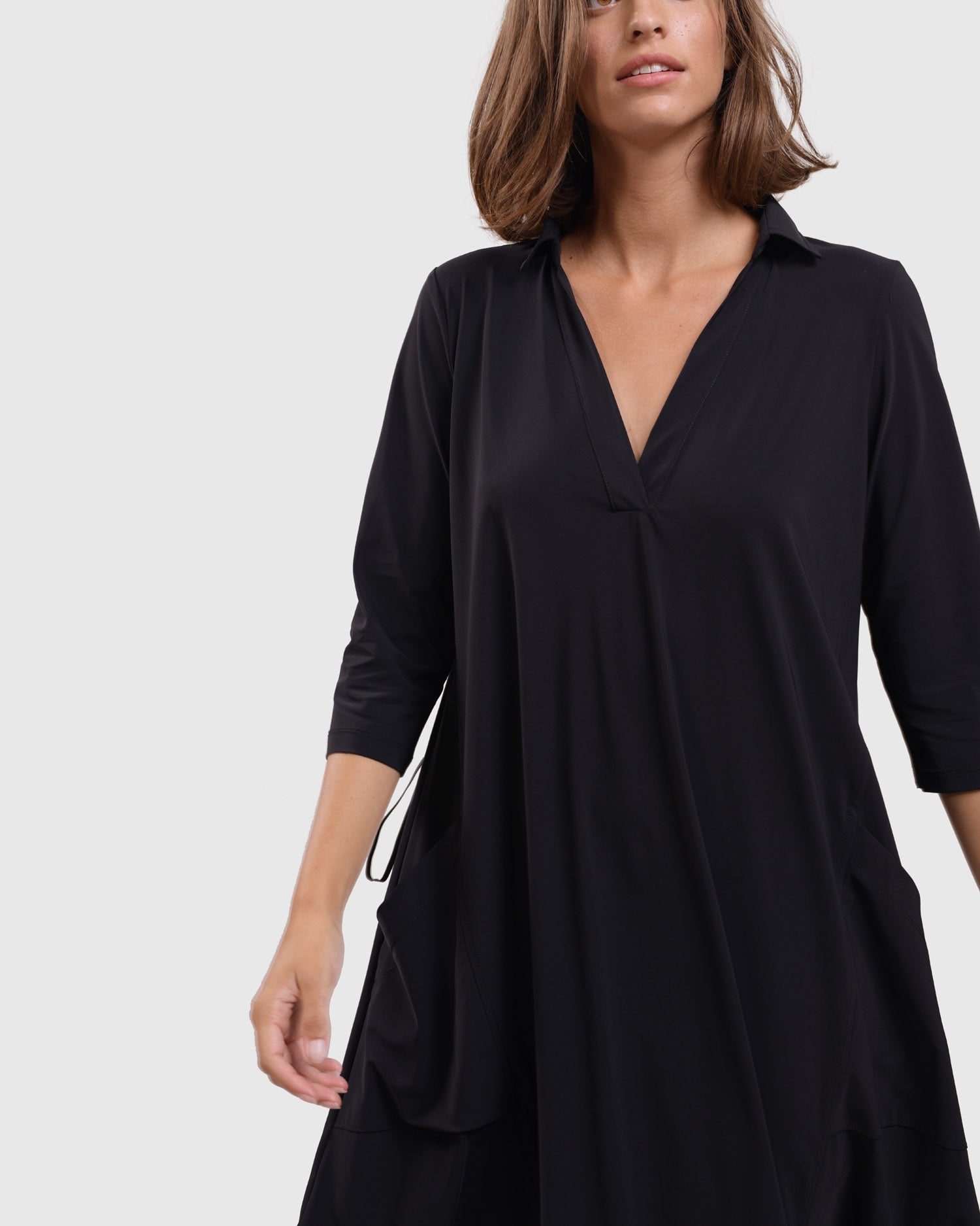 It's just one of those dresses—dependable wherever you wear it—with kicks or heels. Cut from our exclusive (and comfy!) TECHNO knit that wicks sweat, won't pill, resists wrinkles and travels well, too. Collared V-neck pullover with three-quarter sleeves, signature draped pockets, elastic drawstring pulls at the architectural hem and back of dress for a touch of creative edge.