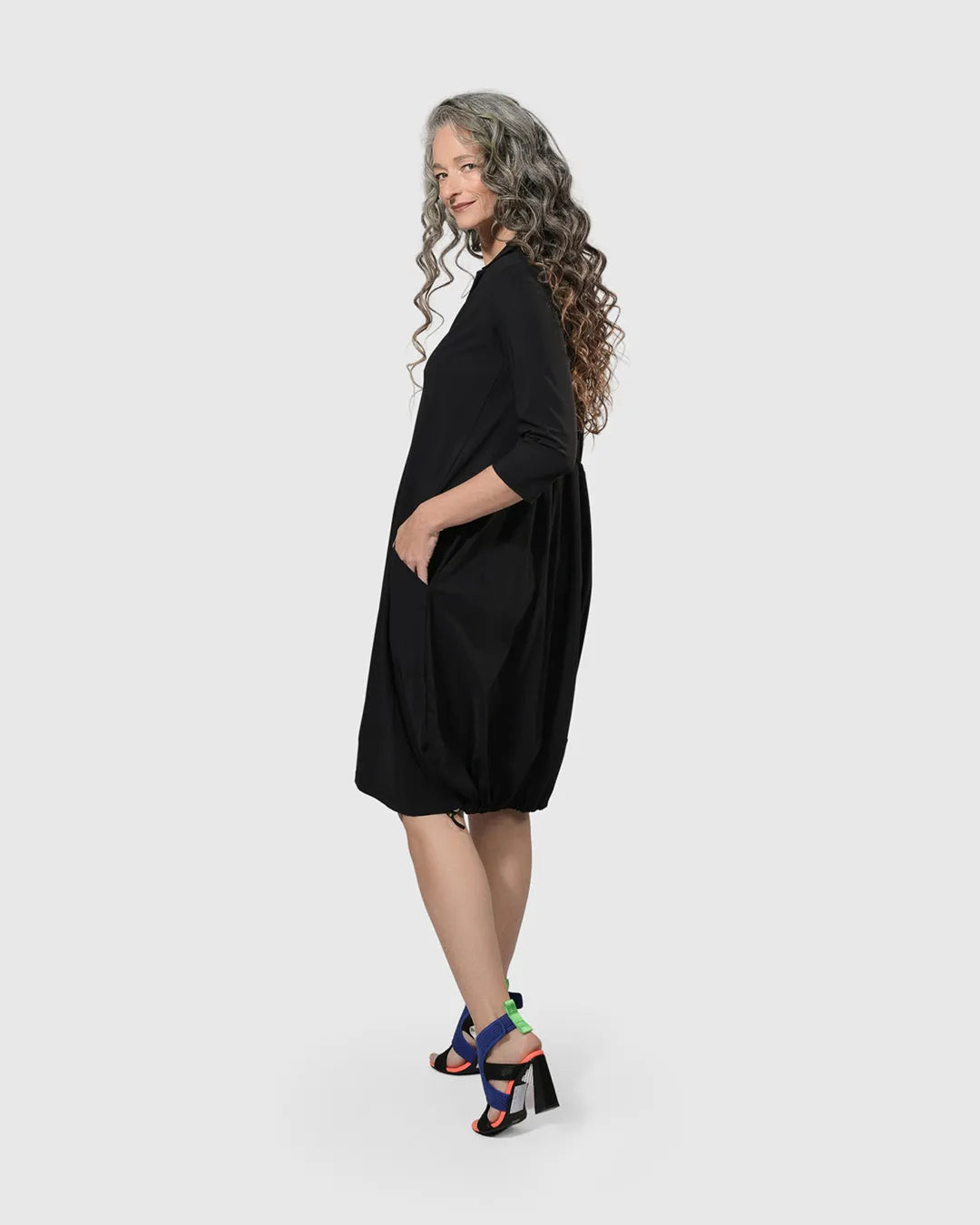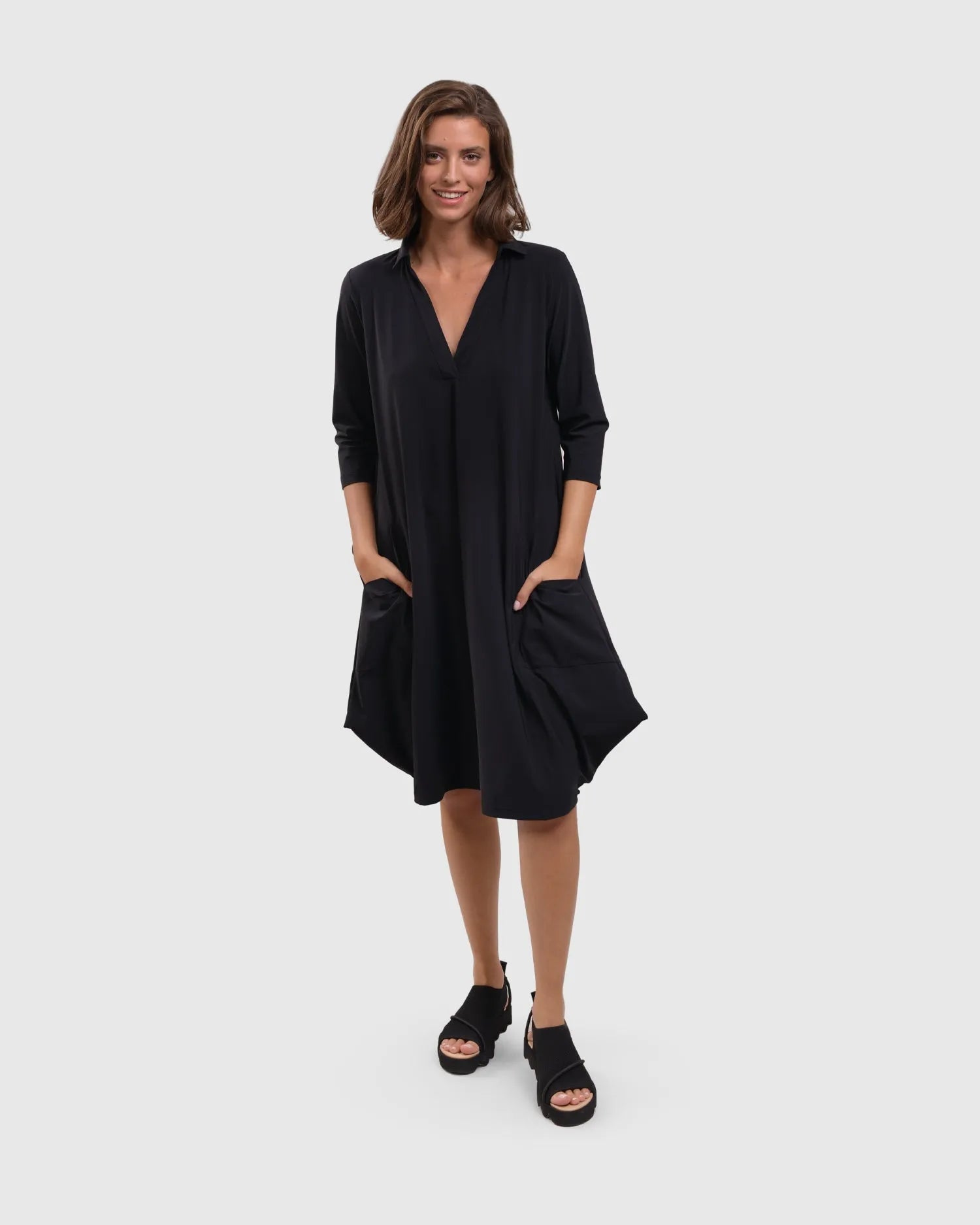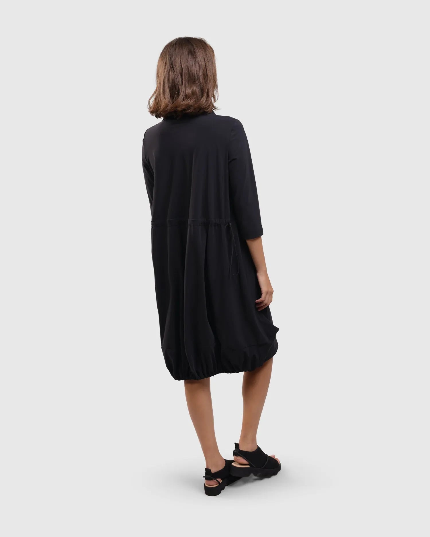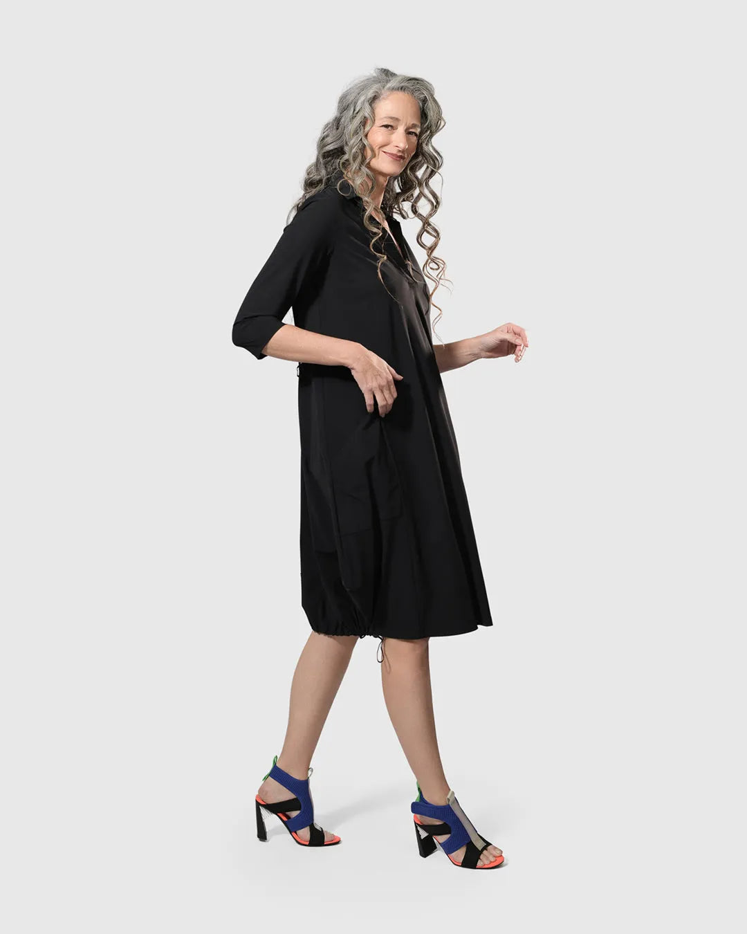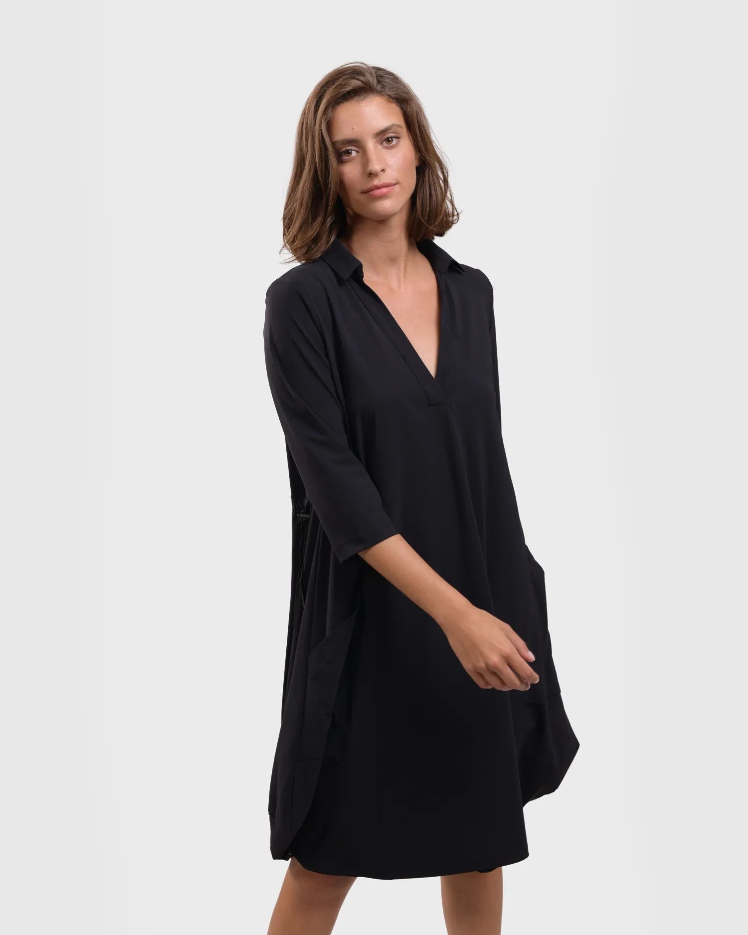 It's just one of those dresses—dependable wherever you wear it—with kicks or heels. Cut from our exclusive (and comfy!) TECHNO knit that wicks sweat, won't pill, resists wrinkles and travels well, too. Collared V-neck pullover with three-quarter sleeves, signature draped pockets, elastic drawstring pulls at the architectural hem and back of dress for a touch of creative edge.