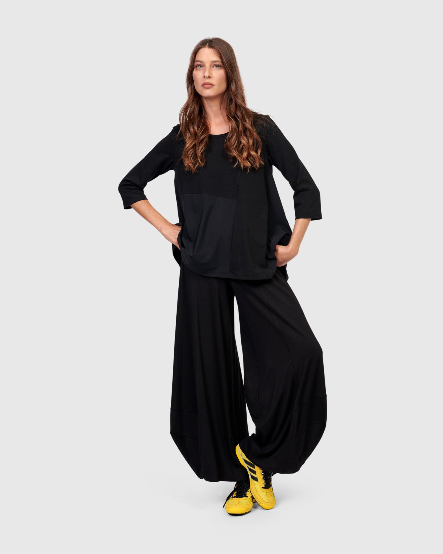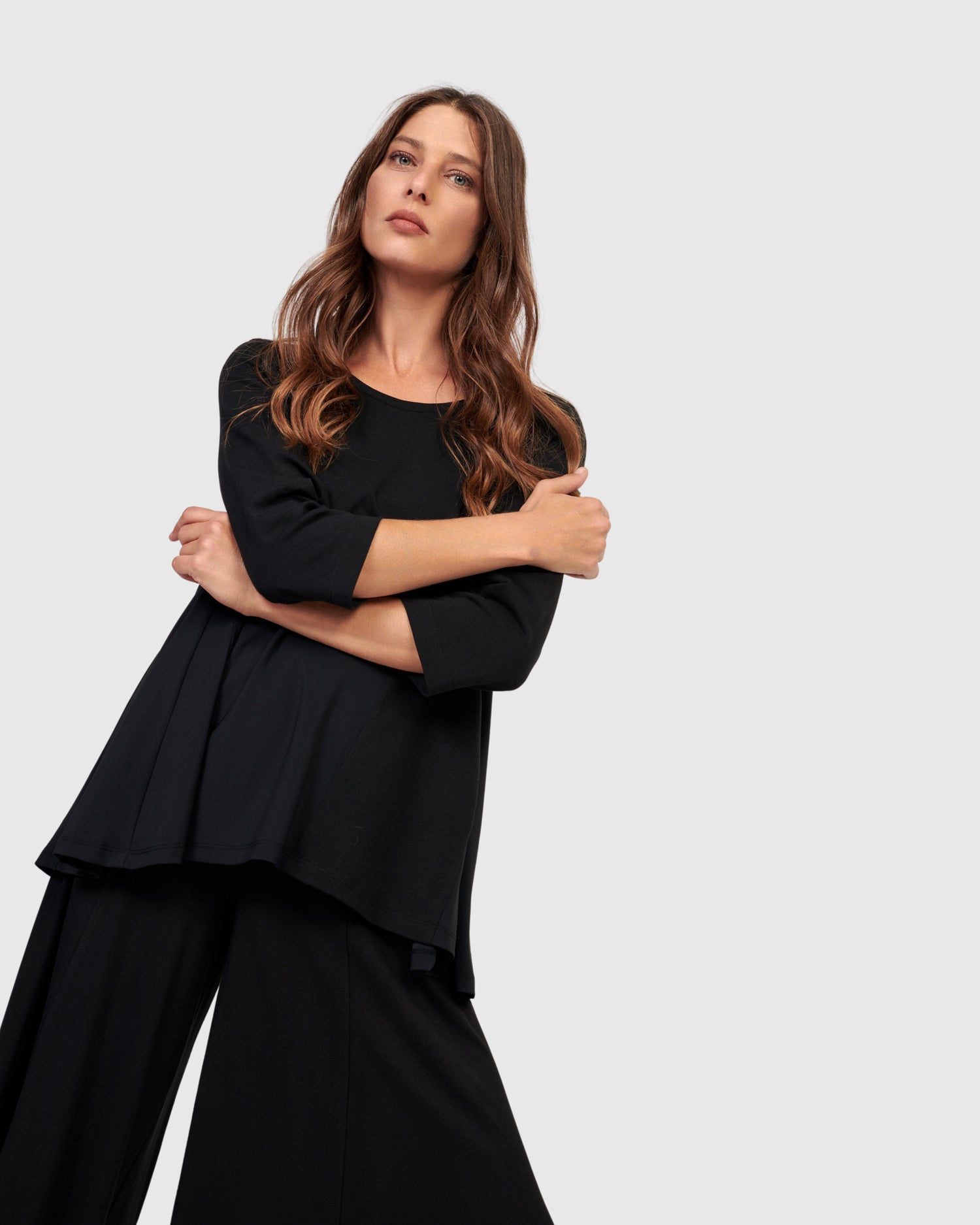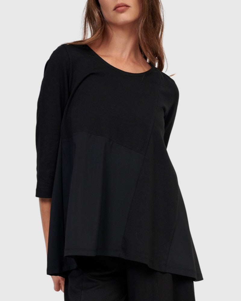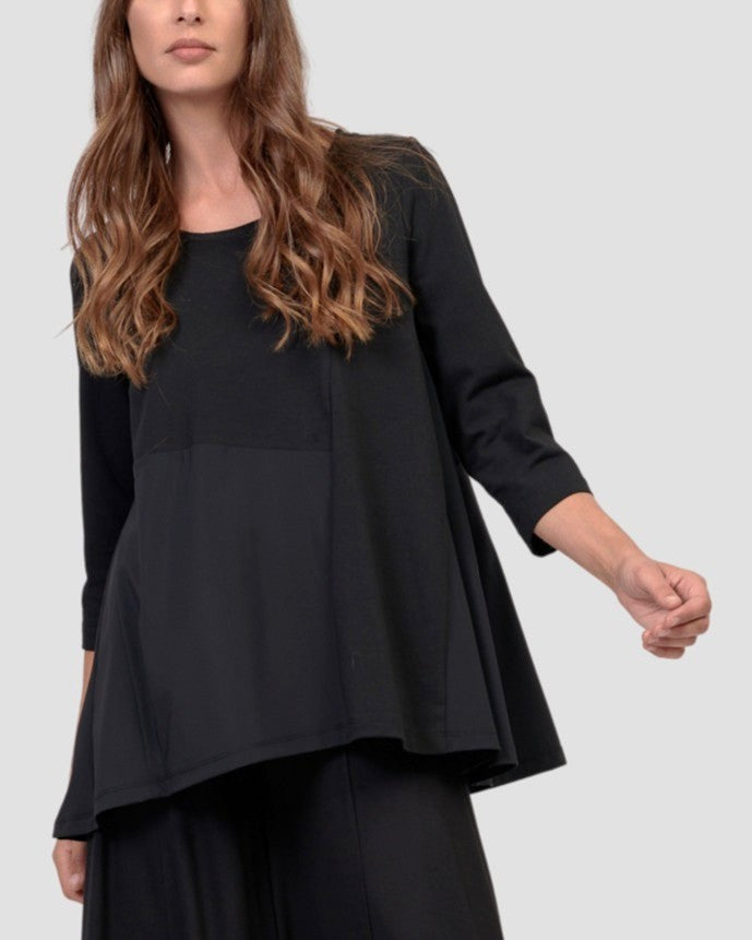 This relaxed pullover top has a crew neck, three quarter length sleeves, a swingy A-line silhouette and roomy fit from bust to hem. Made in a stretch jersey knit that's pieced with exclusive TECHNO fabric, it elevates your standard black basic.