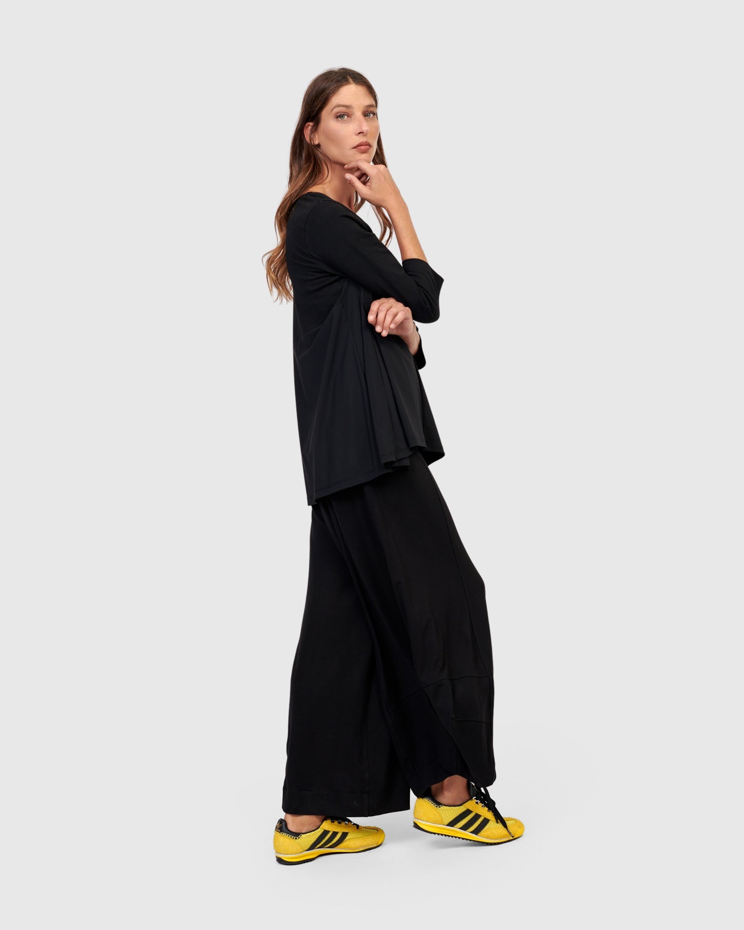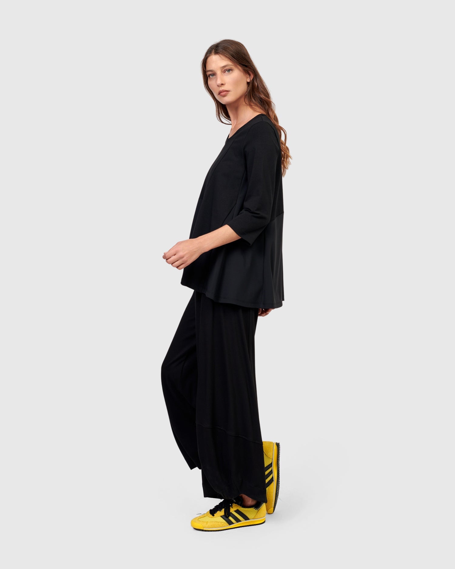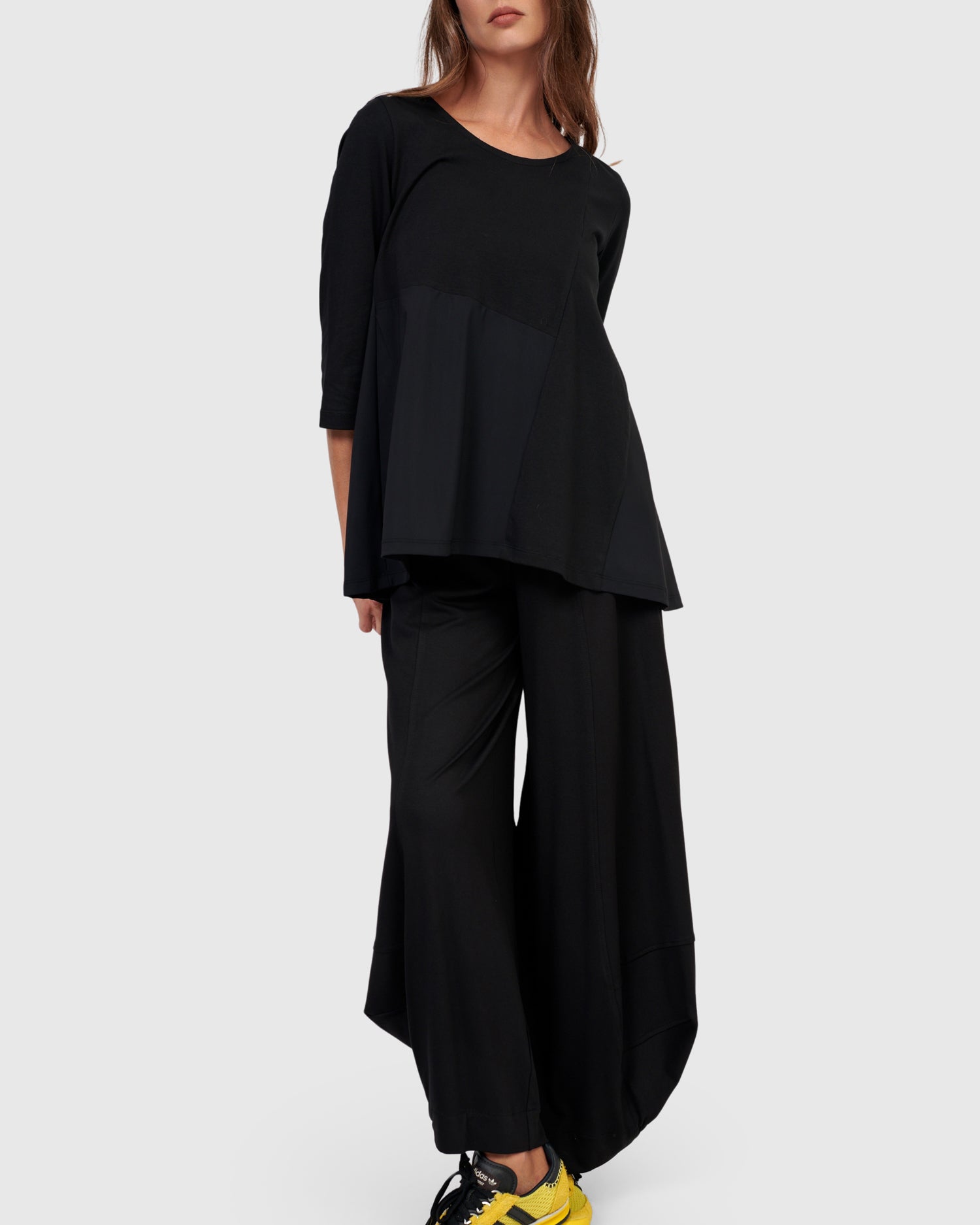 This relaxed pullover top has a crew neck, three quarter length sleeves, a swingy A-line silhouette and roomy fit from bust to hem. Made in a stretch jersey knit that's pieced with exclusive TECHNO fabric, it elevates your standard black basic.