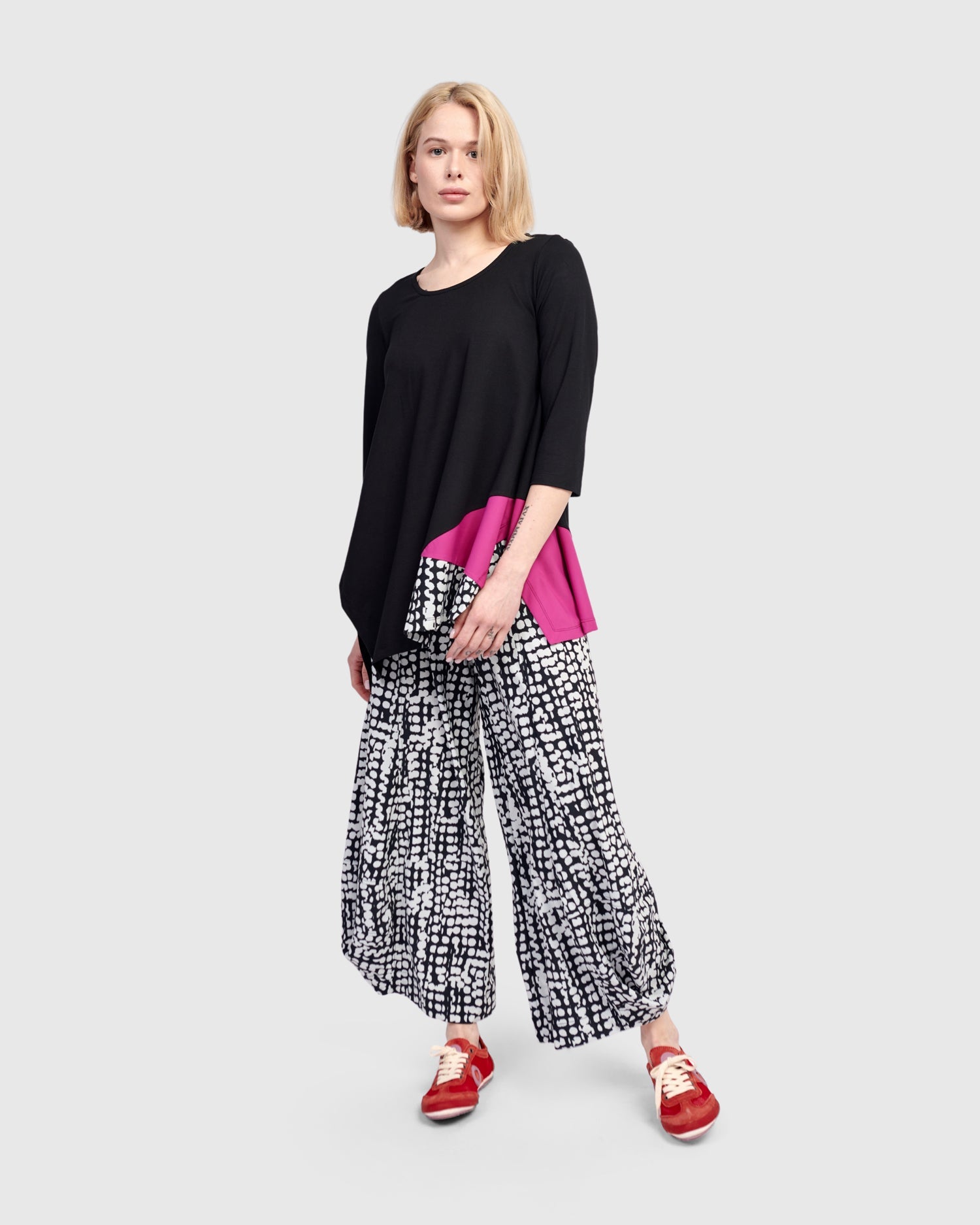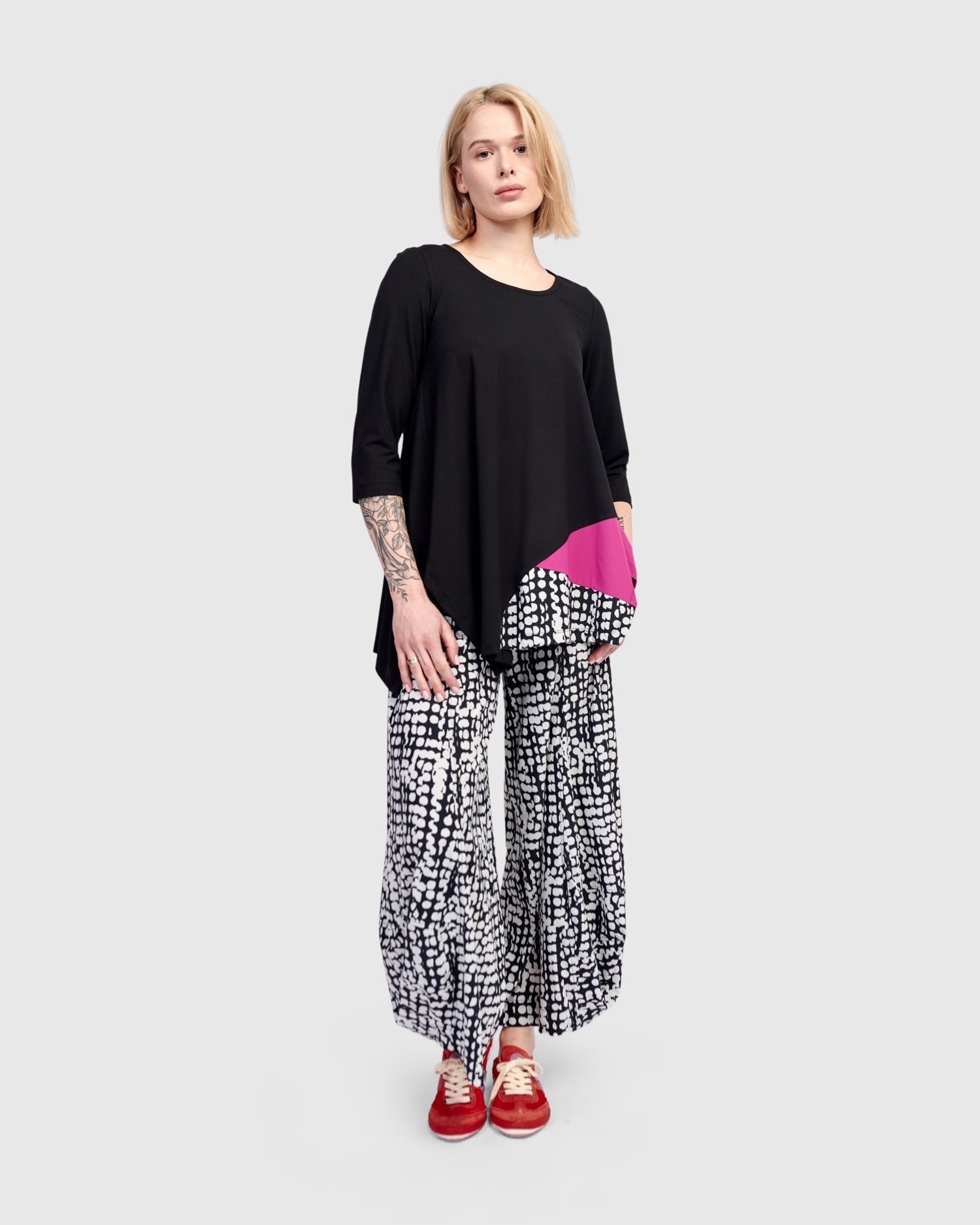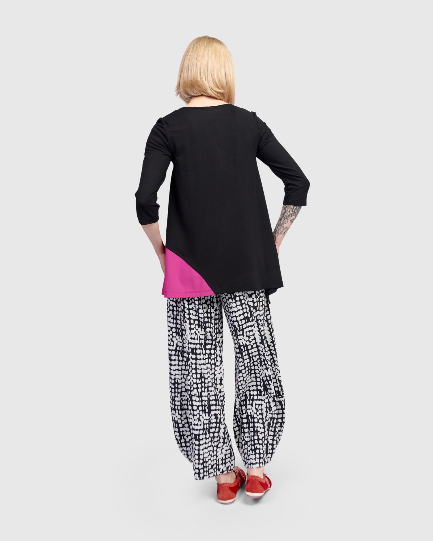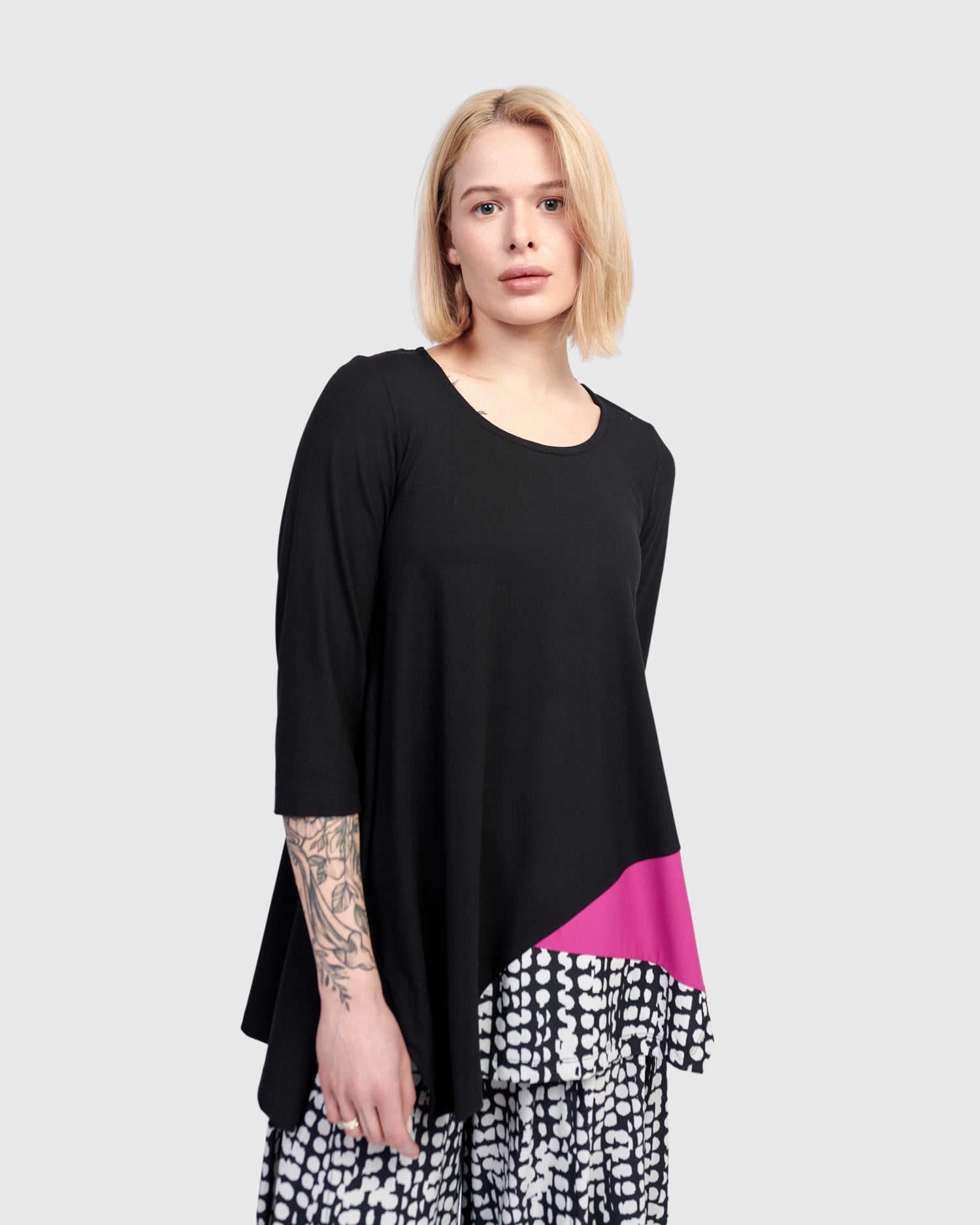 A pop of vivid pink and dots dance across this relaxed tunic top. Scoop neck, three quarter sleeves, asymmetric hem with side slits. It's perfectly flowy without being oversized, and made in a jersey knit with exclusive TECHNO detailing so you have plenty of options to style it with other Tekbika pieces or shop our jersey Essentials.