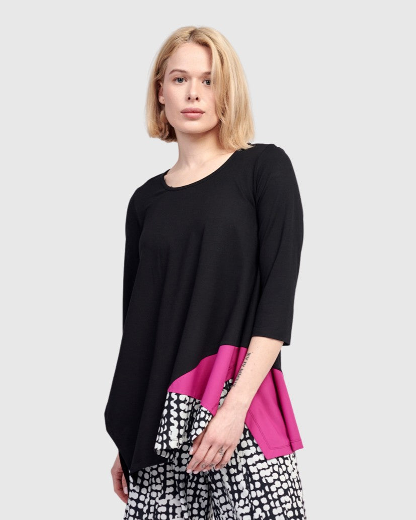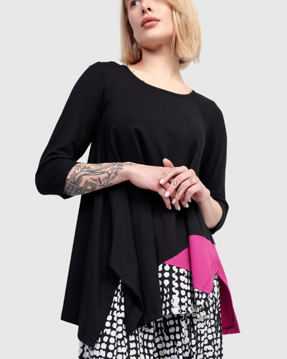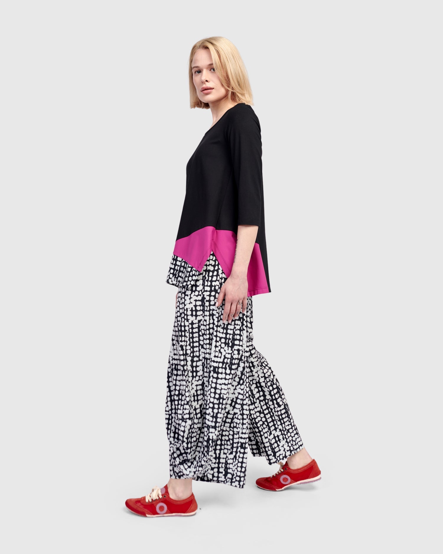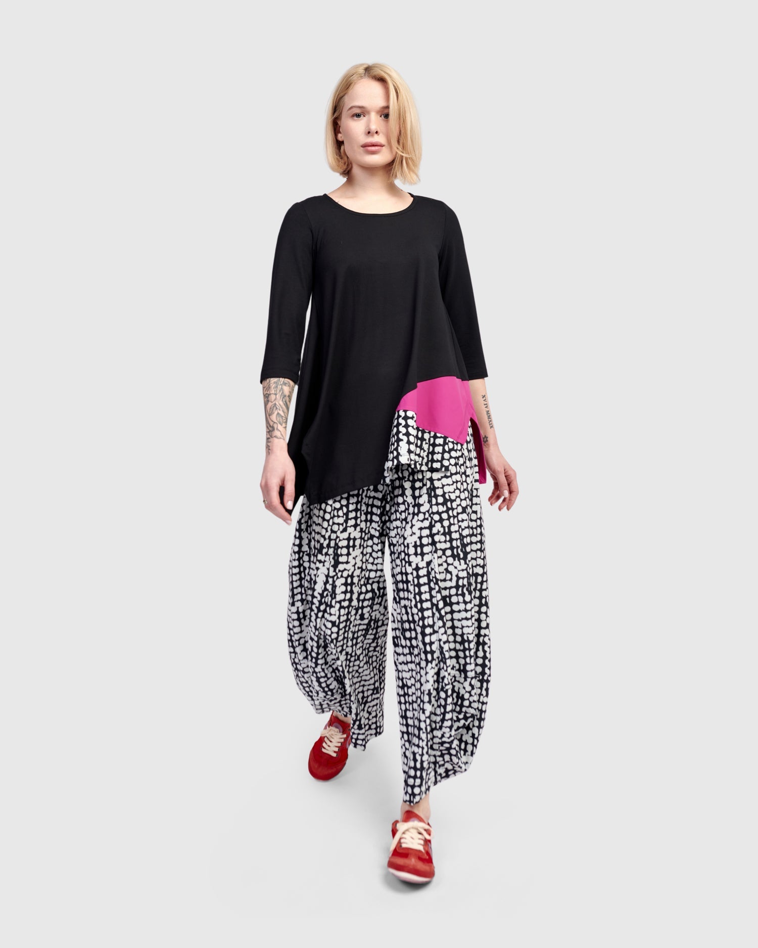 A pop of vivid pink and dots dance across this relaxed tunic top. Scoop neck, three quarter sleeves, asymmetric hem with side slits. It's perfectly flowy without being oversized, and made in a jersey knit with exclusive TECHNO detailing so you have plenty of options to style it with other Tekbika pieces or shop our jersey Essentials.