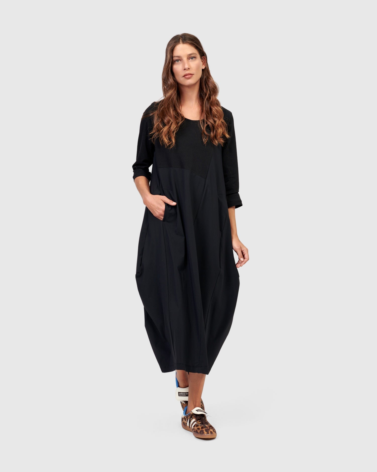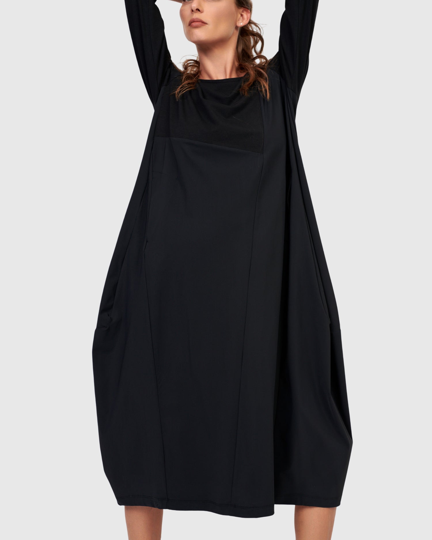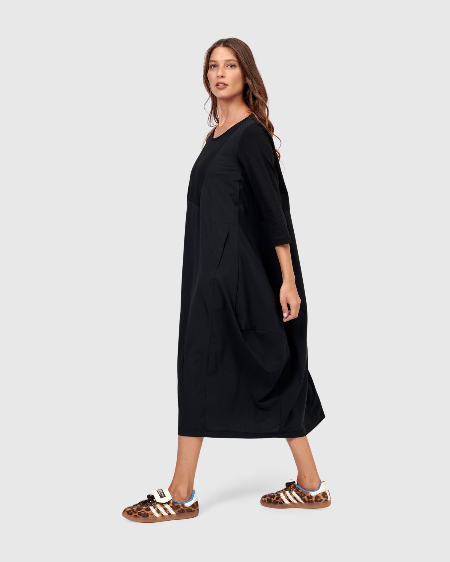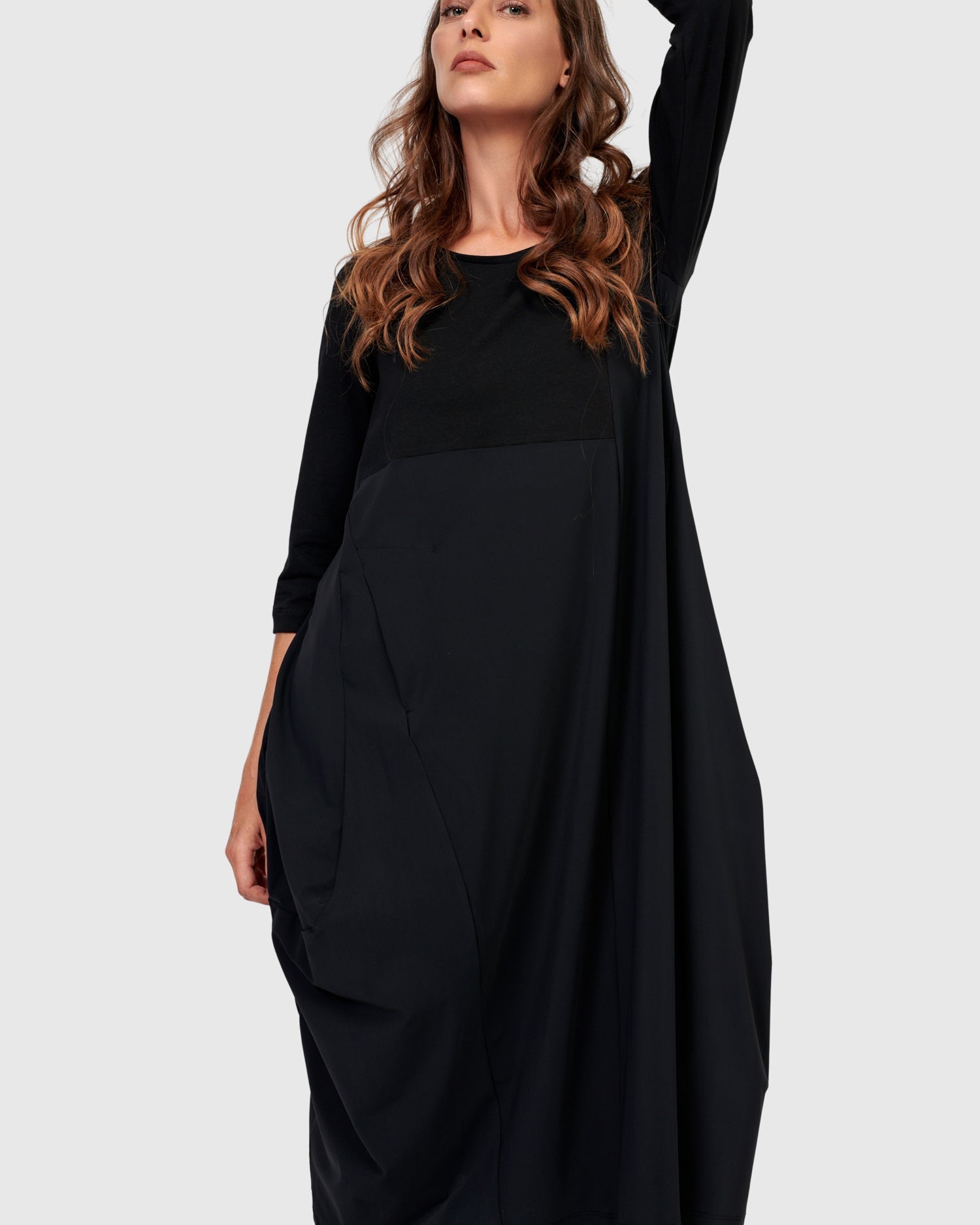 Say hello to the newest Little Black Dress! Crew neck, three quarter length sleeves, on-seam front pockets, midi length, with a related fit that skims the bust and tapers out from pit to hem. Our signature cocoon skirting is asymmetrically pieced with exclusive TECHNO fabric, adding subtle intrigue to this closet staple. The stretch jersey knit bodice and sleeves make this dress so comfortable yet effortlessly stylish. Relaxed fit from bust to hem.