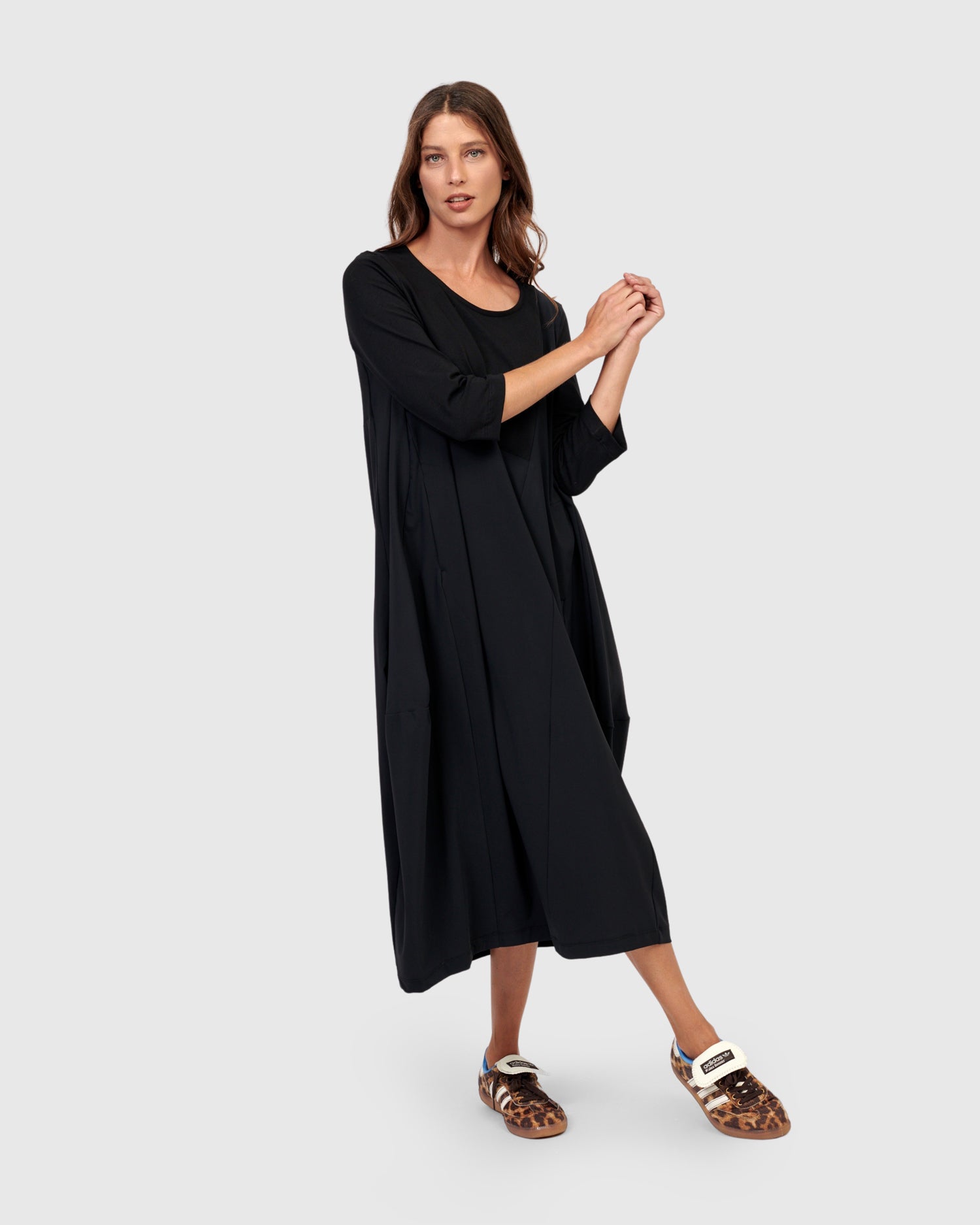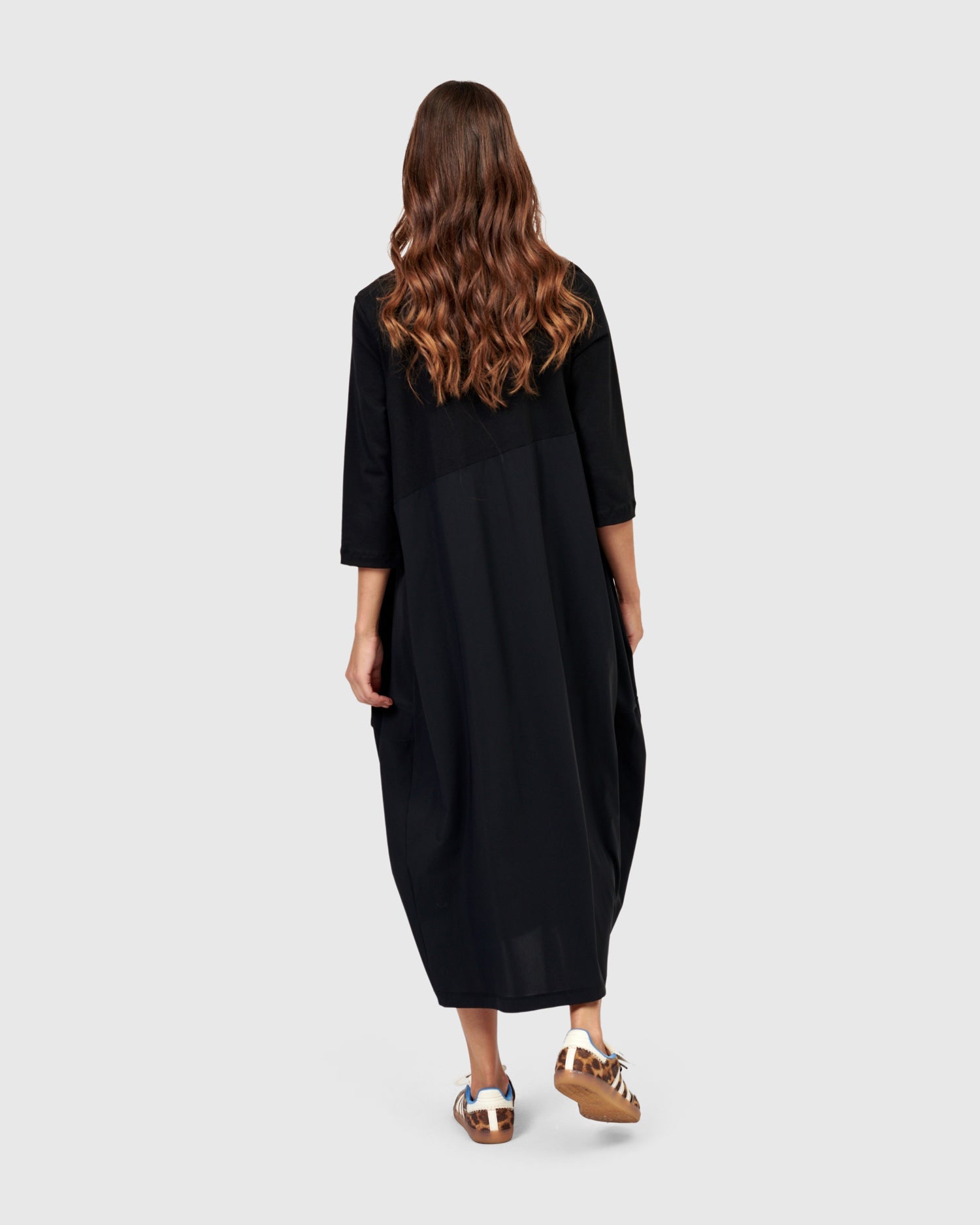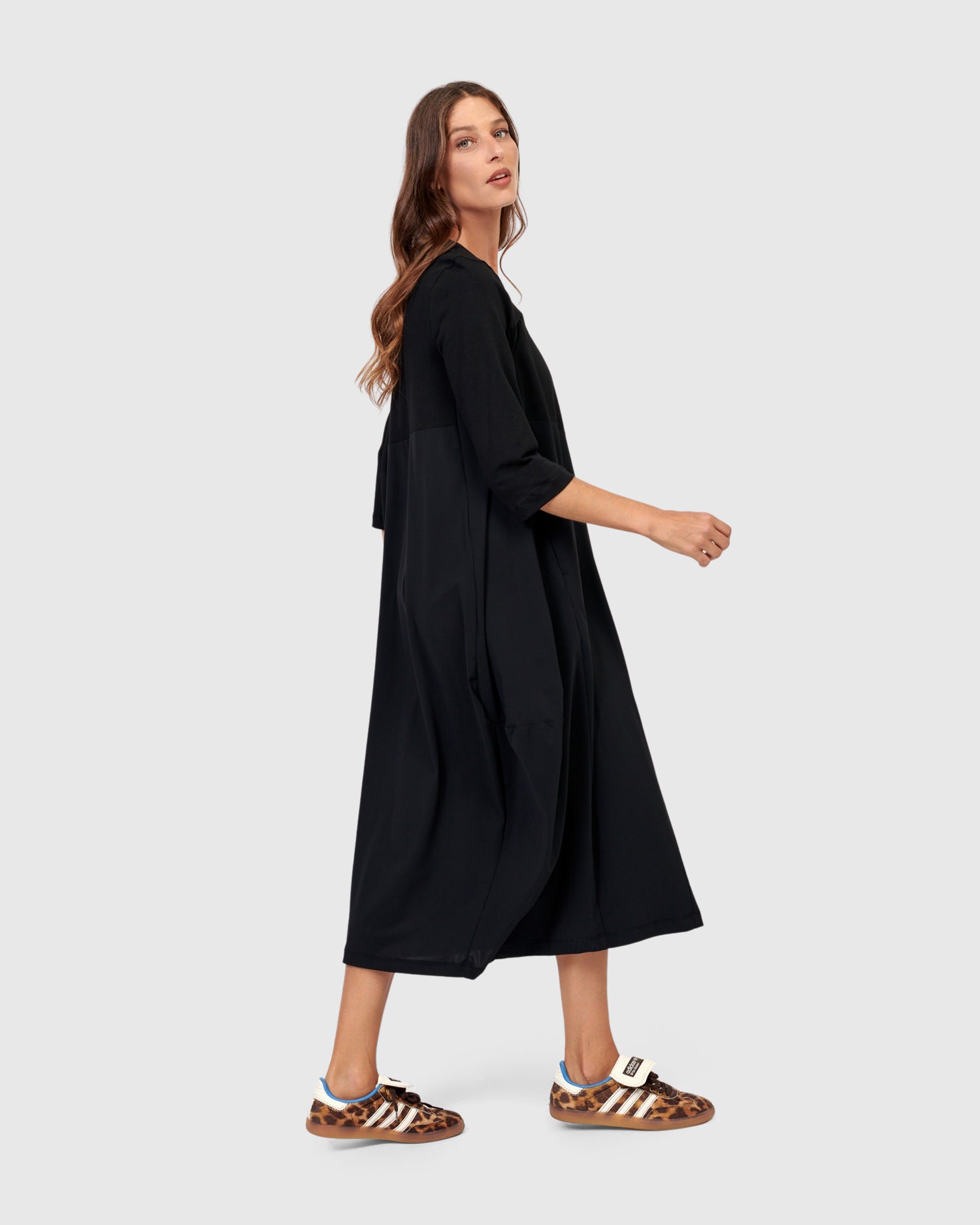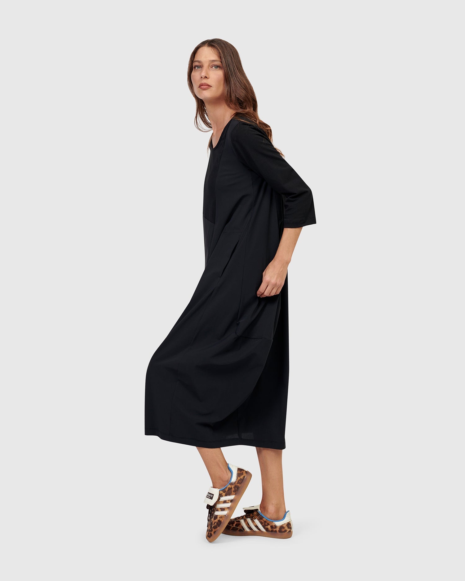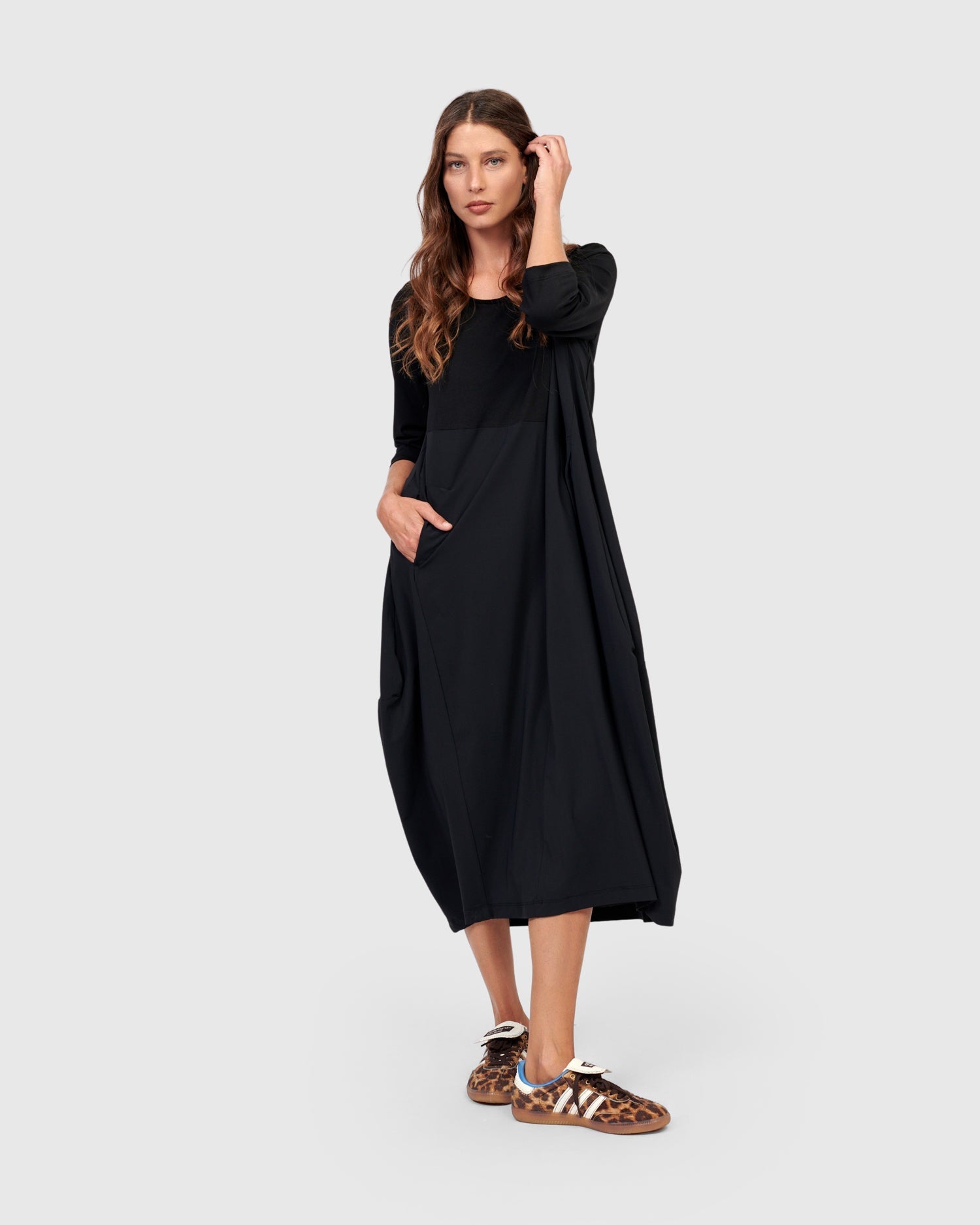 Say hello to the newest Little Black Dress! Crew neck, three quarter length sleeves, on-seam front pockets, midi length, with a related fit that skims the bust and tapers out from pit to hem. Our signature cocoon skirting is asymmetrically pieced with exclusive TECHNO fabric, adding subtle intrigue to this closet staple. The stretch jersey knit bodice and sleeves make this dress so comfortable yet effortlessly stylish. Relaxed fit from bust to hem.