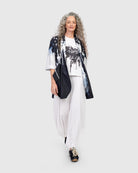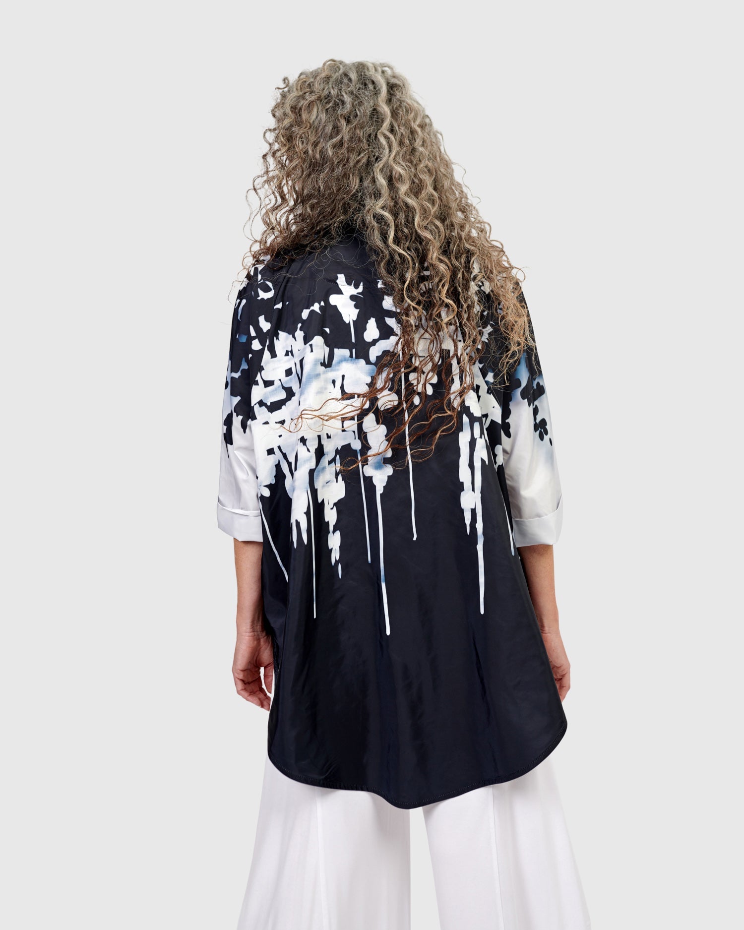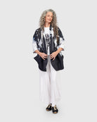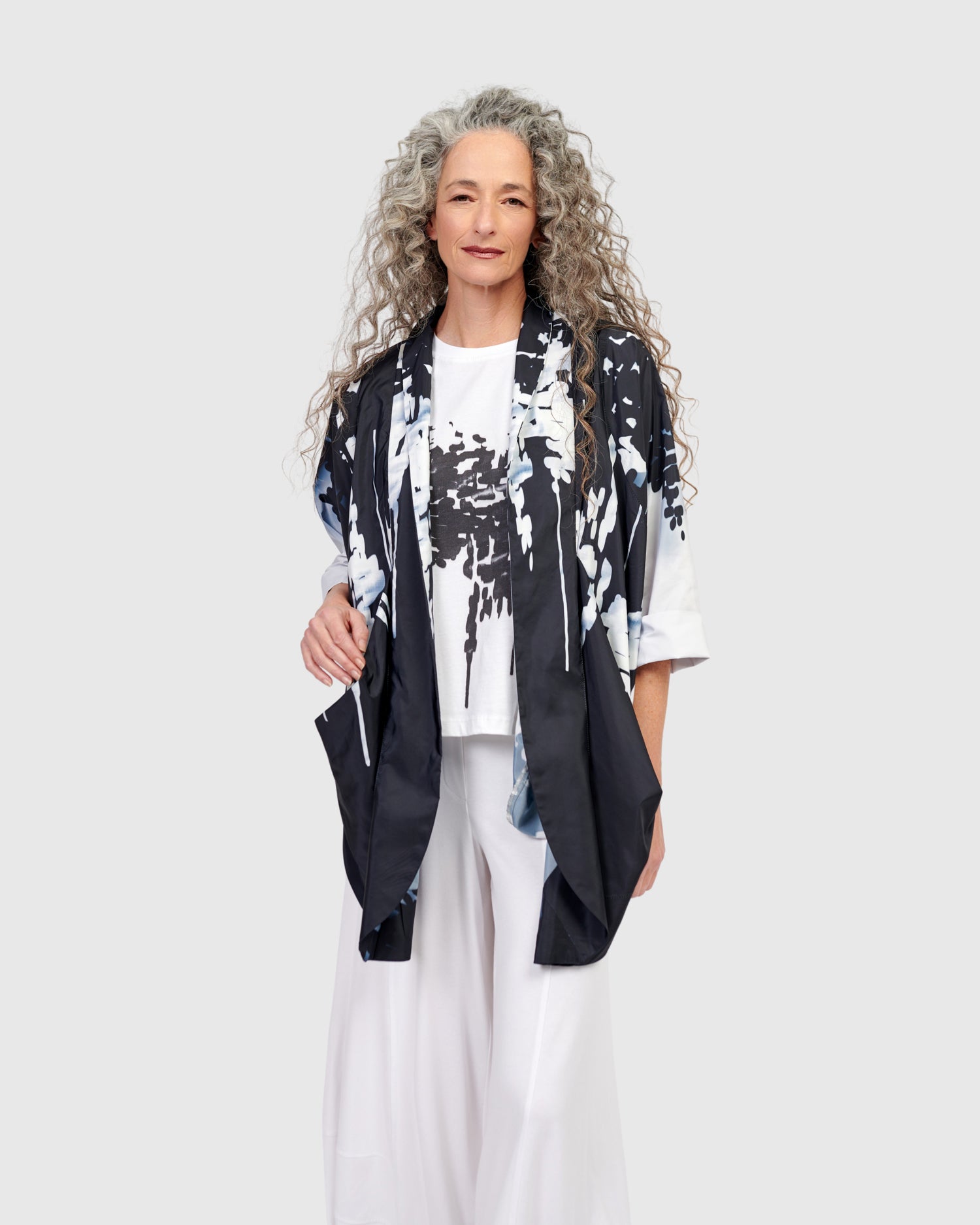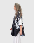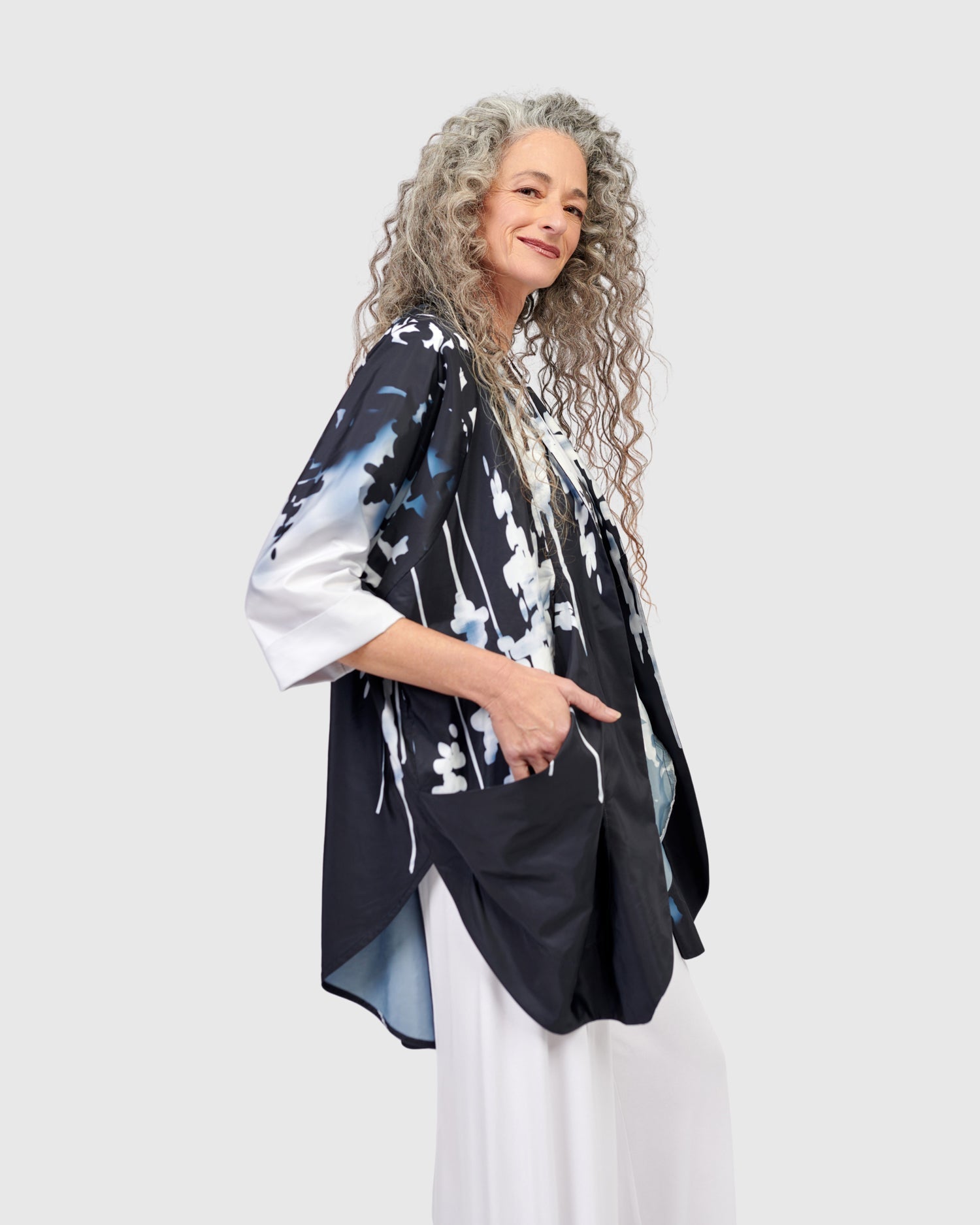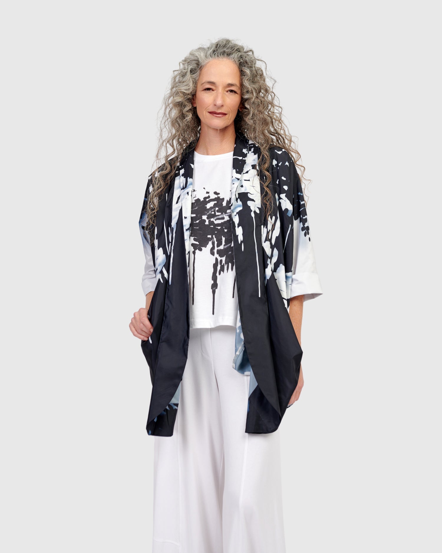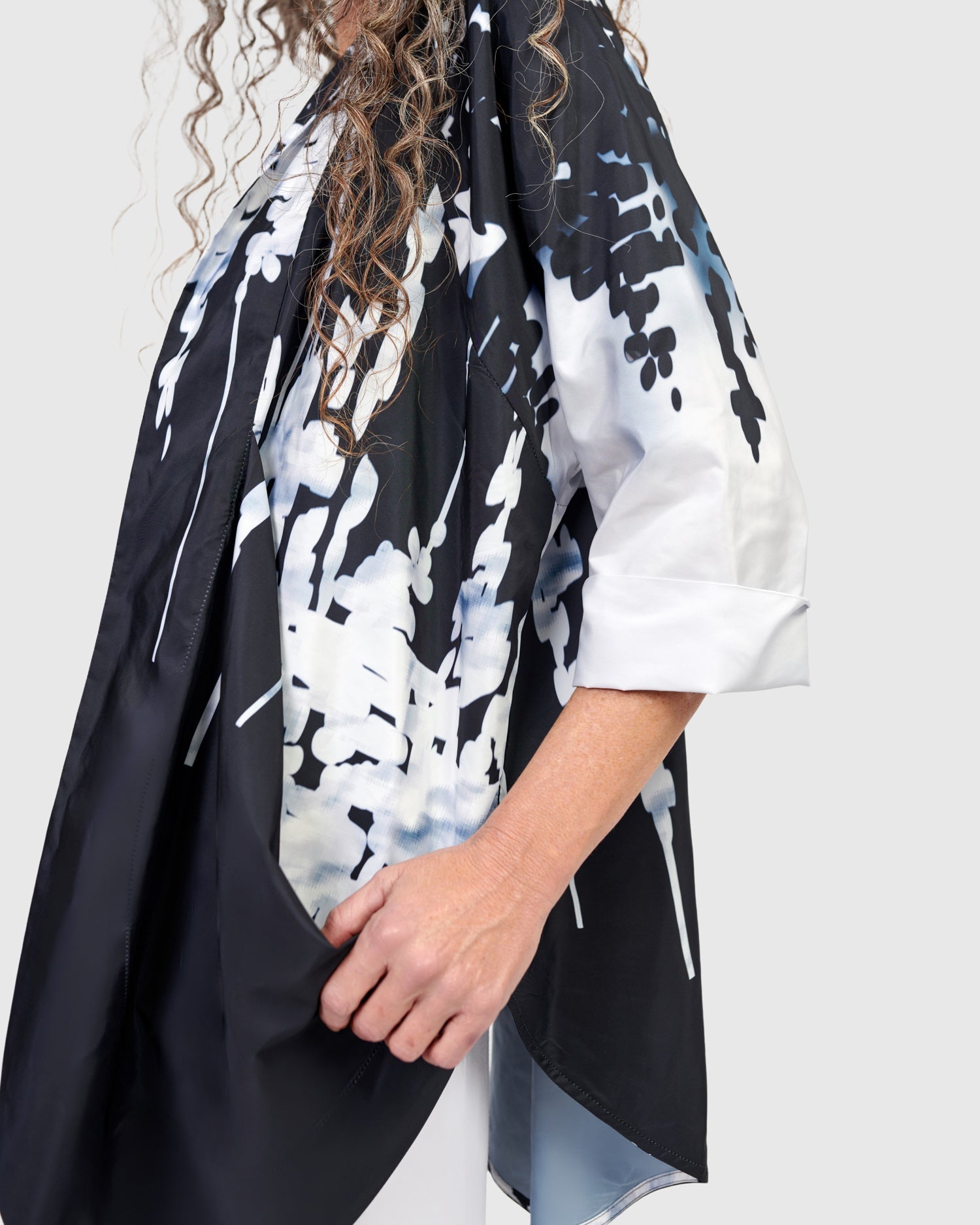 This sporty circle jacket has a round, oversized fit, open front lapels, and is made in a swishy woven fabric. Details: wide three-quarter length sleeves, draped front pockets, and a curved shirttail hem. This perfect third piece offers a relaxed and flowy silhouette for plenty of layering opportunities.