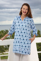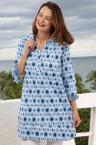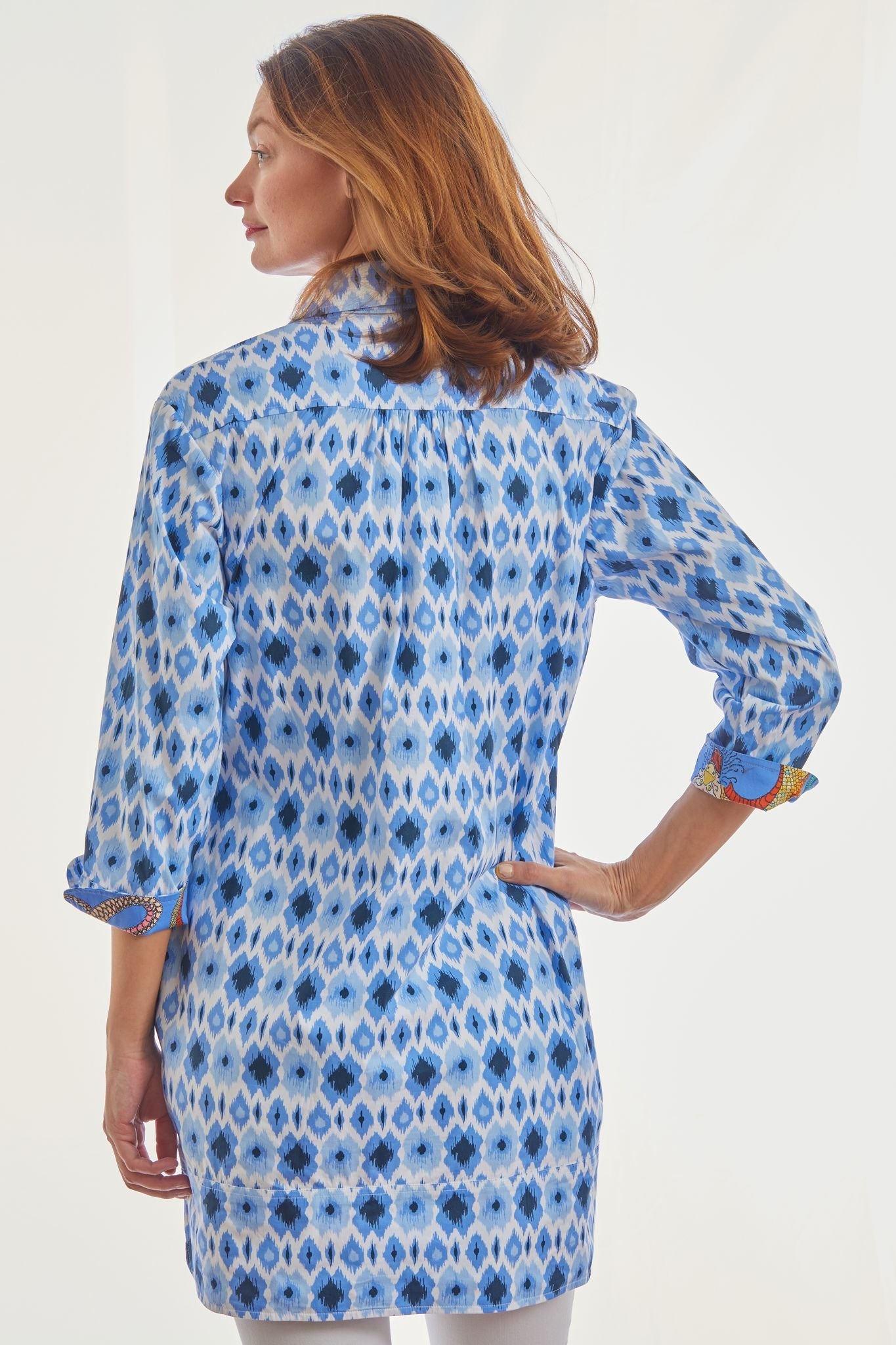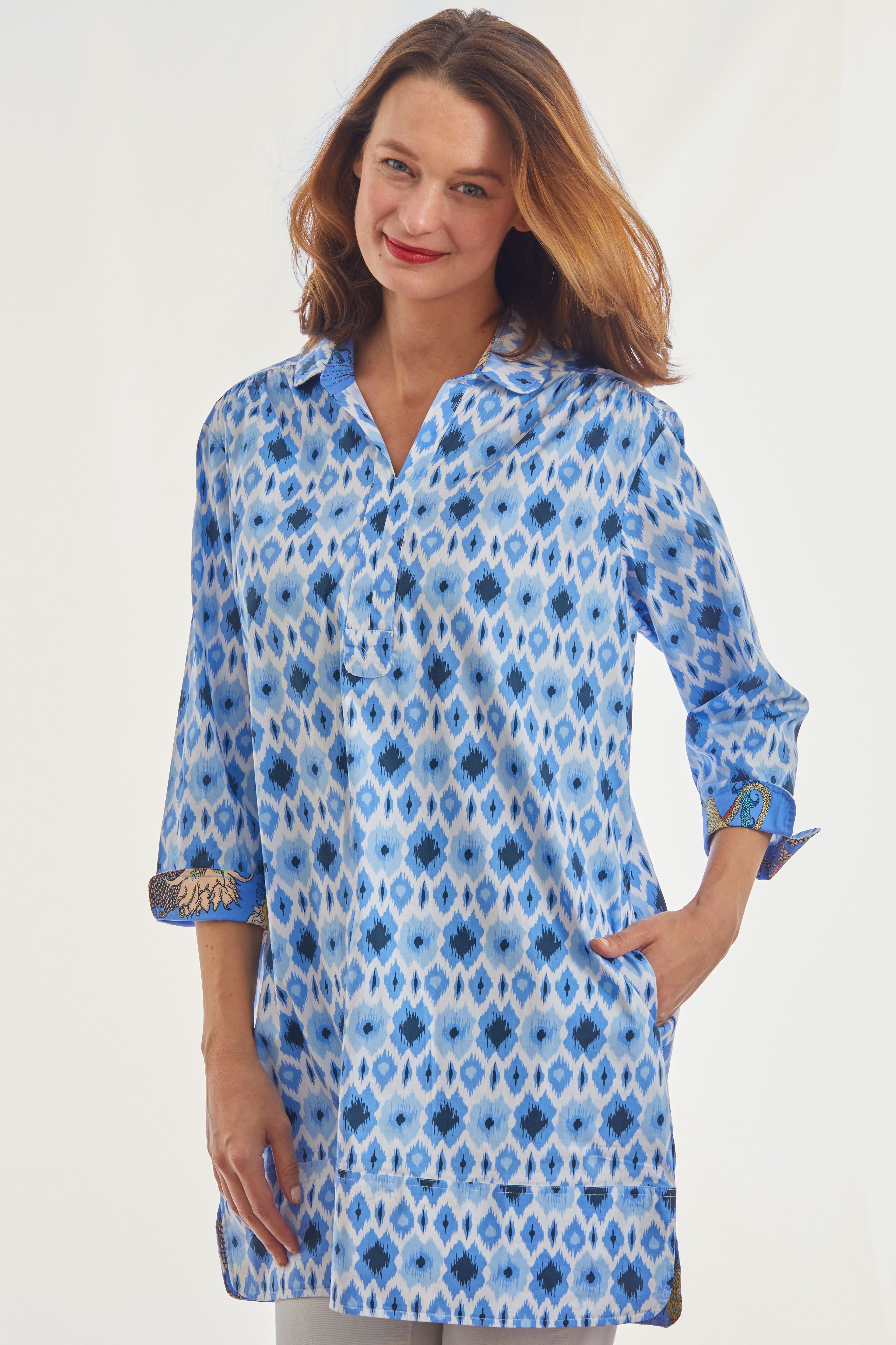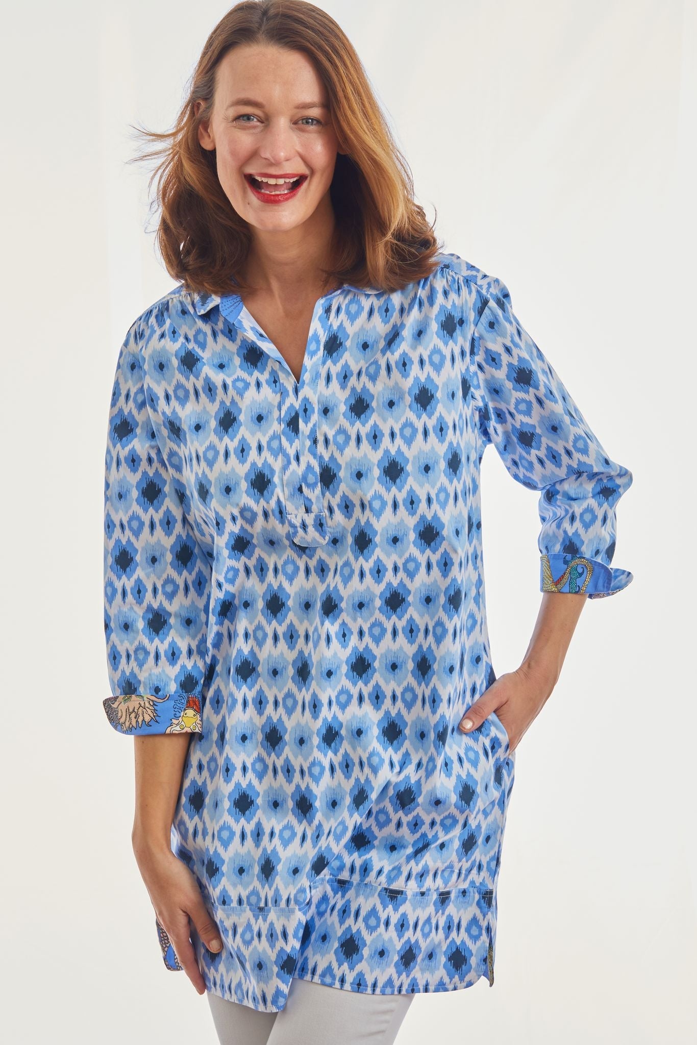 Introducing our Vail Tunic in Blue Ikat Print, a stunning example of elegance in shirt design. Made from cotton, it offers a comfortable and flattering fit. This piece is a must-have for those who value both style and comfort.